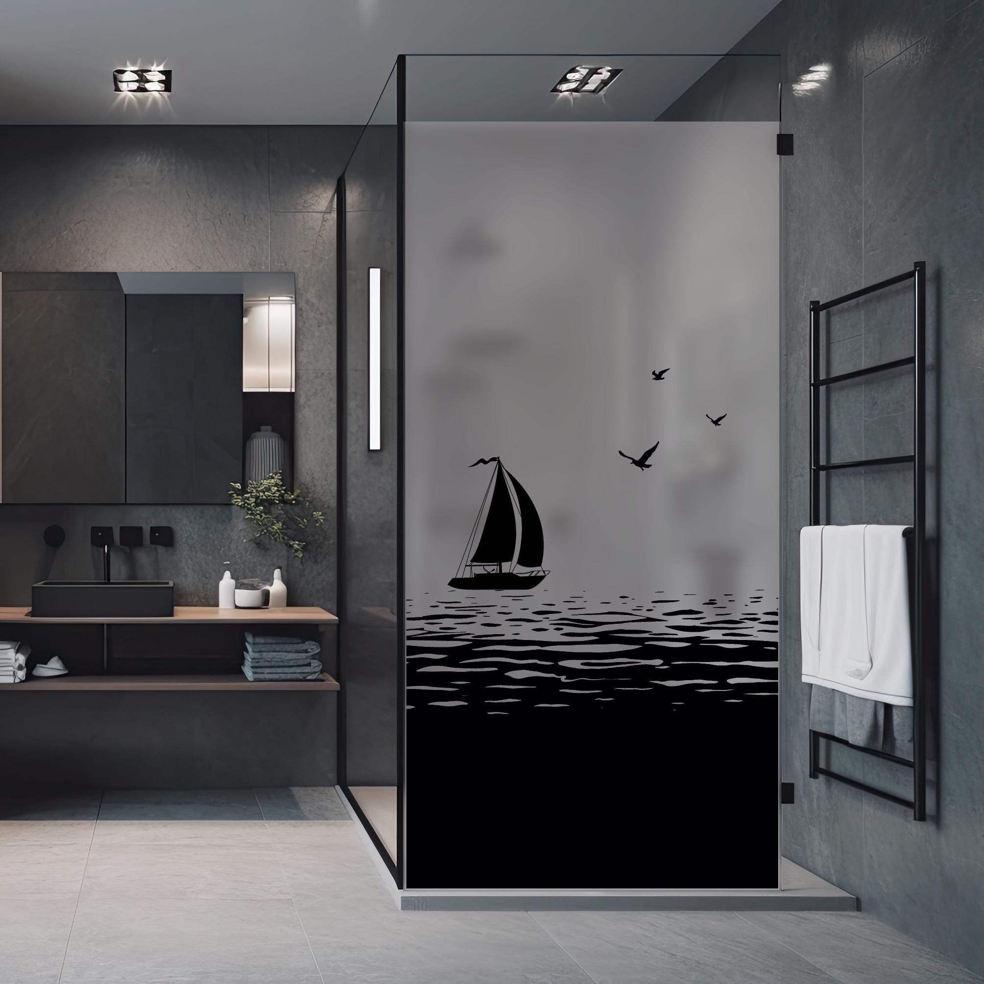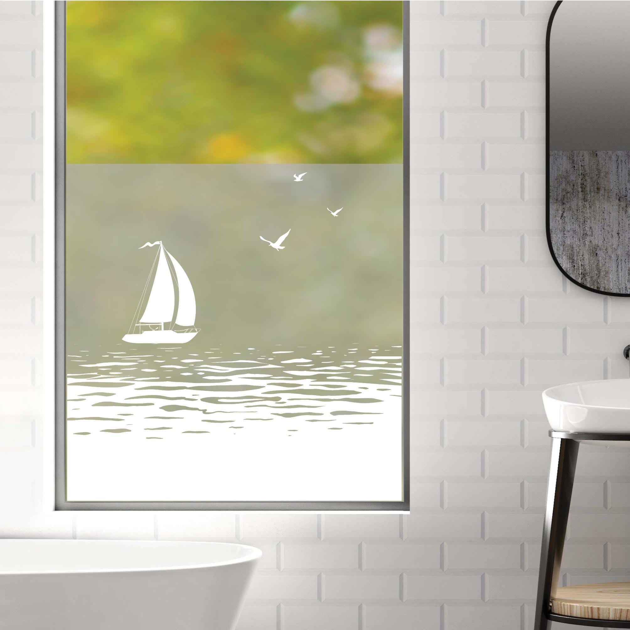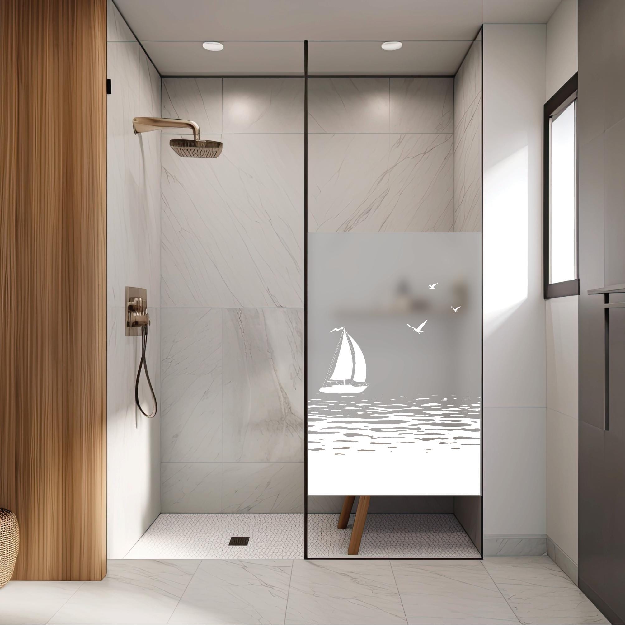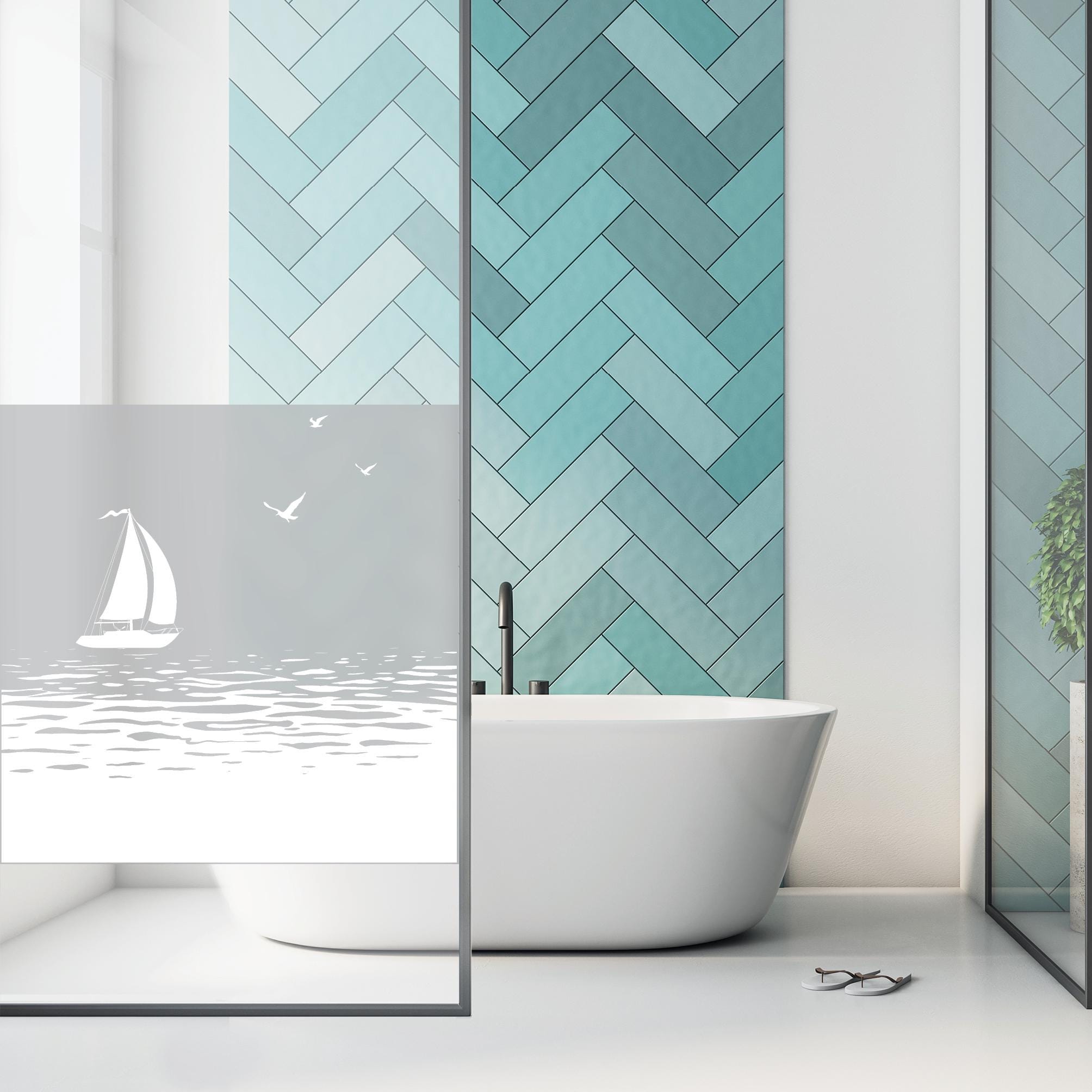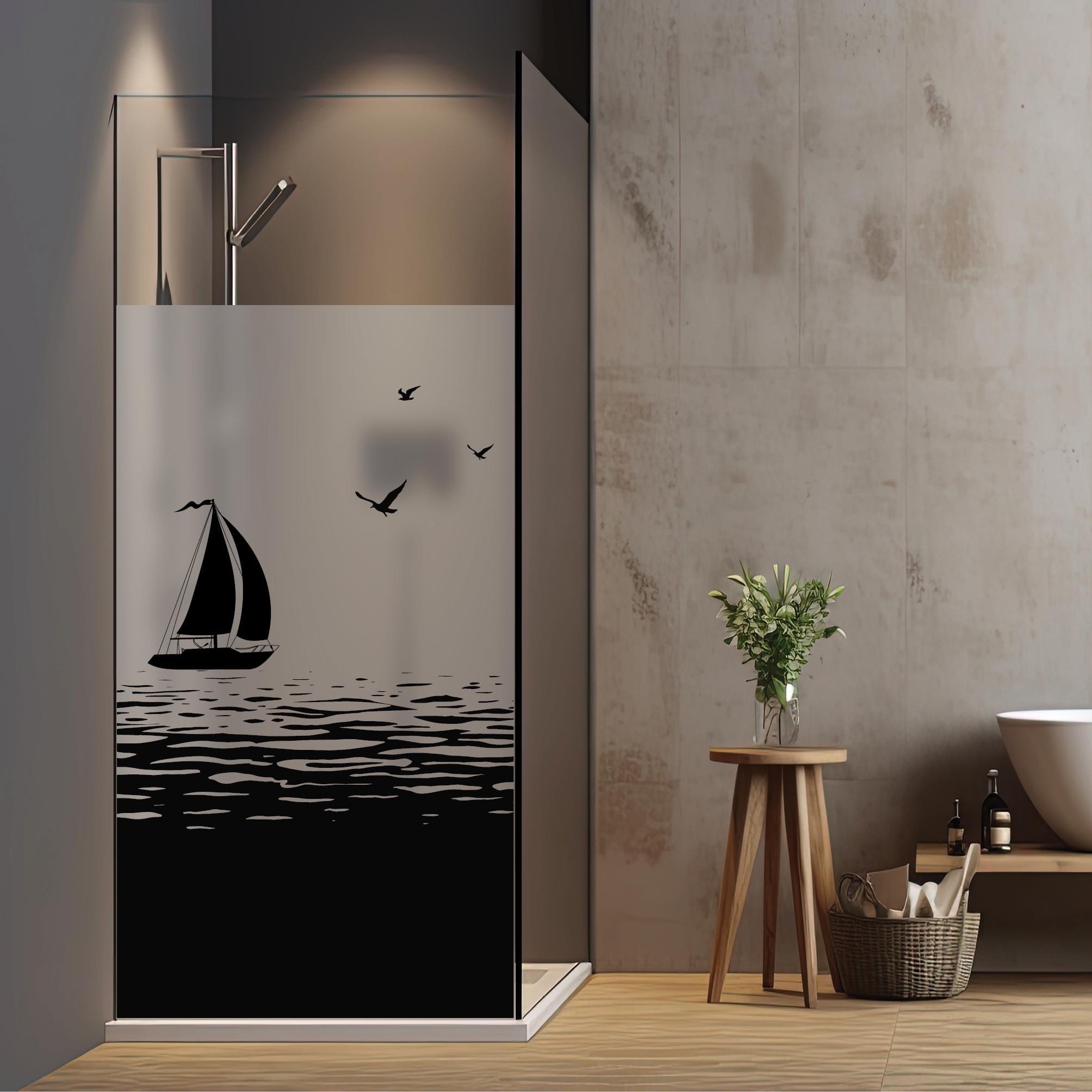 Sichtschutzfolie Duschkabine Segelboot Meer Möwen maritime Fensterfolie Dusche Duschglastür Duschwand schwarz oder weiß Milchglasfolie beidseitig