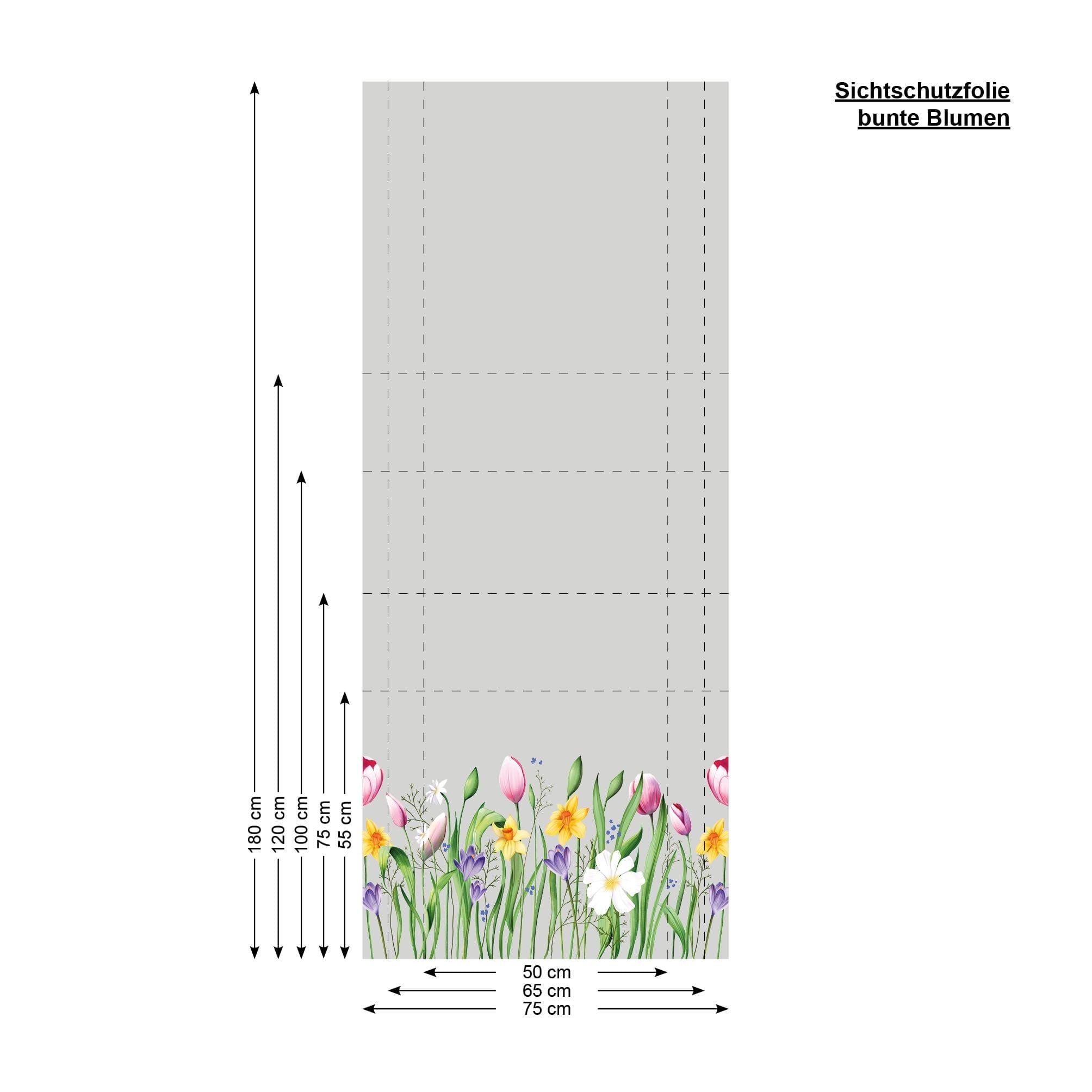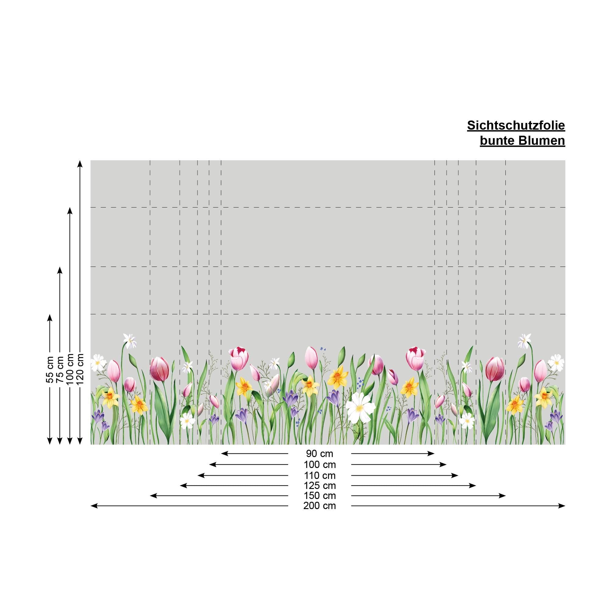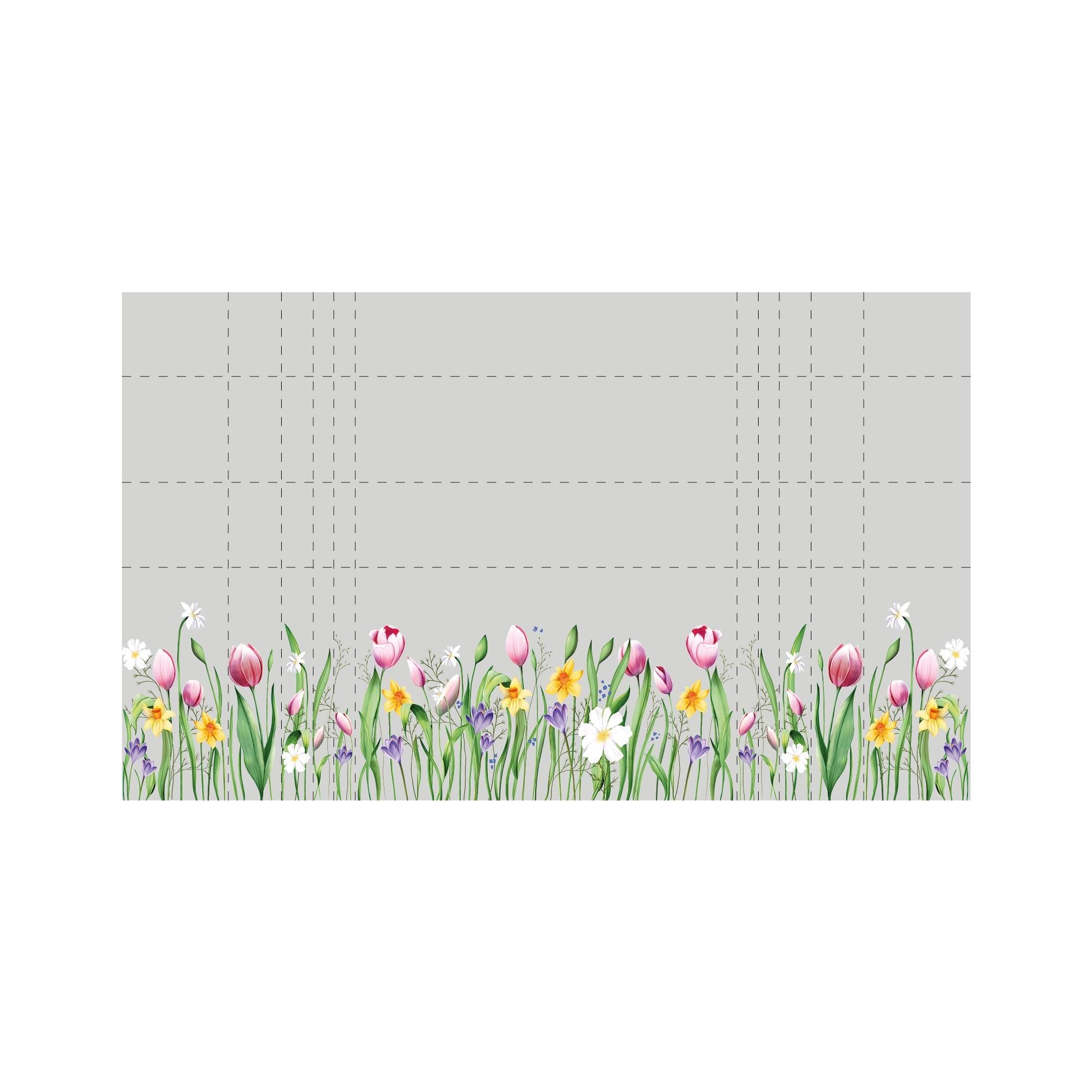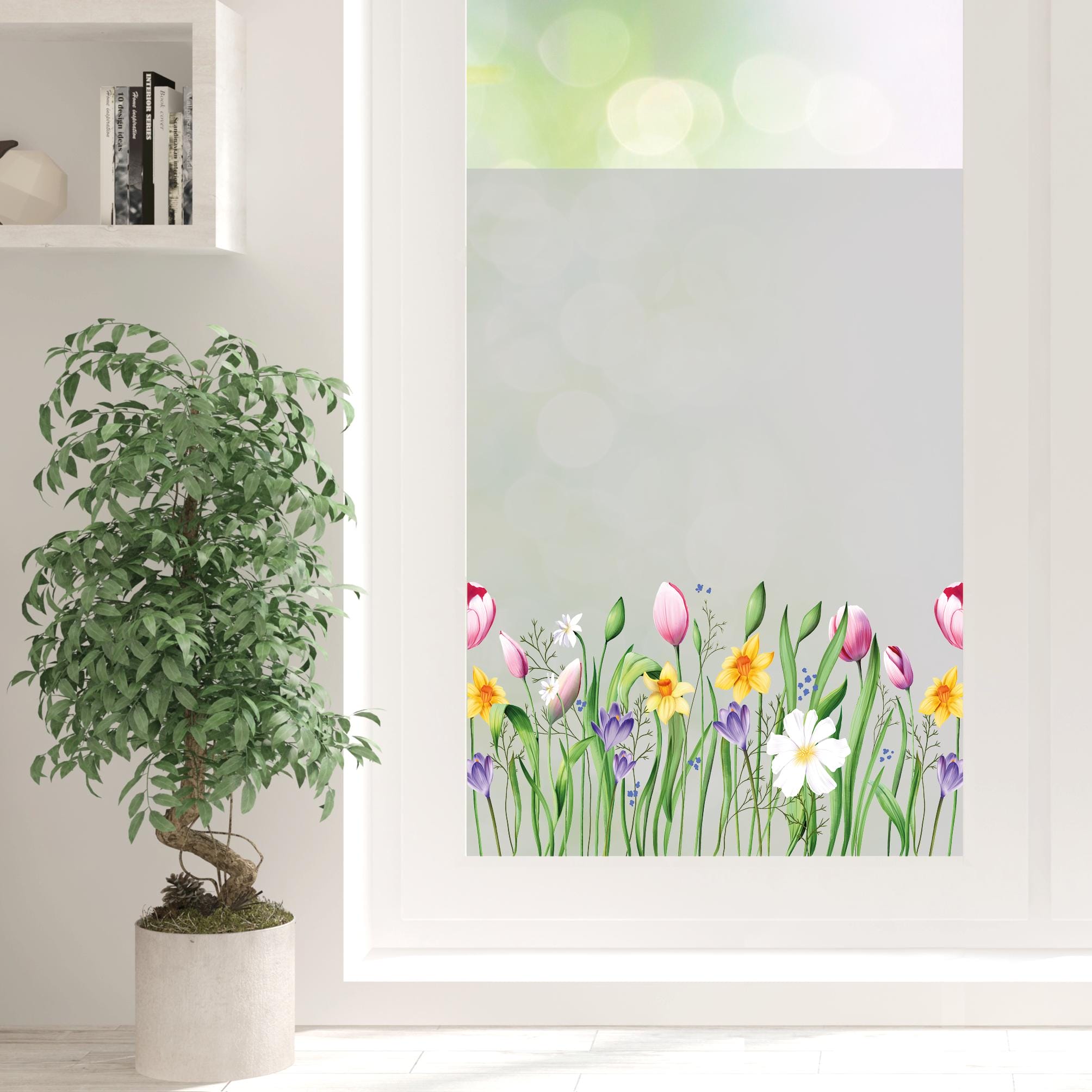 Auf dem Bild ist das Produkt: Sichtschutzfolie Frühlingsblumen Tulpen Narzissen Osterglocken Gräser bunt Frühling Wiesenblumen Fensterfolie Fensterdeko Milchglasfolie zum Preis von €29.9 abgebildet.