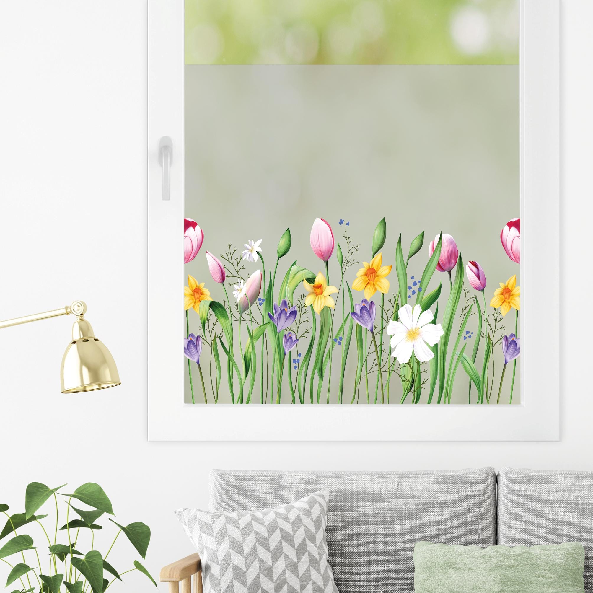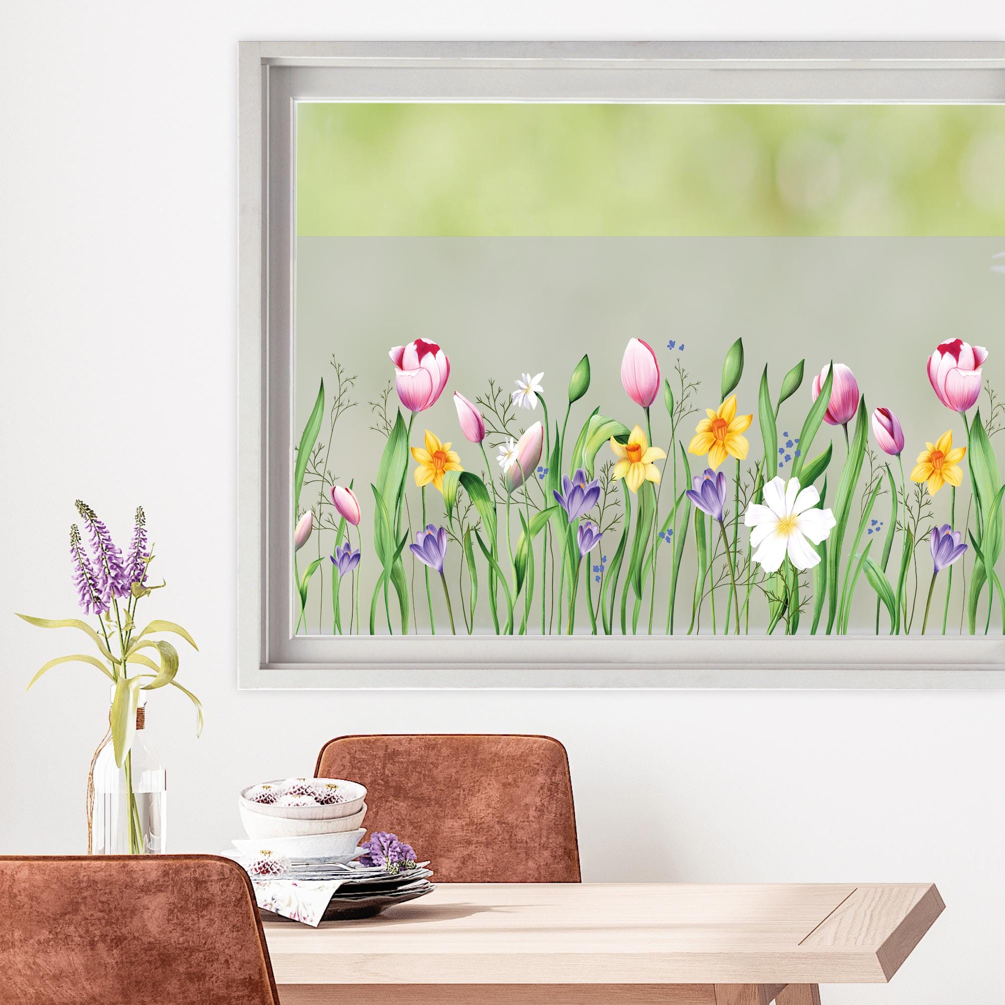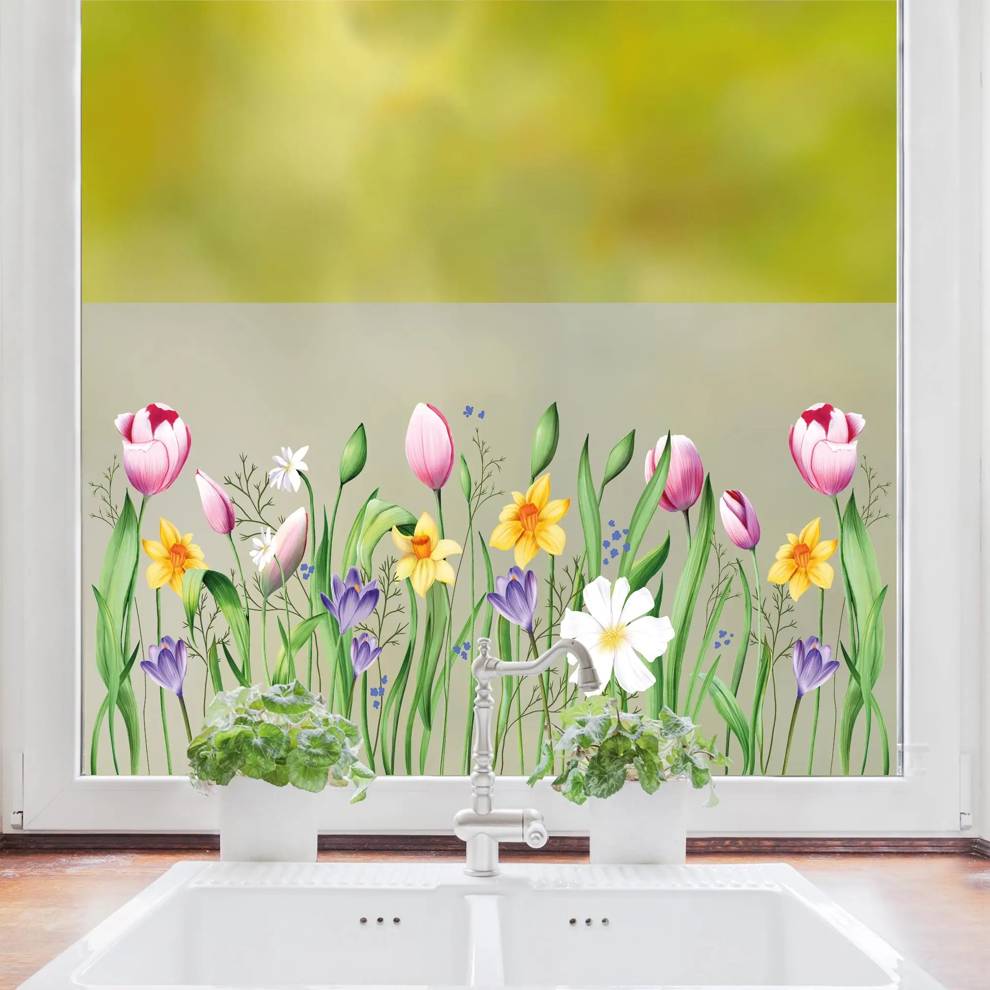 Sichtschutzfolie Frühlingsblumen Tulpen Narzissen Osterglocken Gräser bunt Frühling Wiesenblumen Fensterfolie Fensterdeko Milchglasfolie