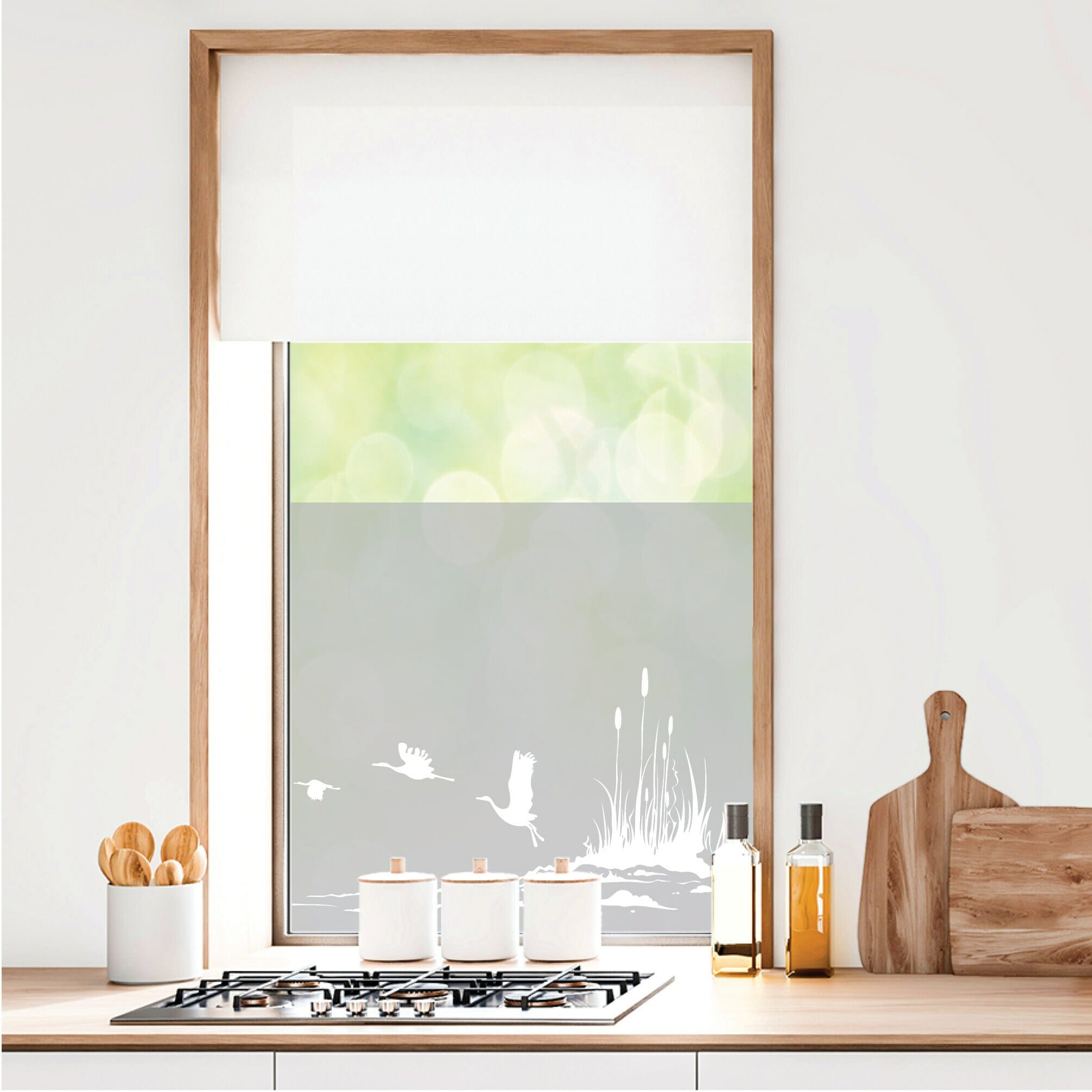 Sichtschutzfolie Kraniche mit Schilf am Ufer maritime Fensterfolie Fensterdeko Milchglasfolie