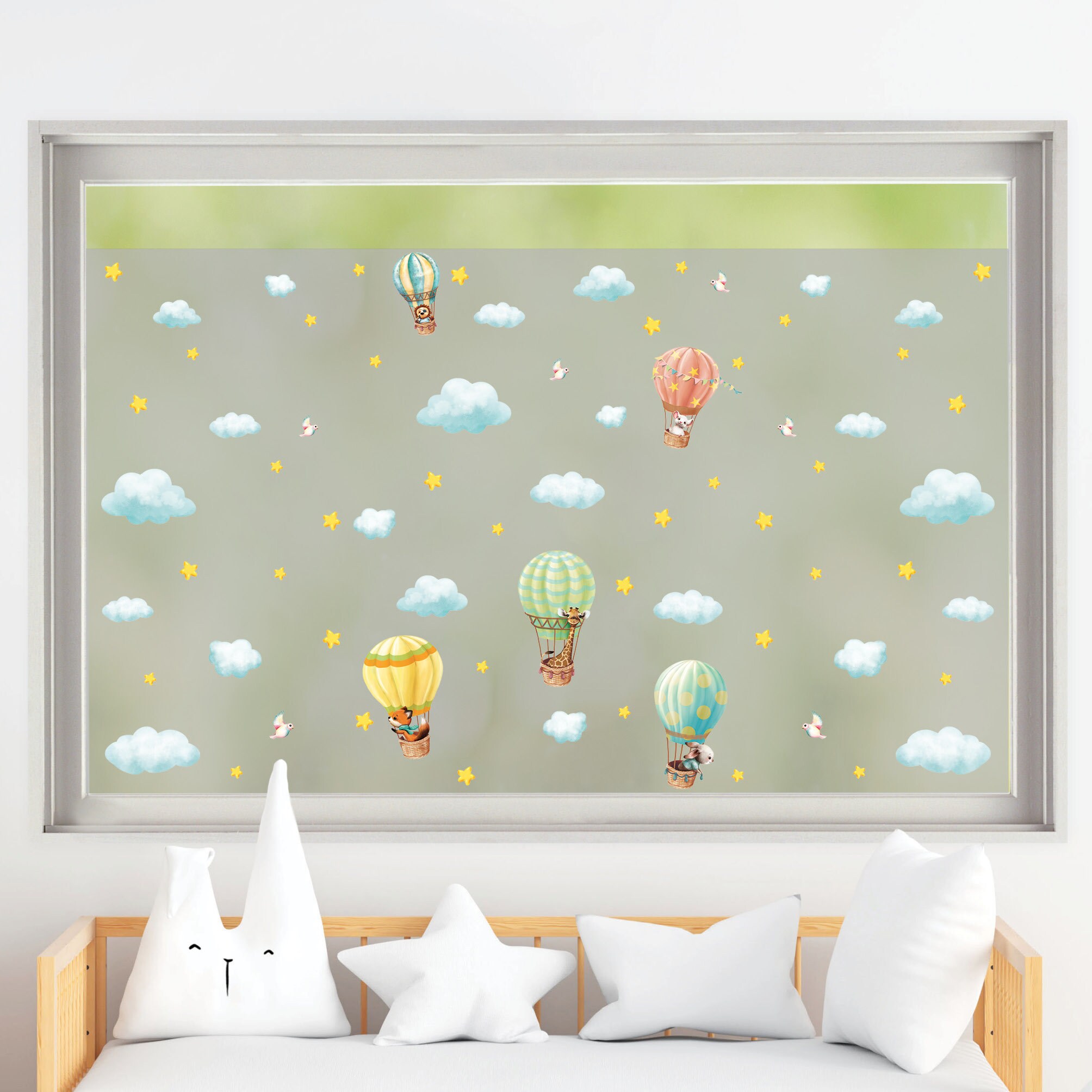 Auf dem Bild ist das Produkt: Sichtschutzfolie Tiere in Heißluftballons Wolken Fensterfolie Fensterdeko Milchglasfolie Fenster Folie zum Preis von €24.9 abgebildet.