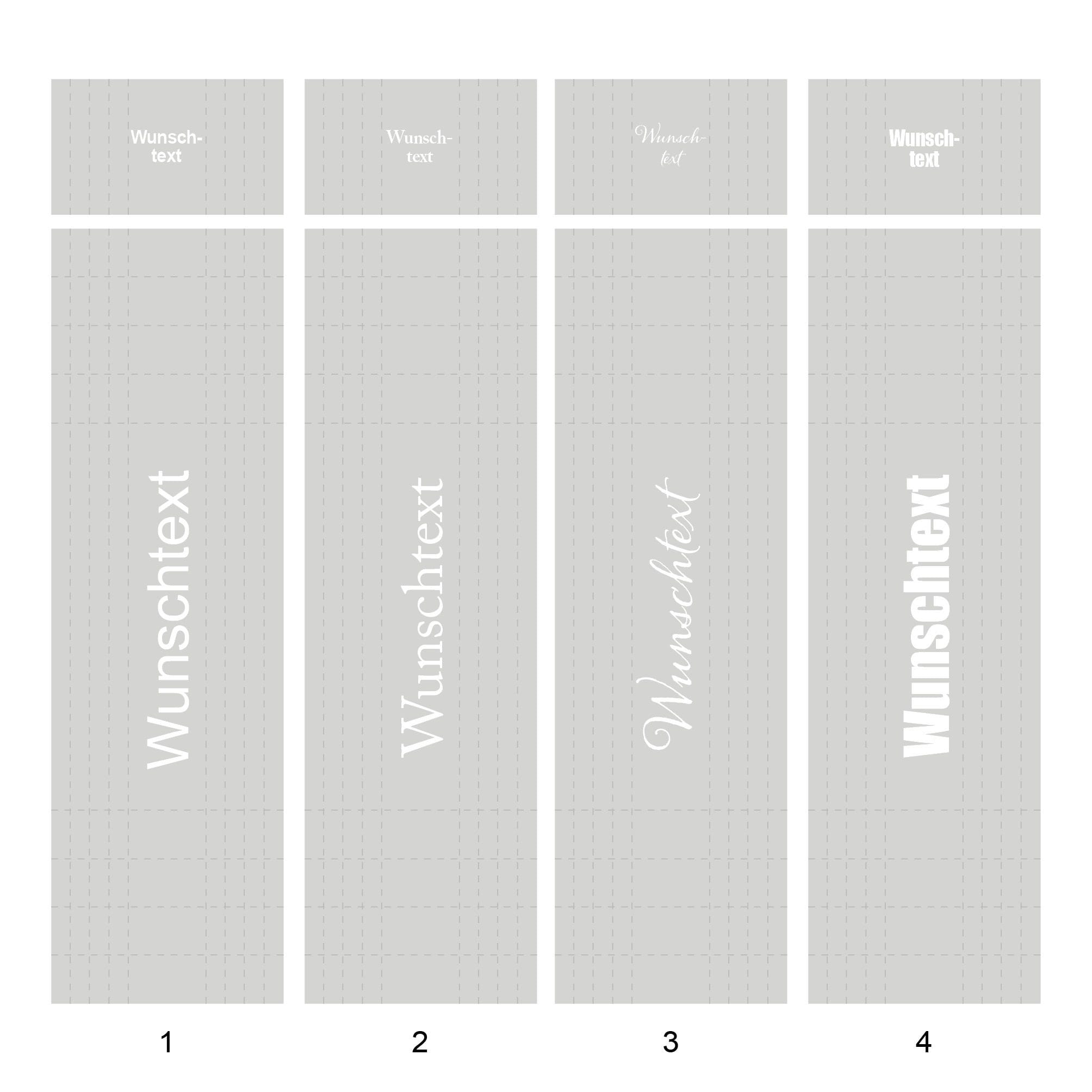 In den Artikelbildern findest Du eine Übersicht über die Anordnung der Schrift bei den unterschiedlichen Größen.