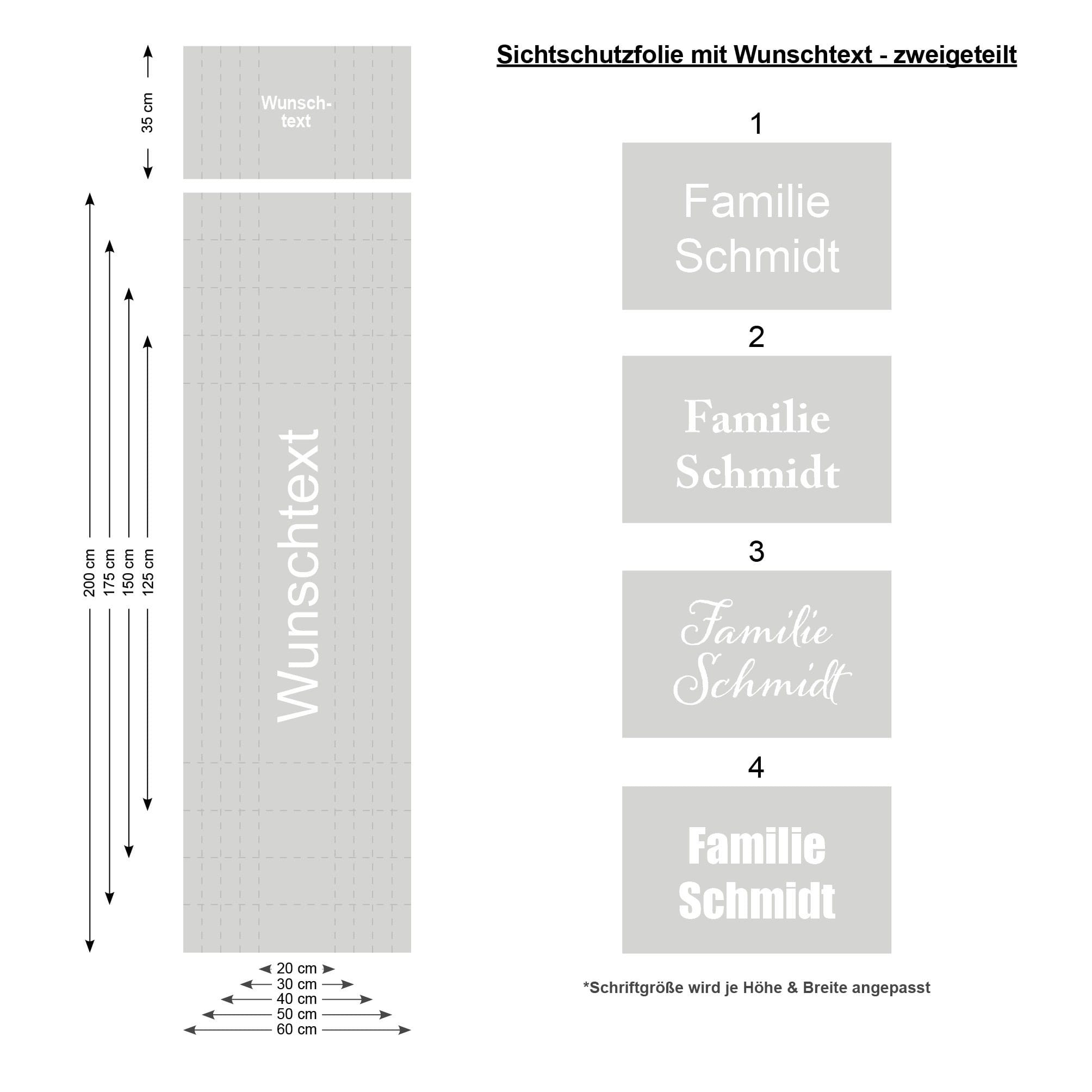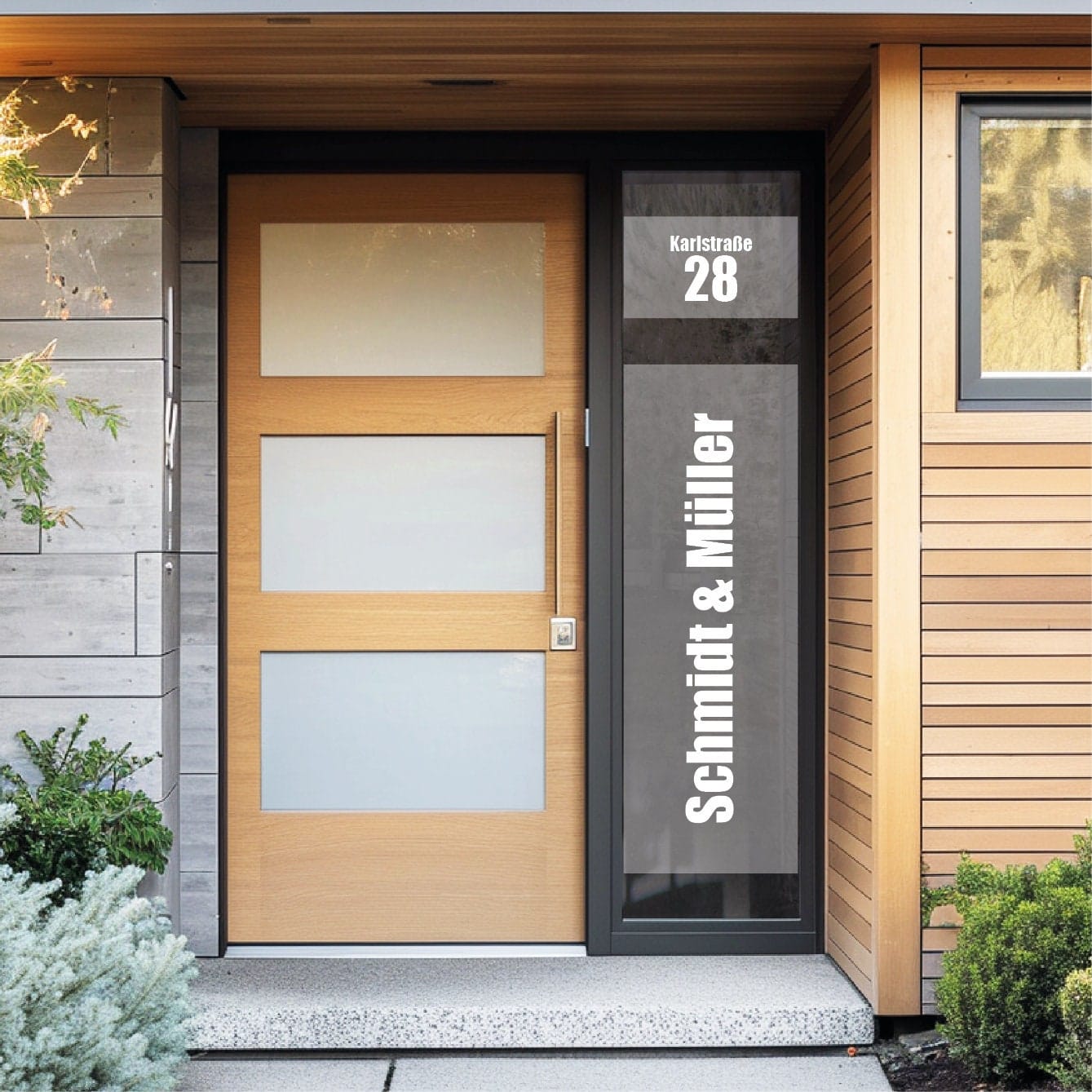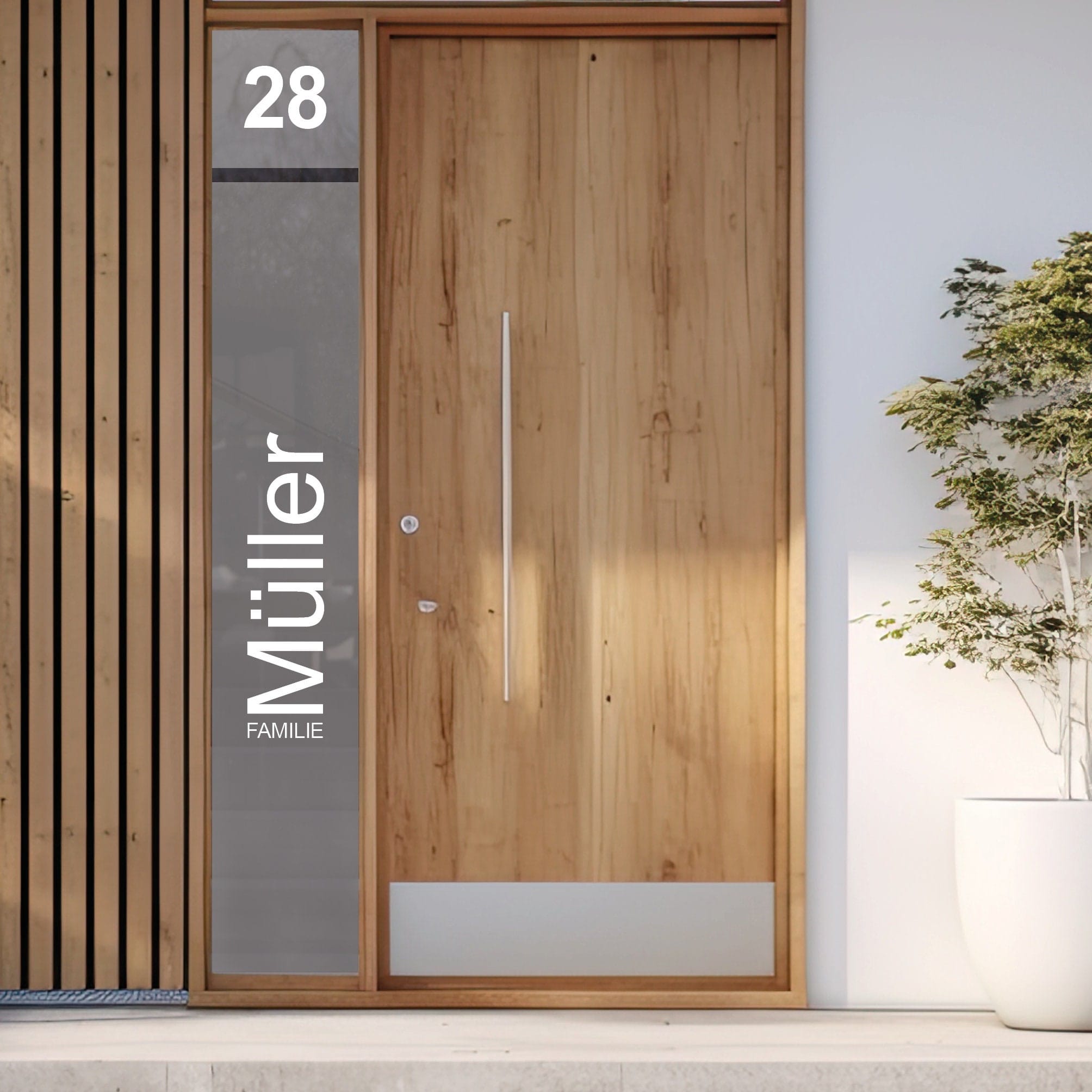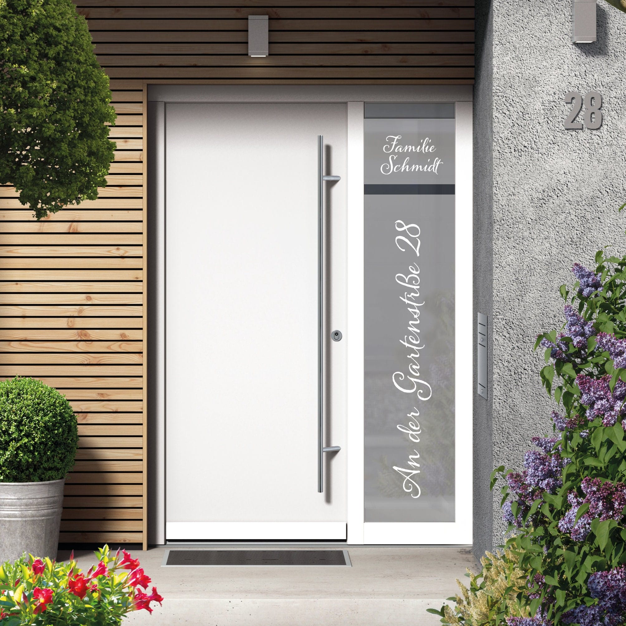 Du kannst die Sichtschutzfolie mit deiner Straße und Hausnummer oder/und mit deinem Familiennamen bekommen.