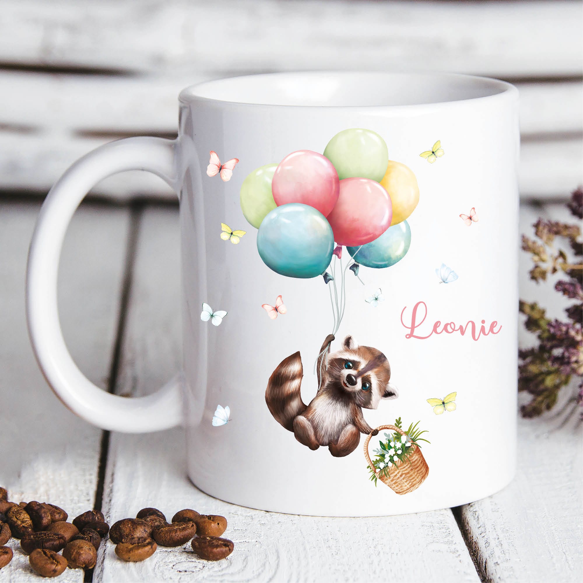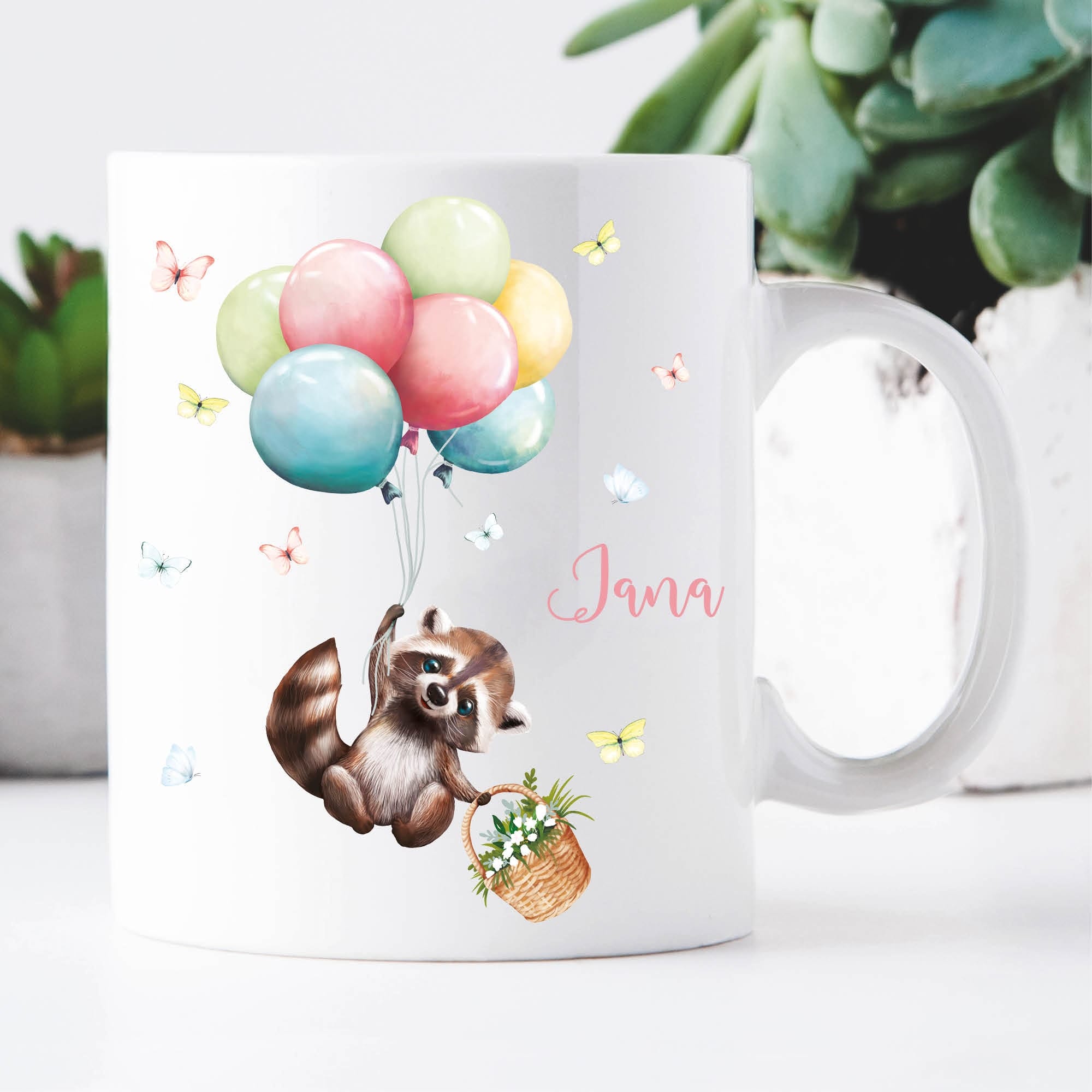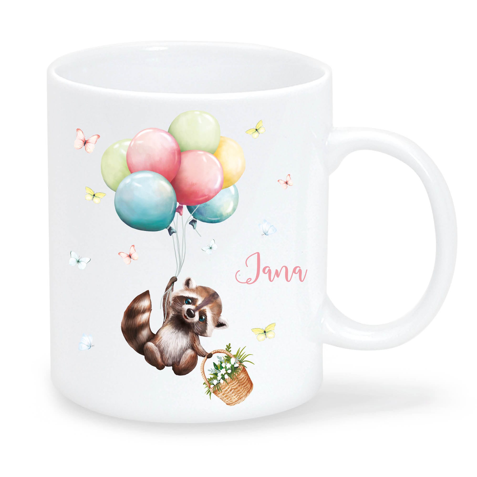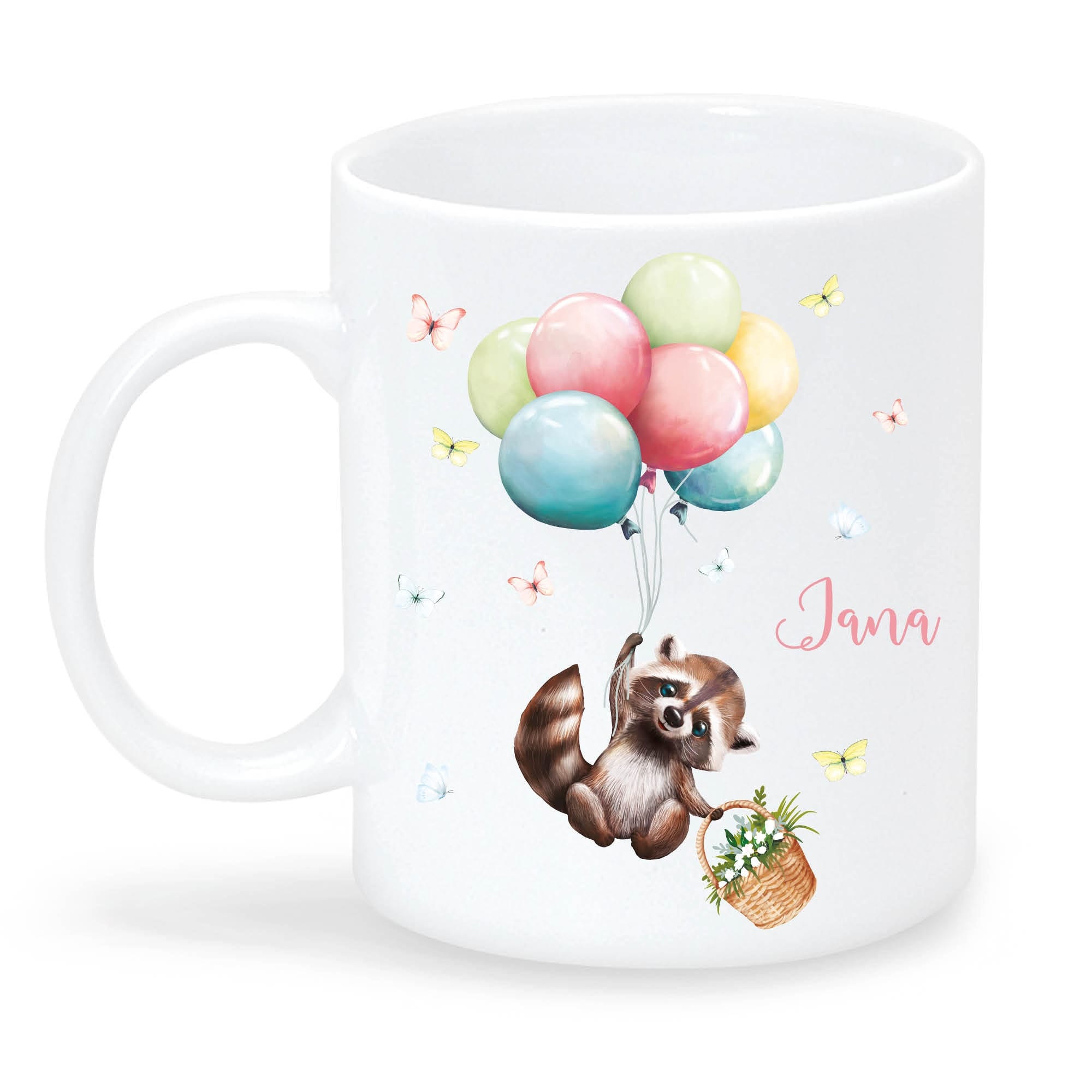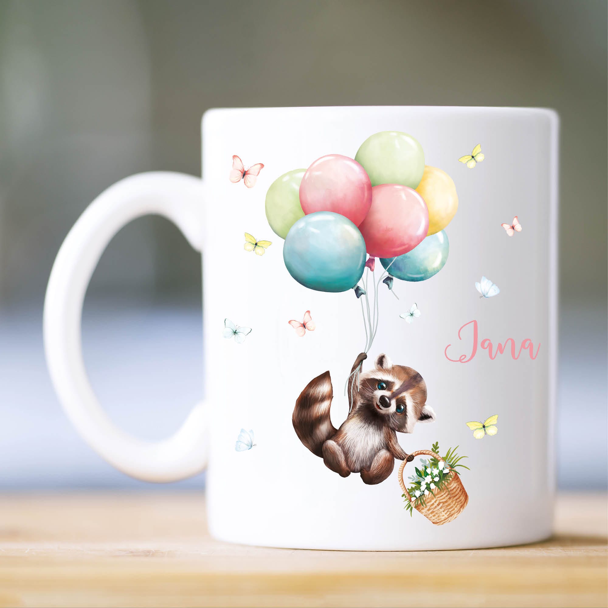 Tasse aus Keramik mit niedlichem Waschbär Motiv mit Korb und Luftballons, personalisiert mit Wunschnamen