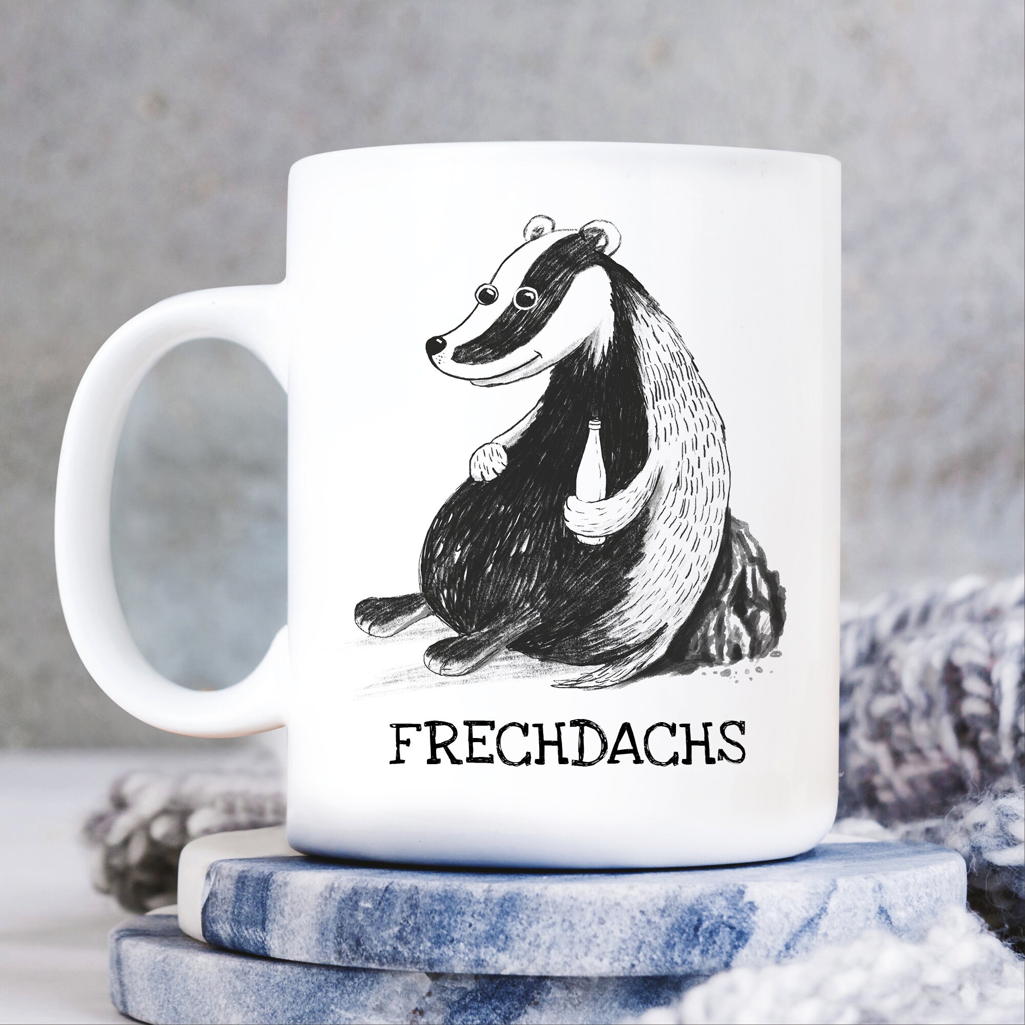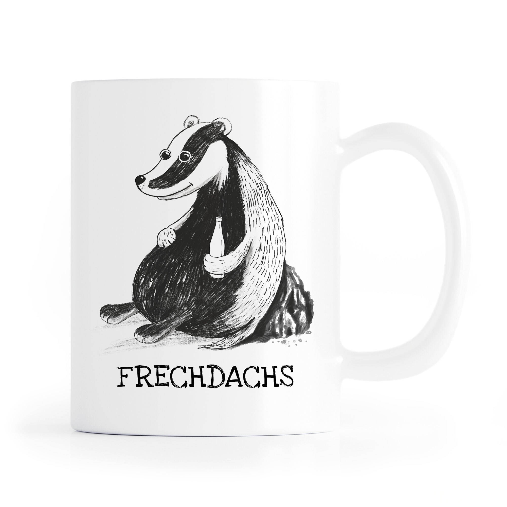 Tasse bedruckt mit einem sitzenden Dachs und der humorvollen Aufschrift “Frechdachs”, Kaffeetasse, Geschenk zum Geburtstag