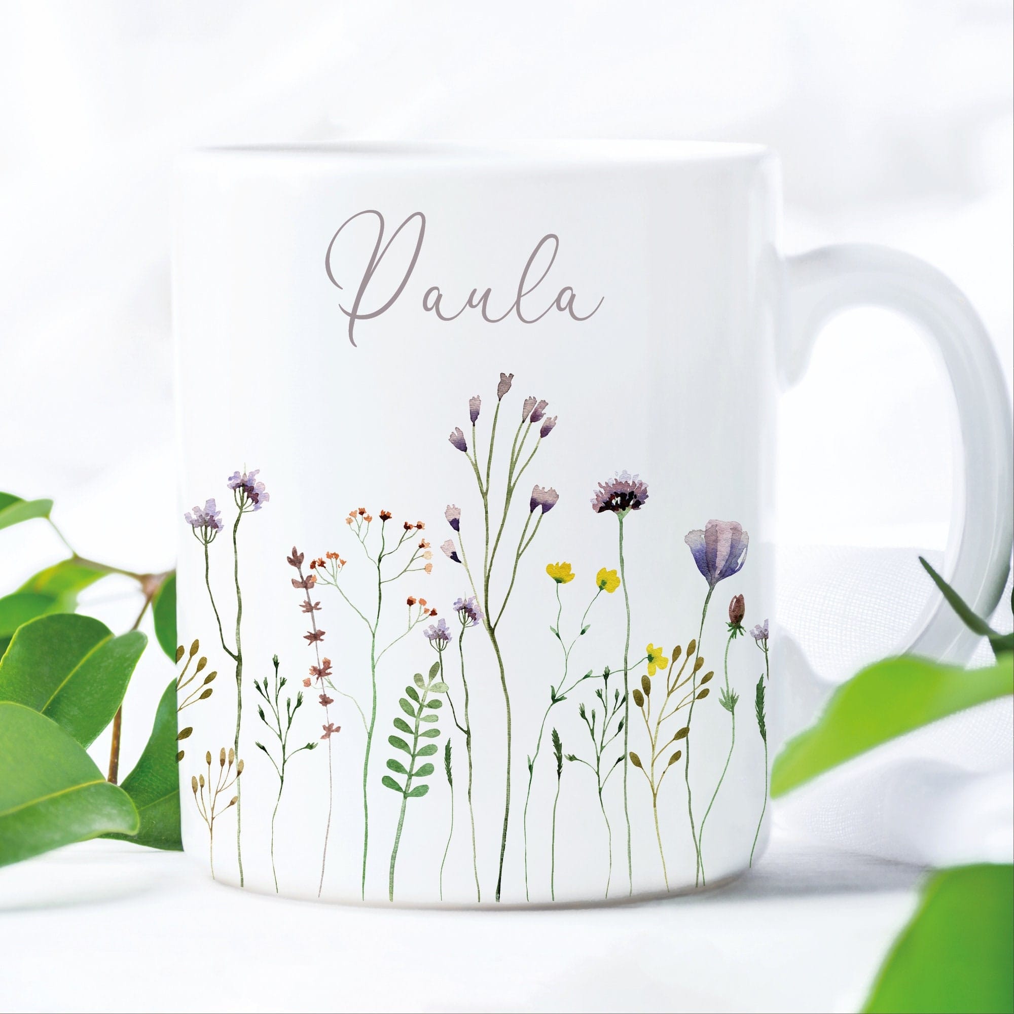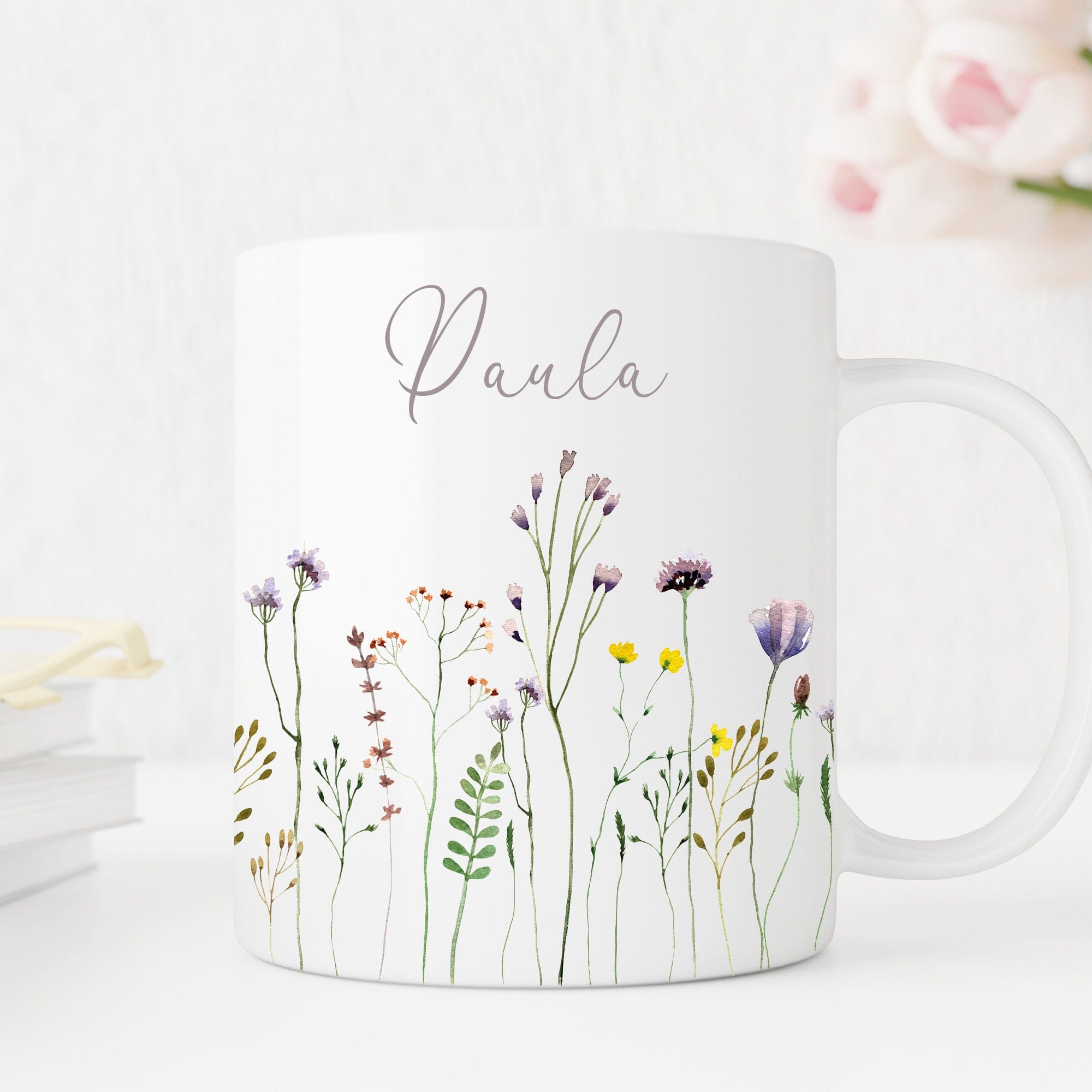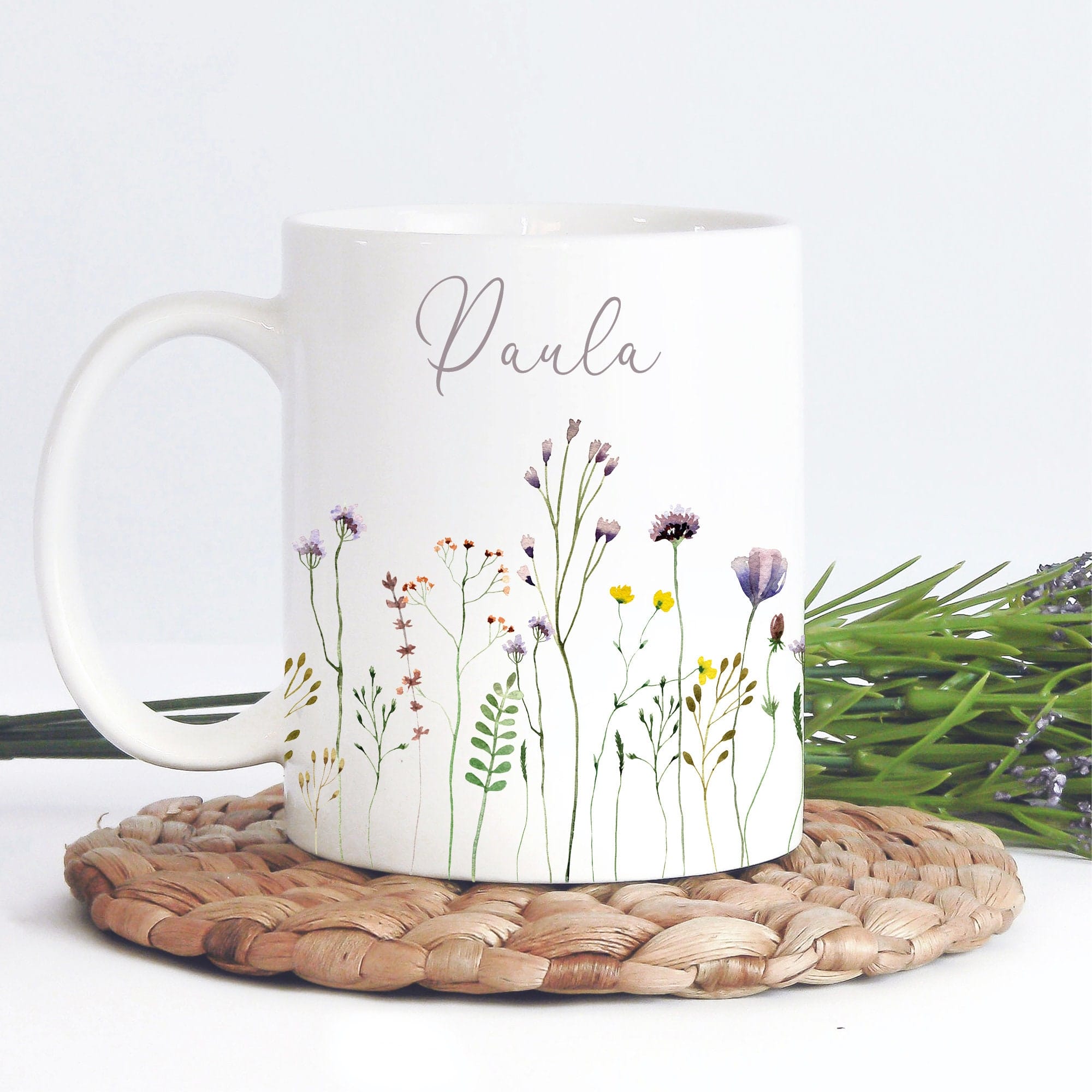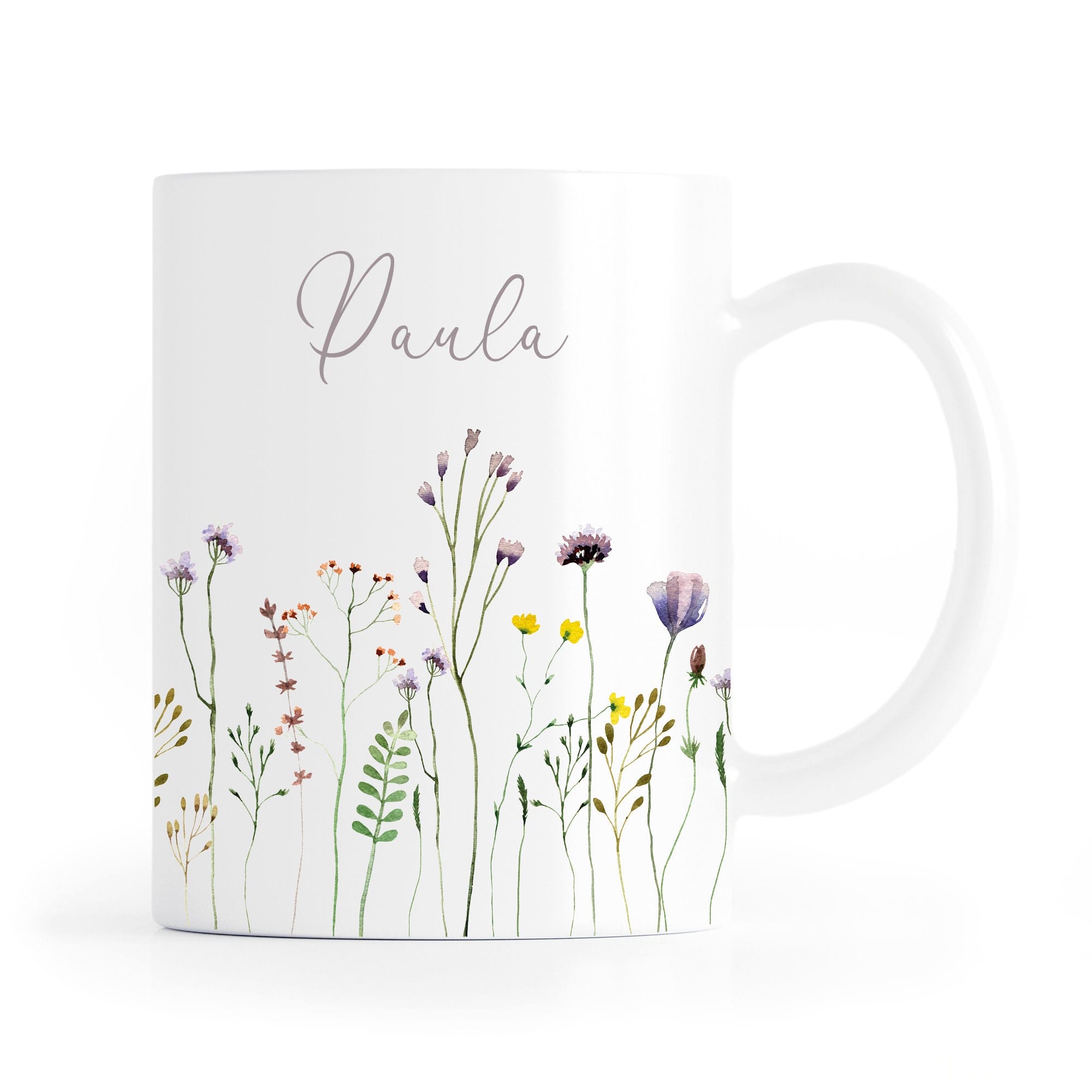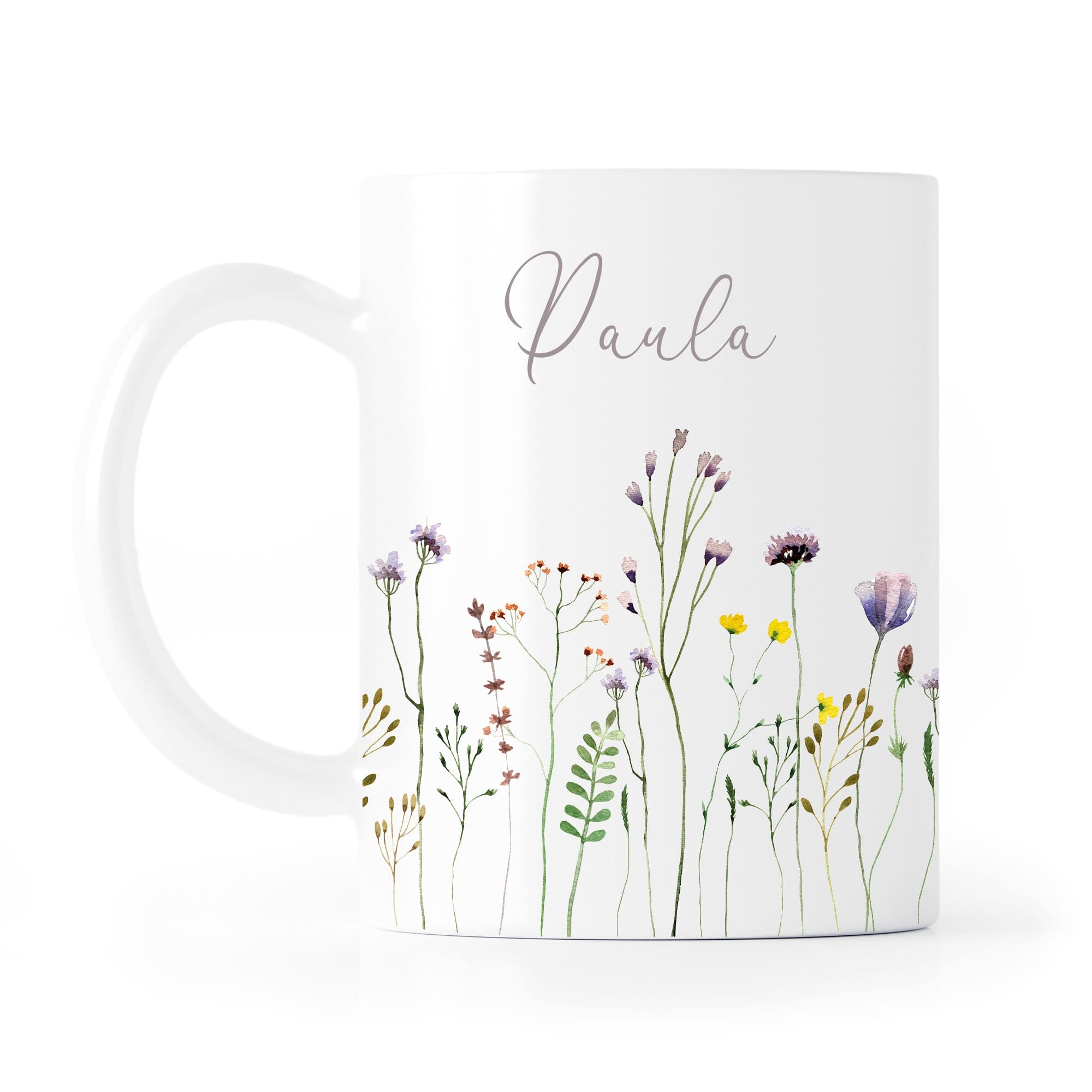 Tasse bedruckt mit Wildblumen Gräsern und dem Wunschnamen Kaffeetasse, personalisiert, Geschenk Geburtstag beste Freundin
