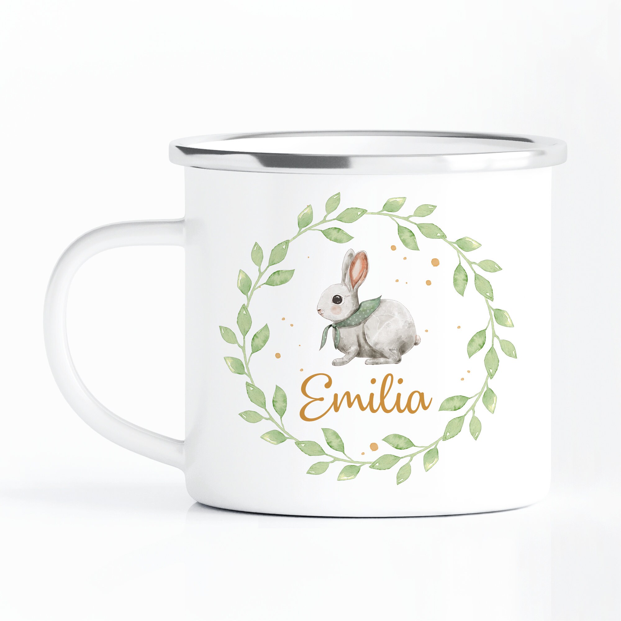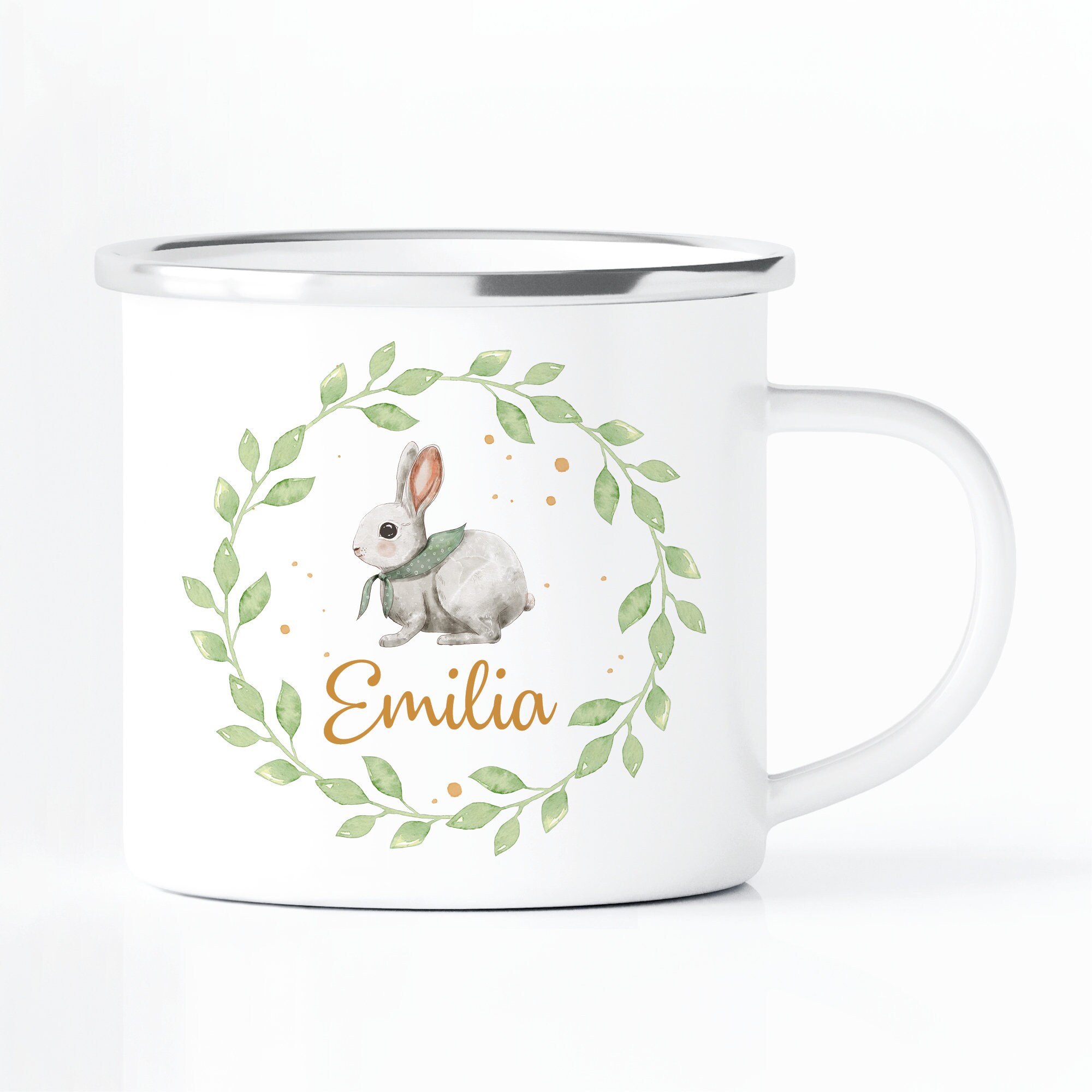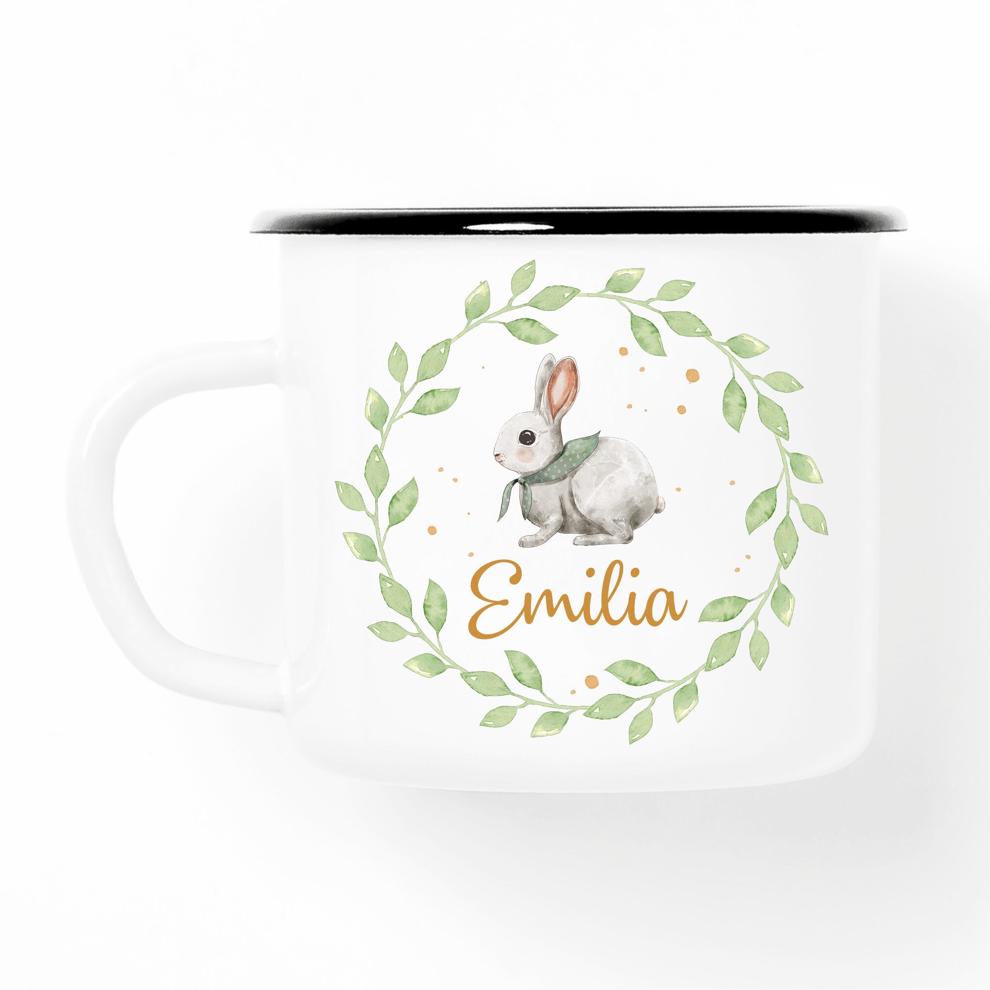 Tasse Emaille Campingbecher Hase im Blätterkranz mit Blumen und Wunschnamen