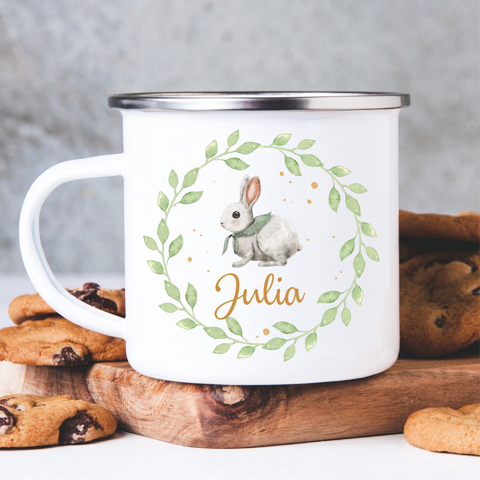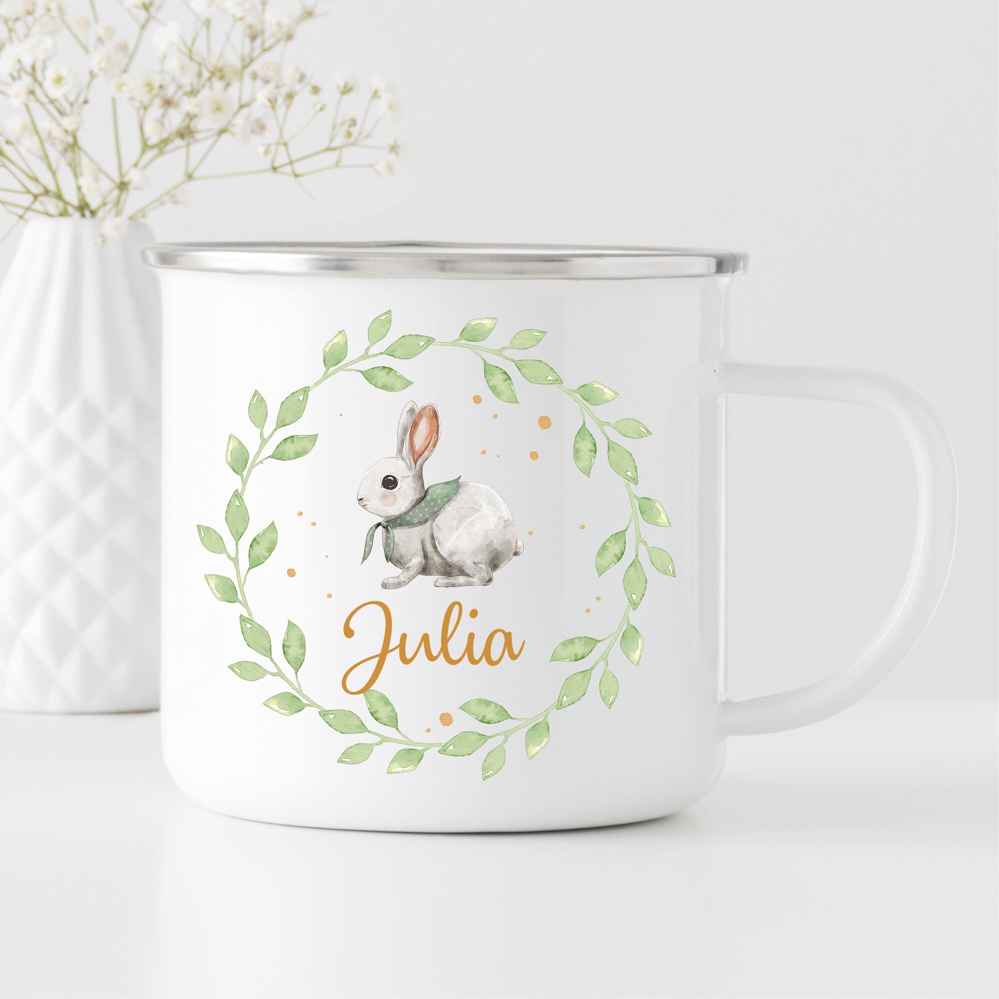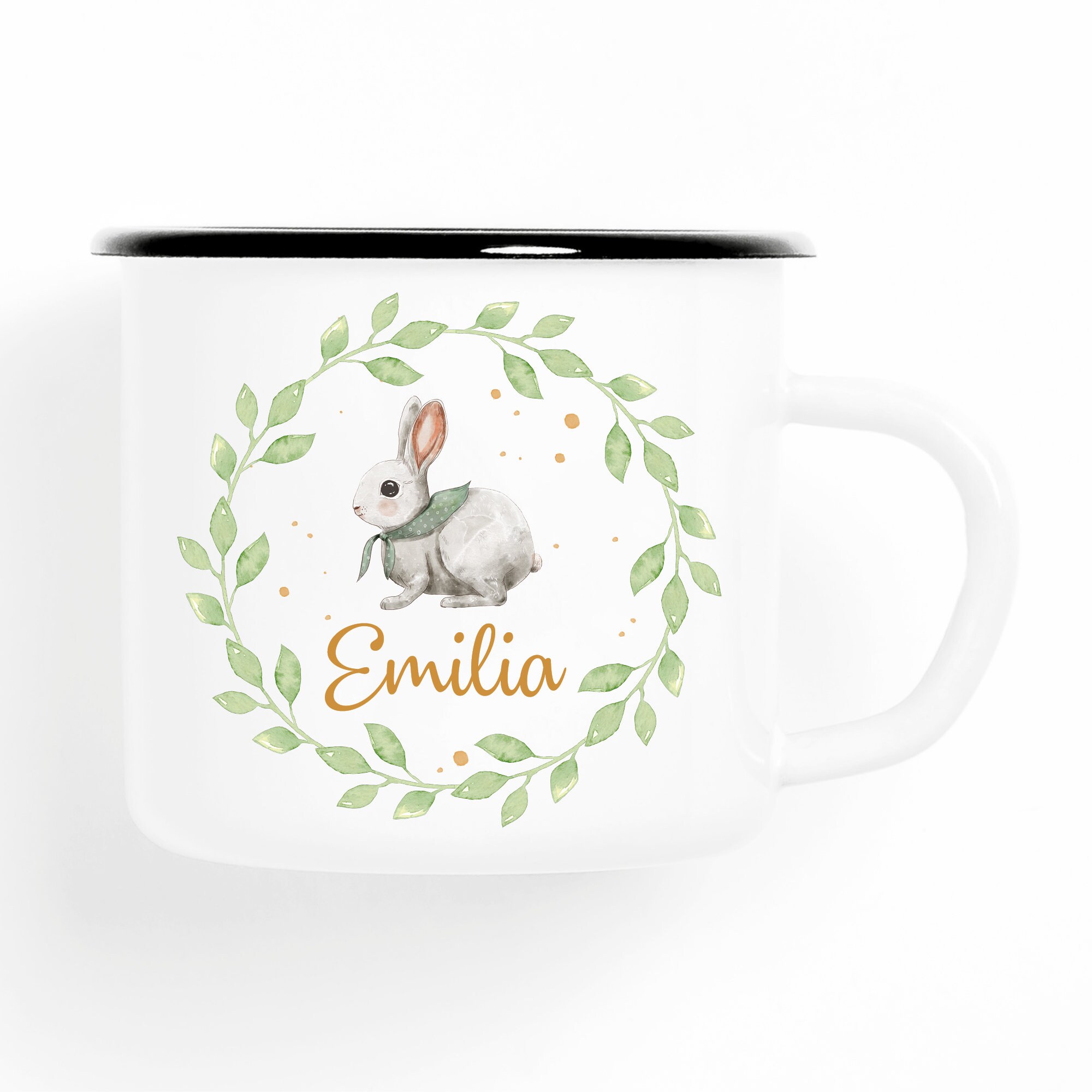 Tasse Emaille Campingbecher Hase im Blätterkranz mit Blumen und Wunschnamen
