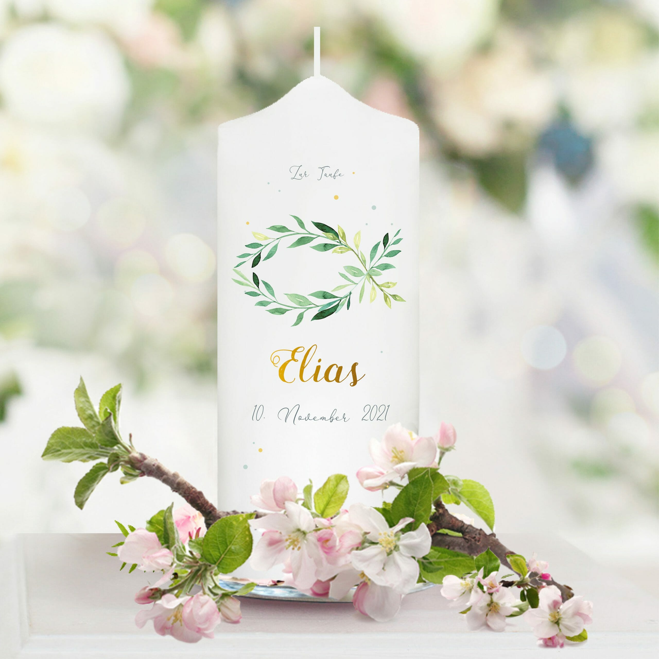Taufkerze Junge Mädchen Fisch Blätterkranz grün pastell mit Namen, Datum und auf Wunsch eigenem, vorgegebenem oder keinem Taufspruch
