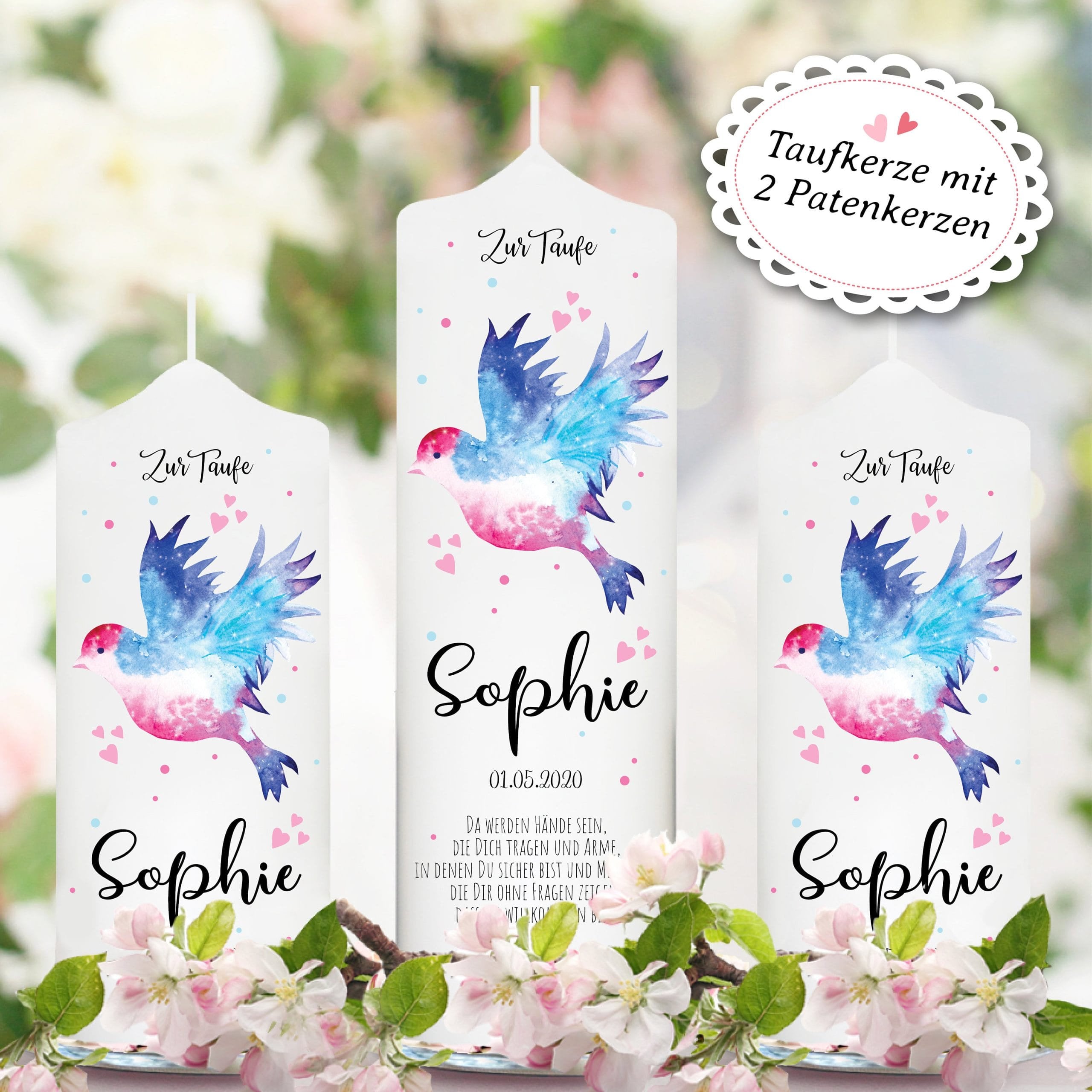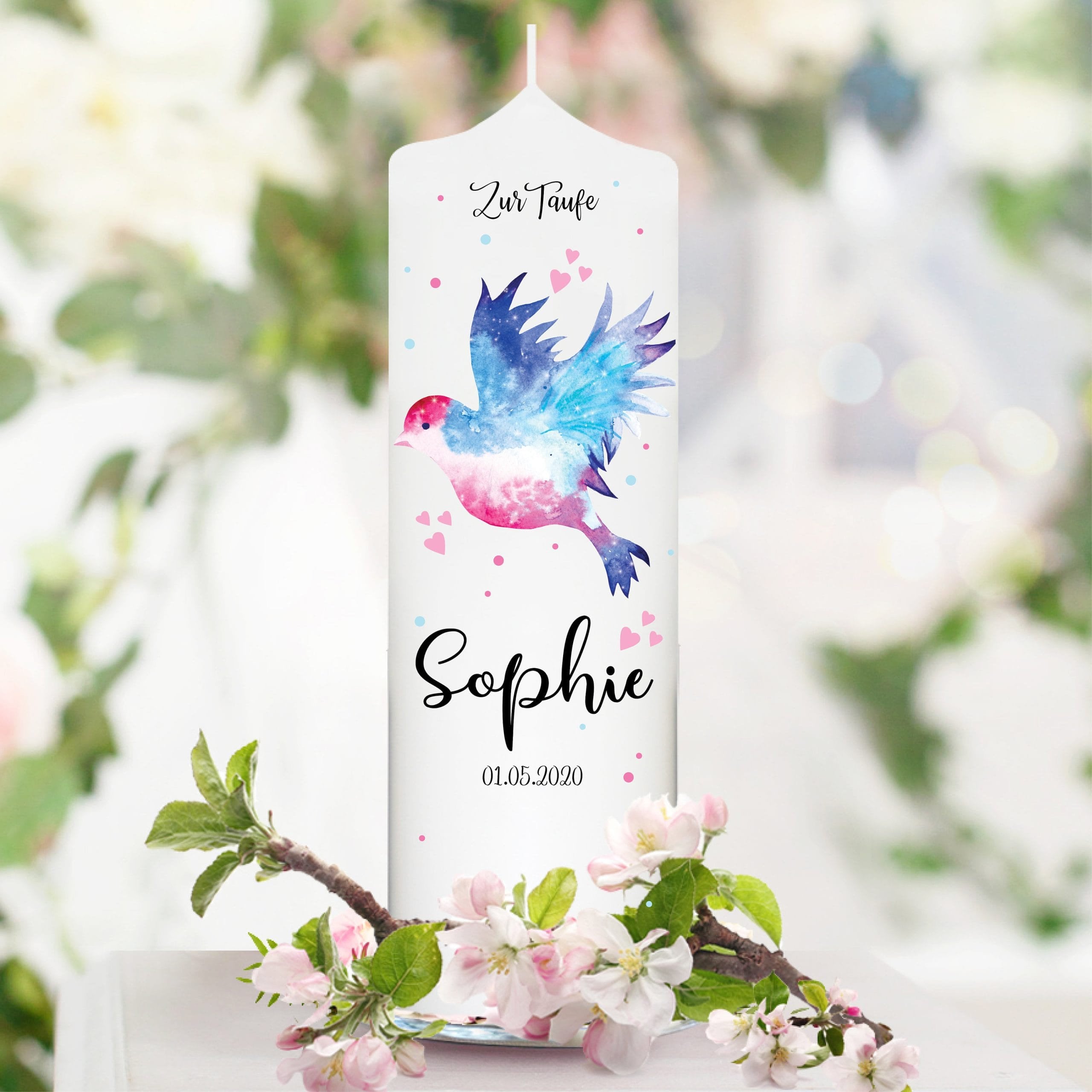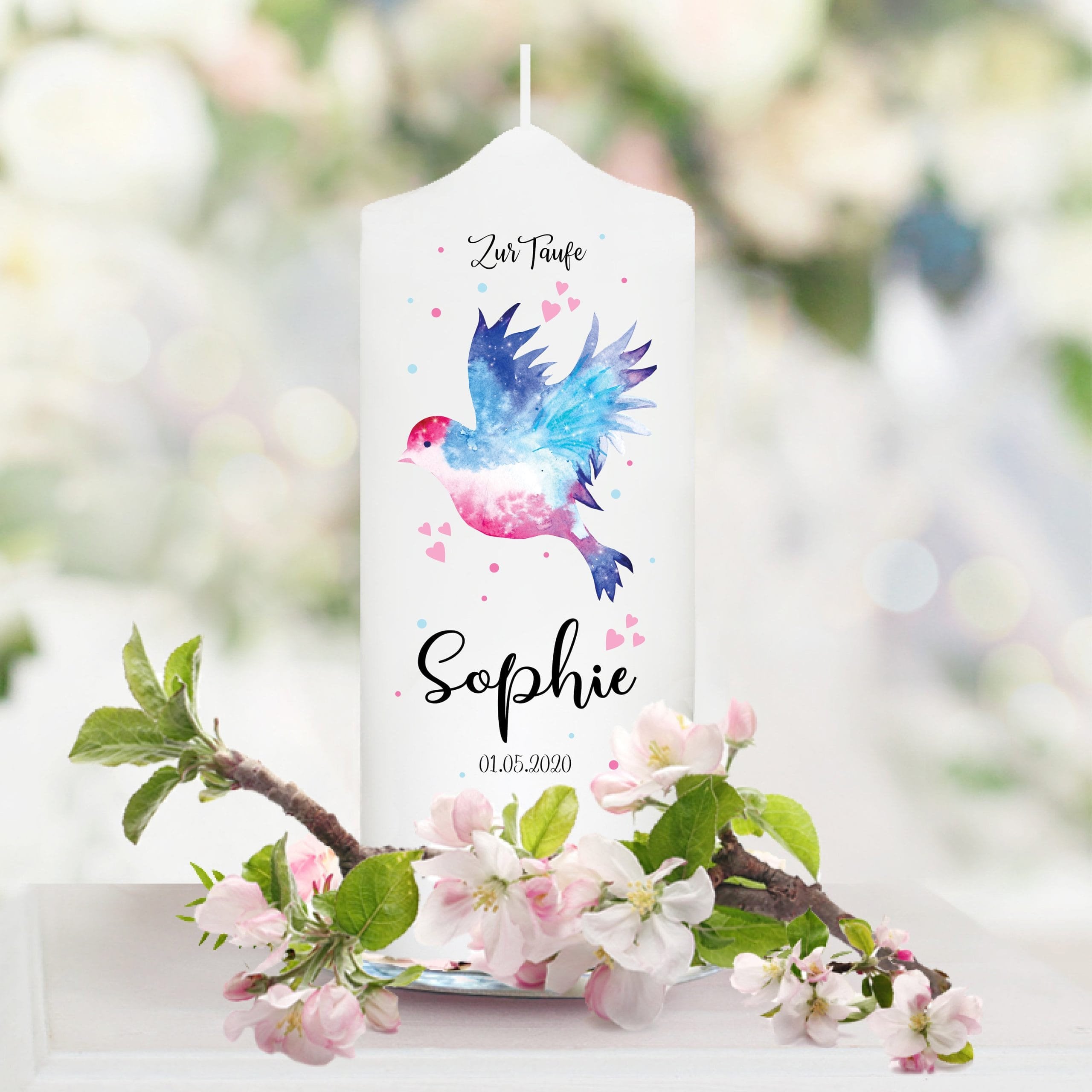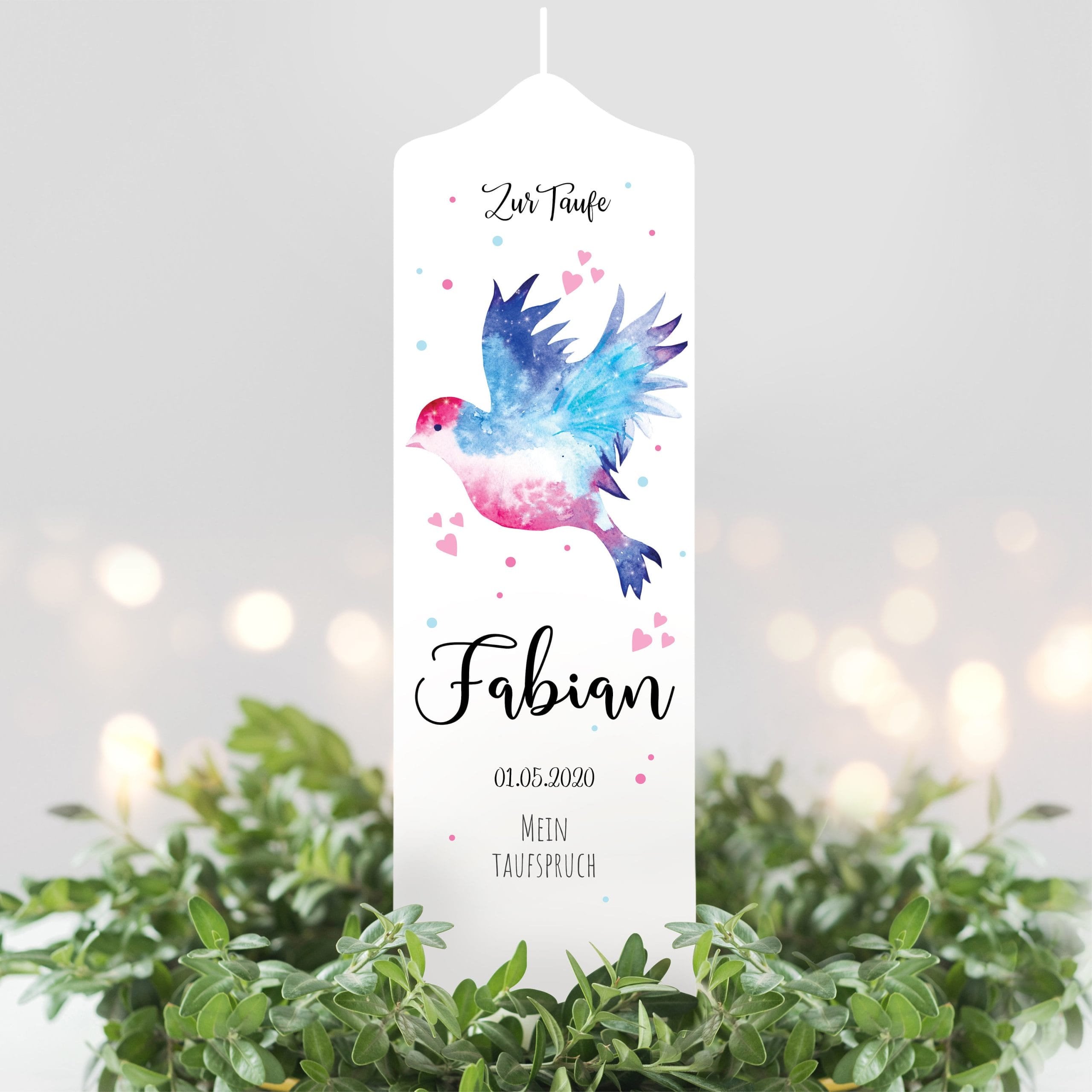 Taufkerze Junge/ Mädchen Vogel Baby Kerze zur Taufe mit Namen, Datum und eigenem, vorgegebenem oder keinem Taufspruch