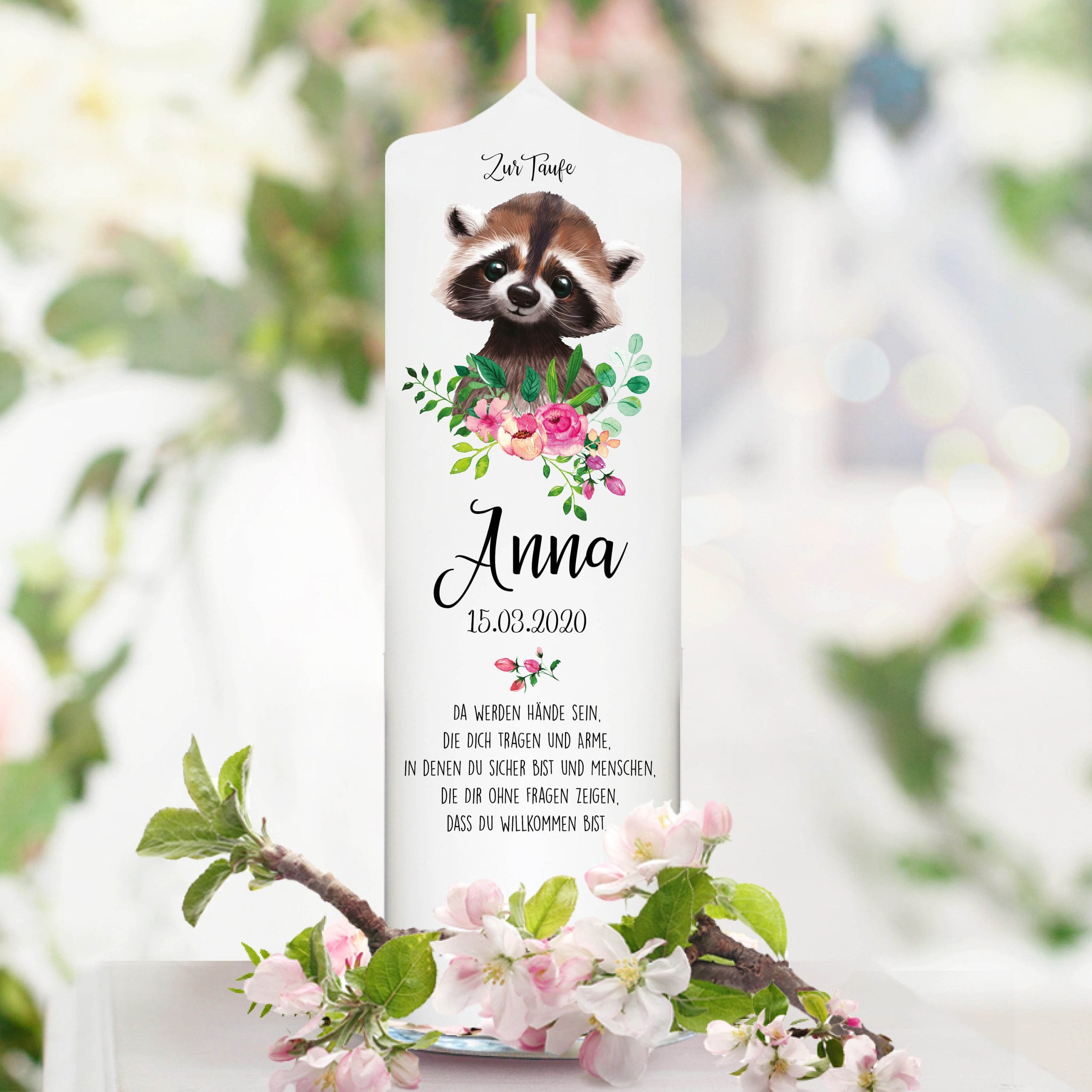 Einzigartiges Taufgeschenk für Mädchen und Jungen: Kerze bedruckt mit Waschbärbaby
