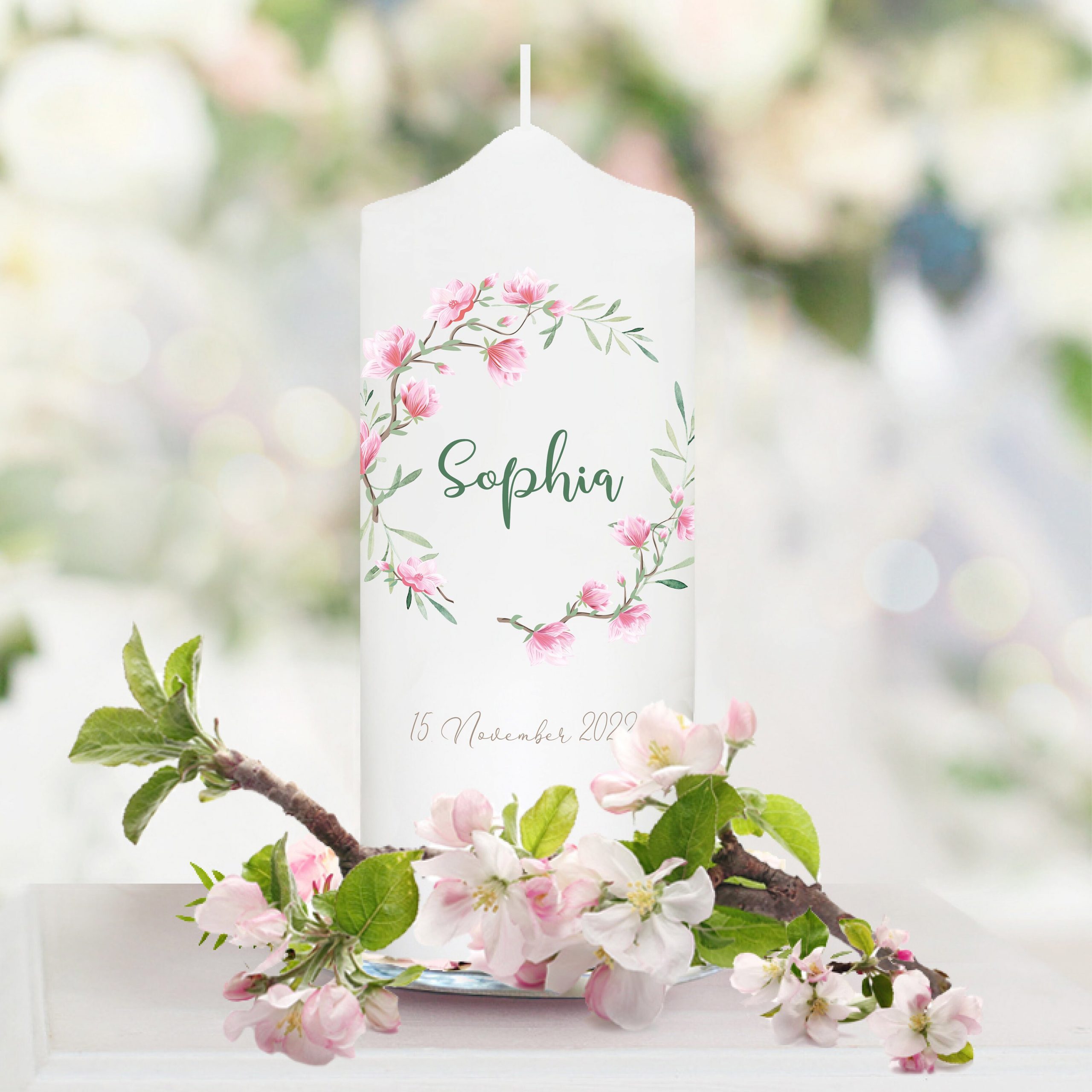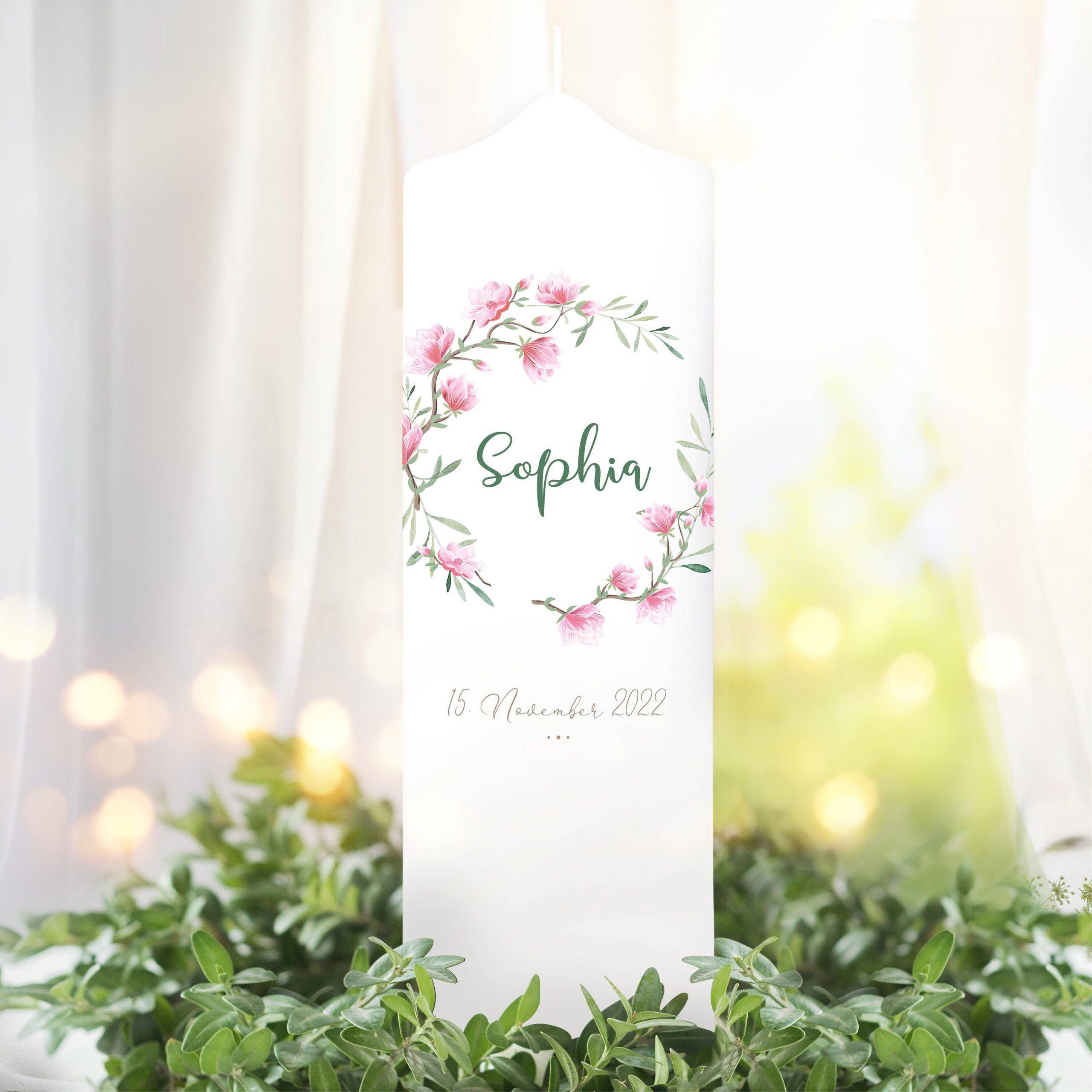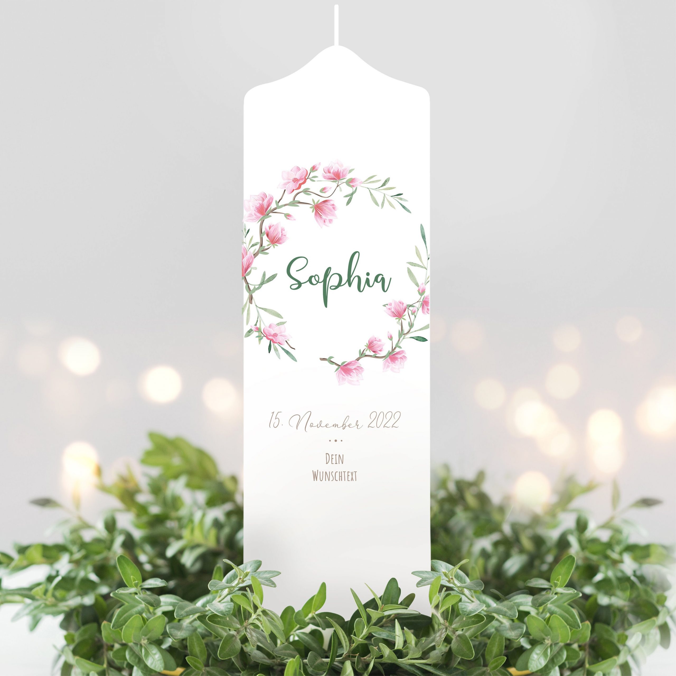 Taufkerze Mädchen Blütenkranz Magnolie rosa pastell bedruckt mit Namen, Datum und auf Wunsch eigenem, vorgegebenem oder keinem Taufspruch