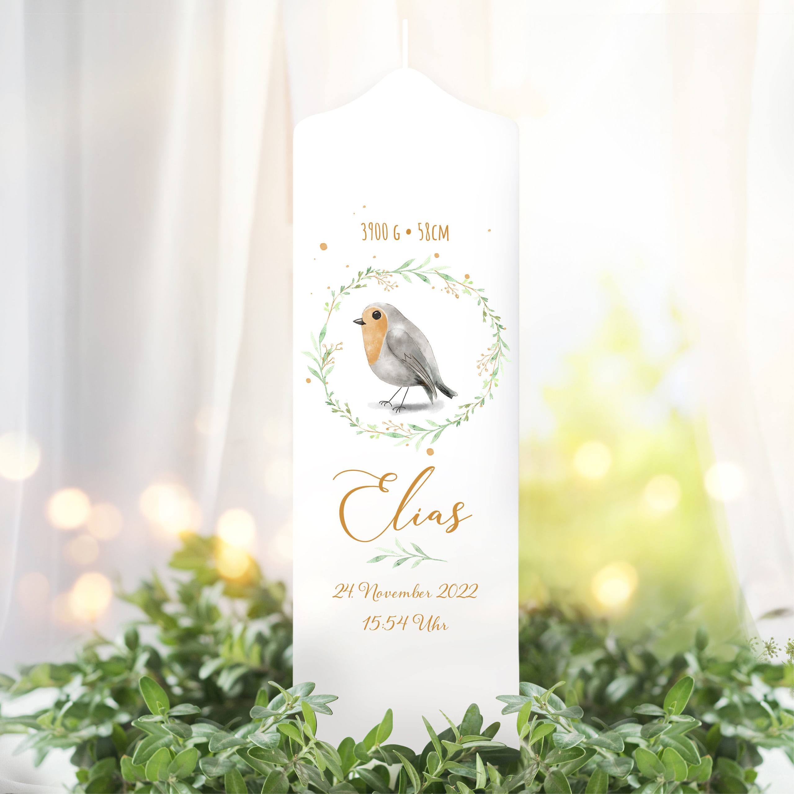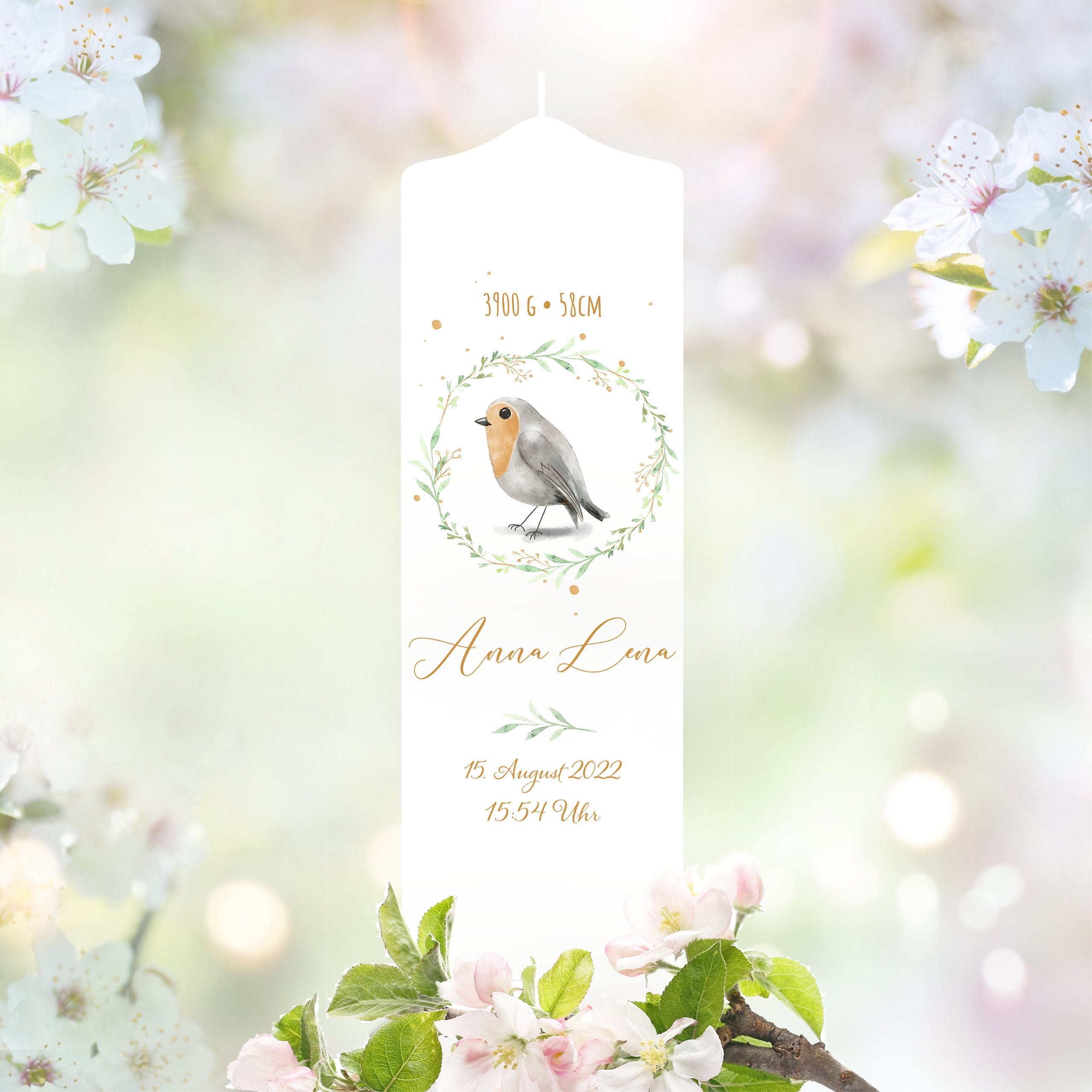 Handgefertigte Taufkerze: Diese weiße Spitzkopfkerze trägt als Motiv einen niedlichen Vogel in einem Blätterkranz in zarten Pastelltönen. Die Kerze ist zusätzlich mit dem Namen des Babys, dem Geburtsdatum, der Uhrzeit, der Größe und dem Gewicht bedruckt.