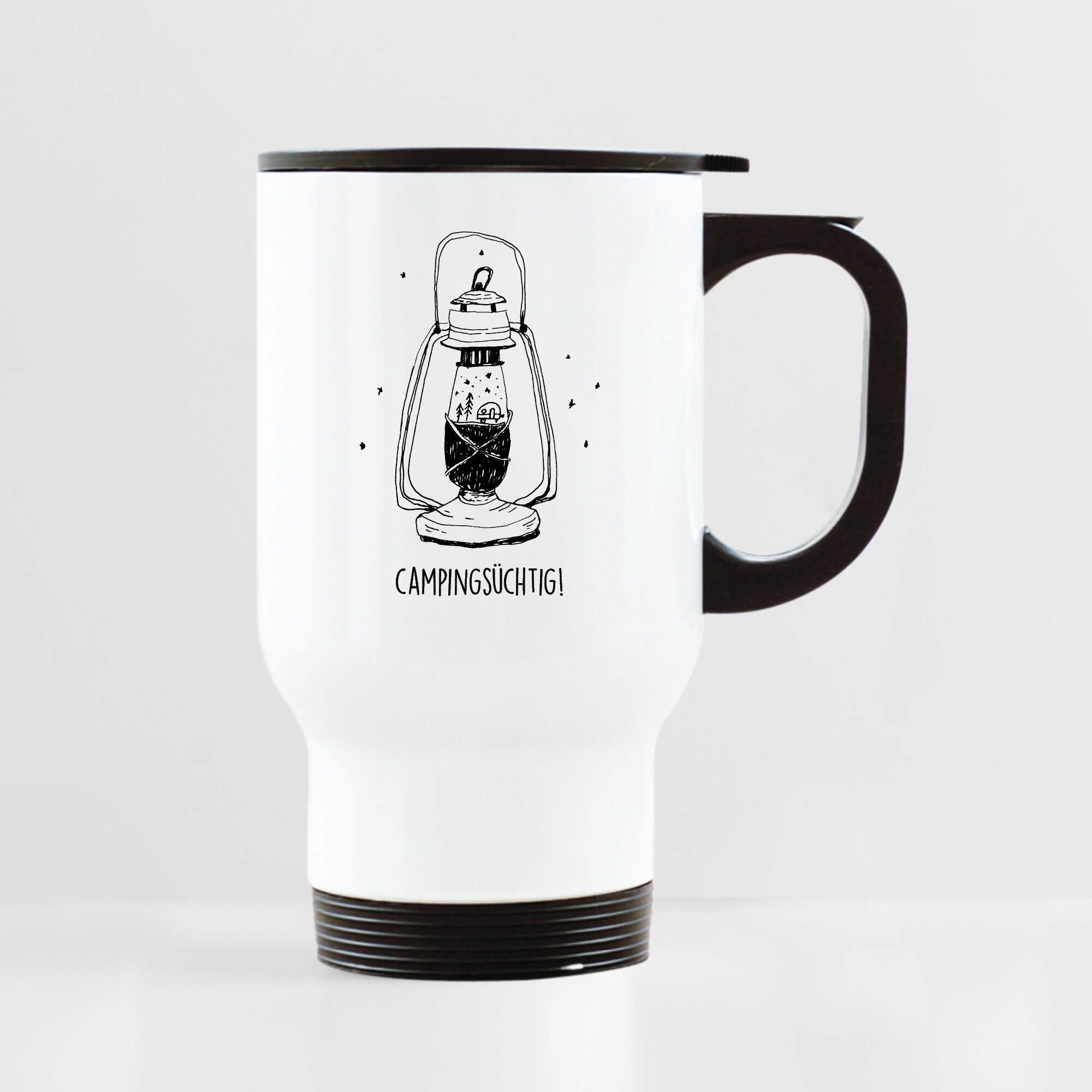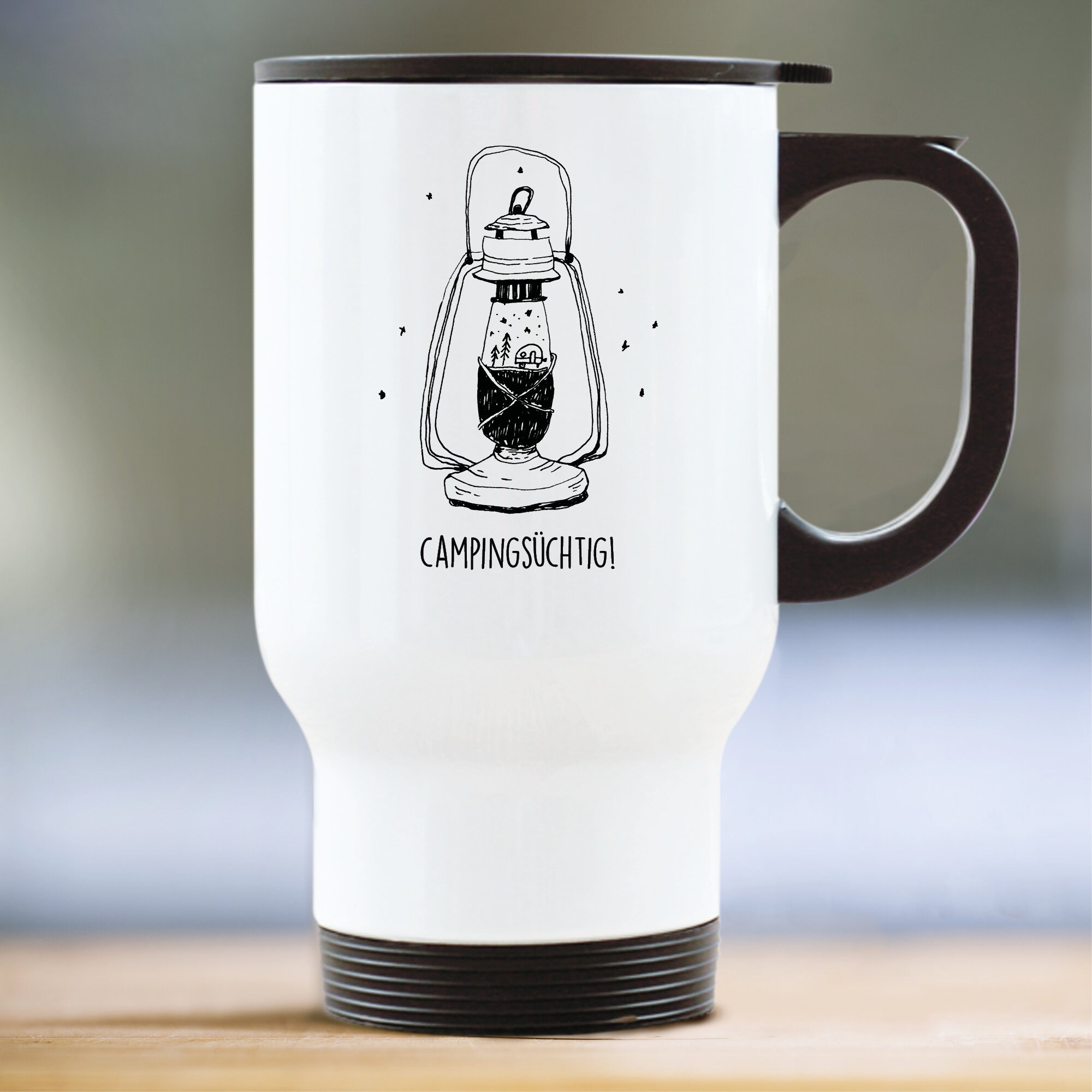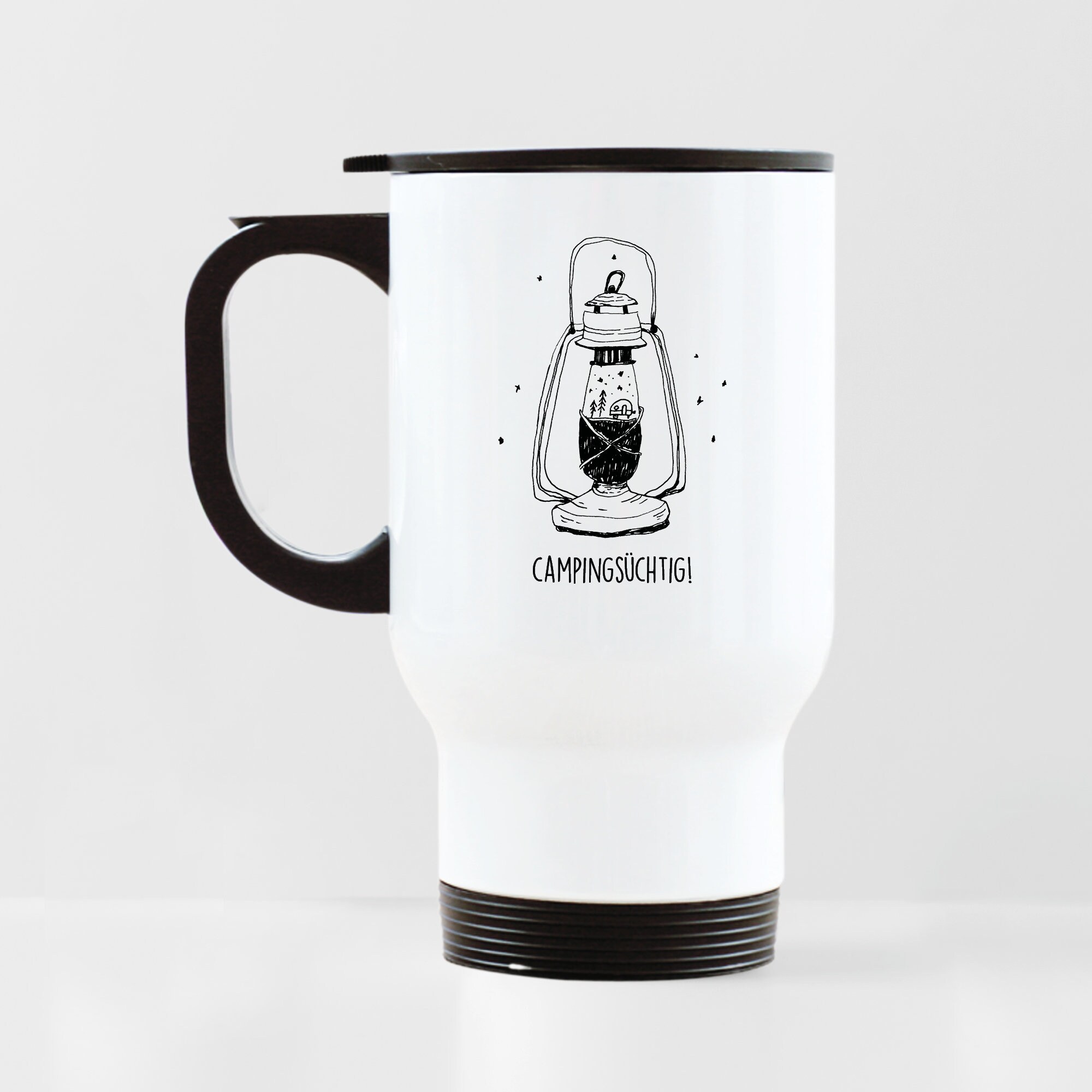 Thermobecher bedruckt mit einer Petroleumlampe und der Aufschrift “Campingsüchtig”. In der Lampe ist eine kleine Campingwelt mit einem Wohnwagen unter dem Sternenhimmel abgebildet.