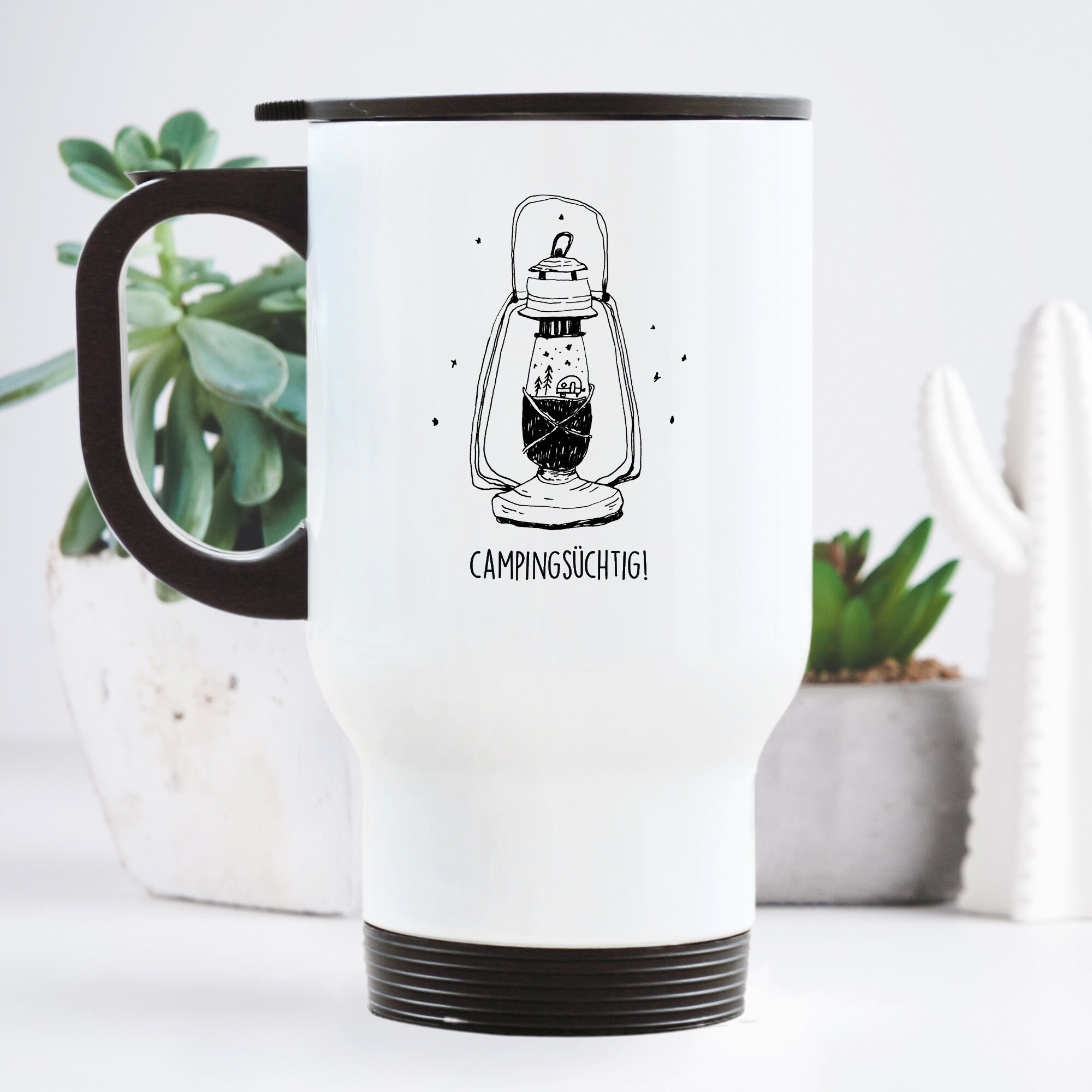 Thermobecher bedruckt mit einer Petroleumlampe und der Aufschrift Campingsüchtig, schwarz weiß, Geschenk Geburtstag Camper