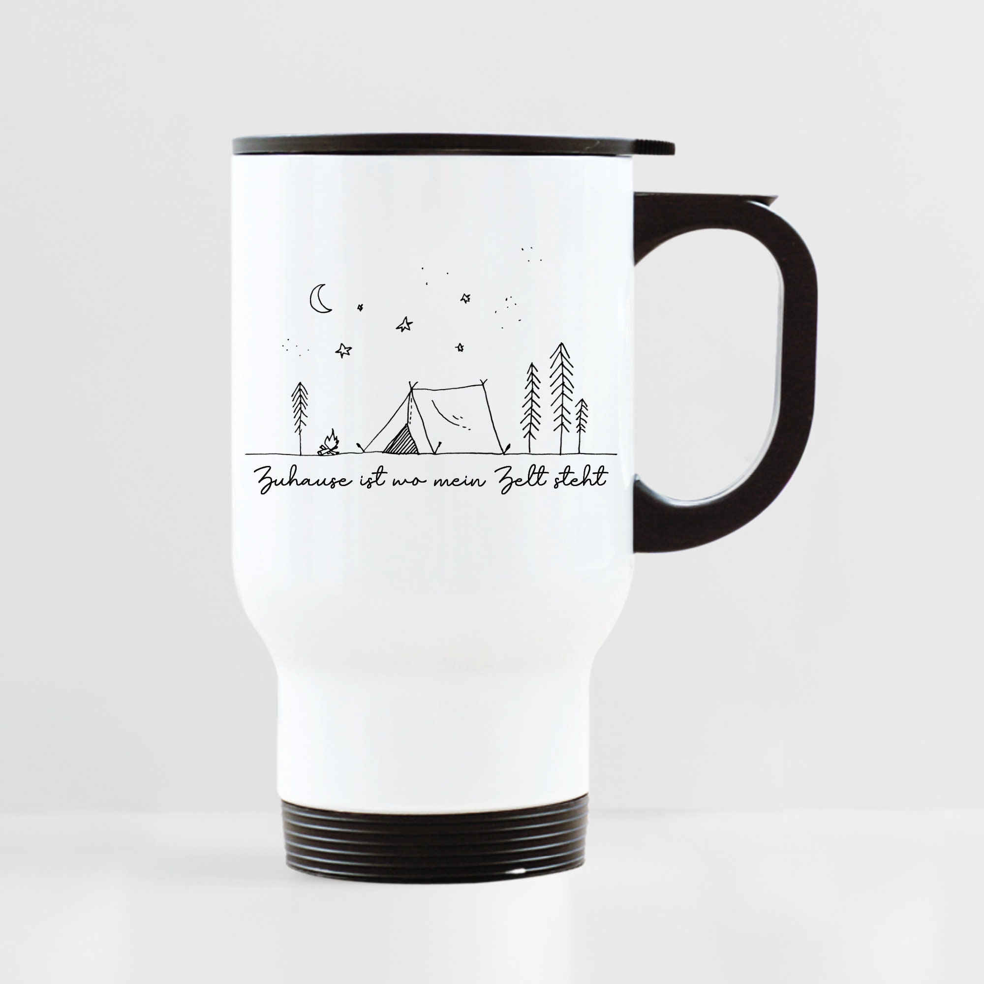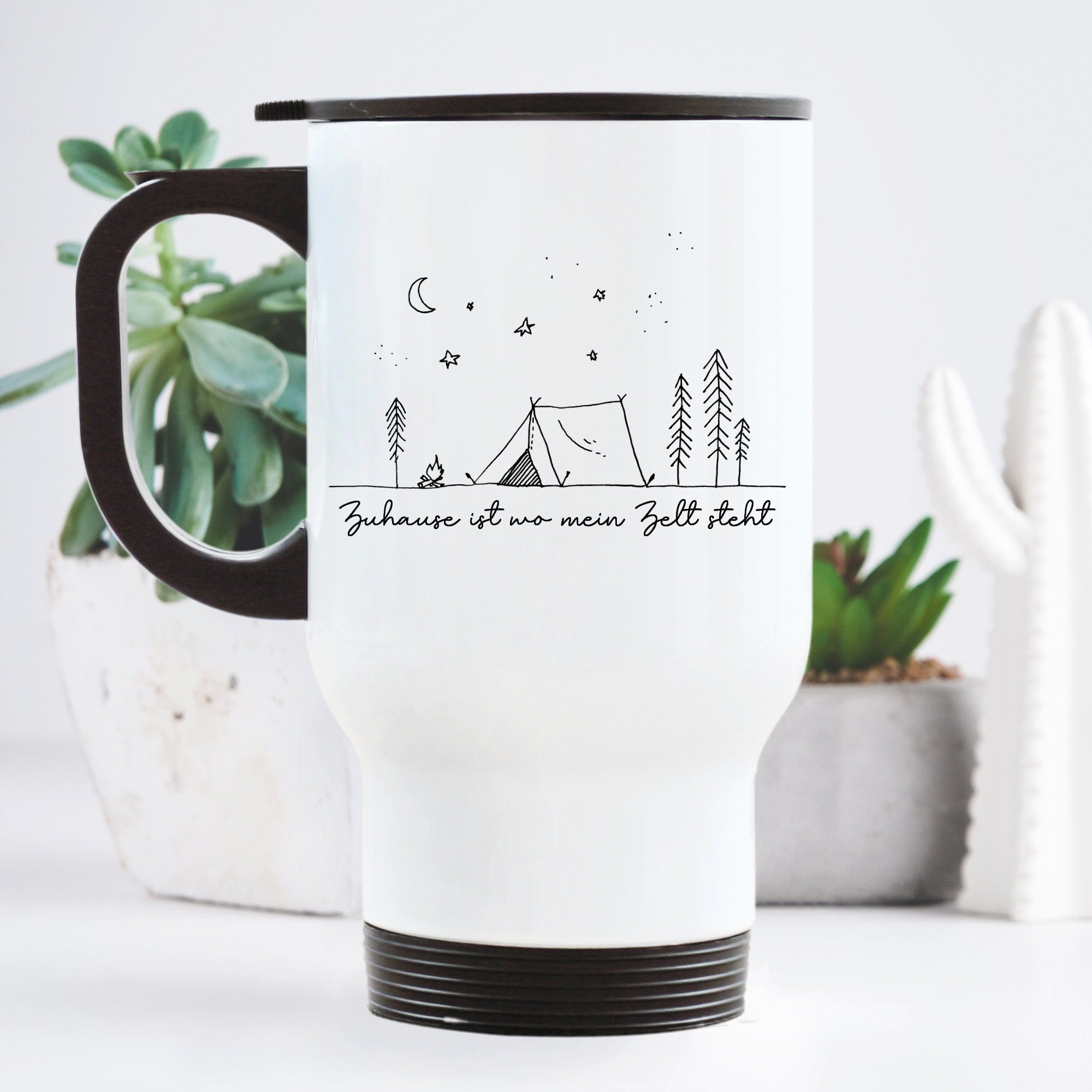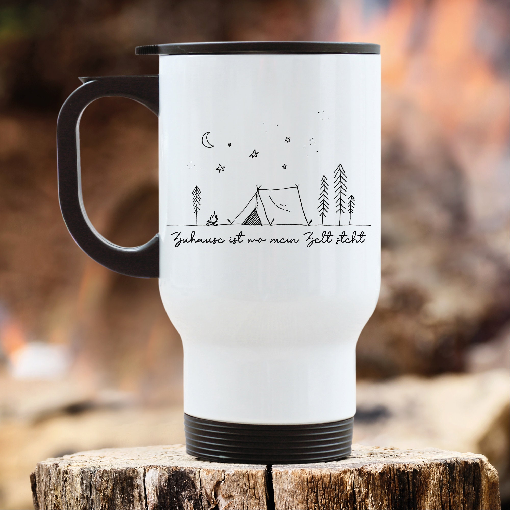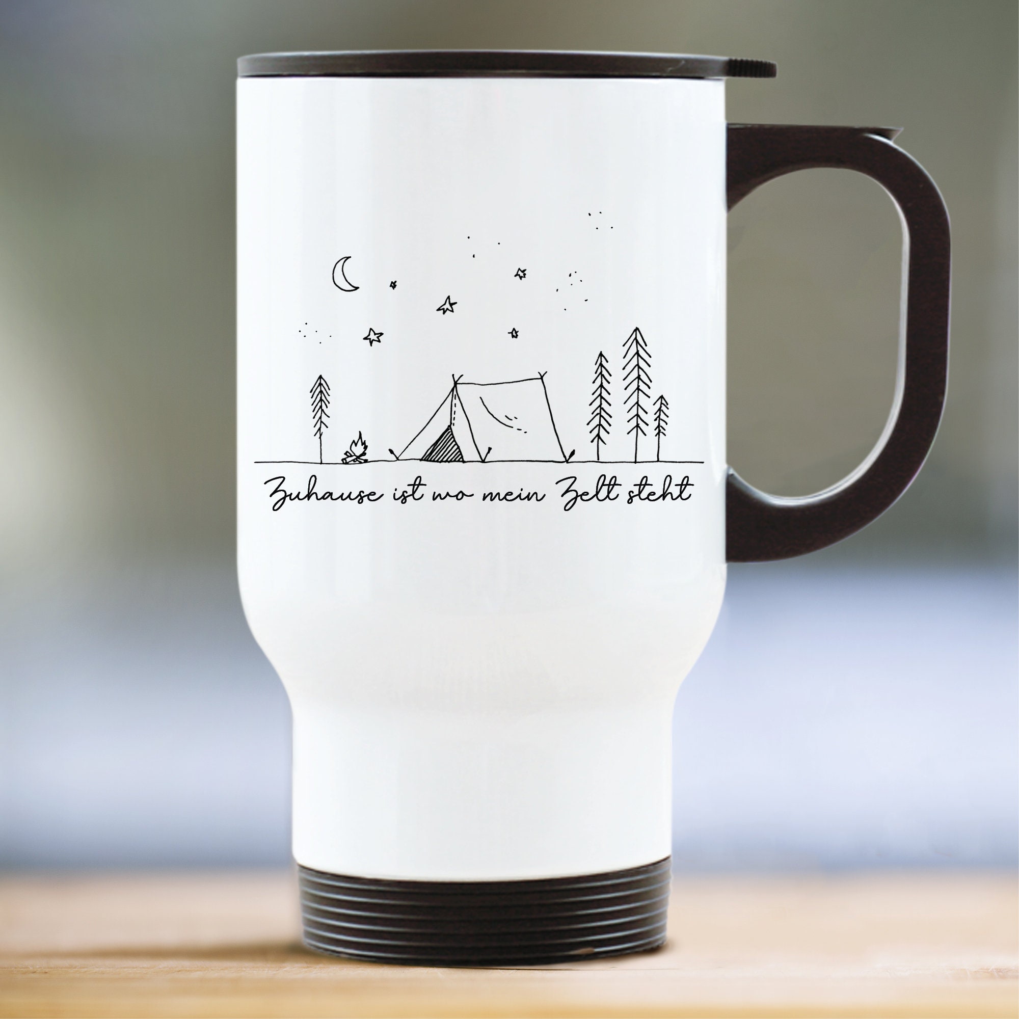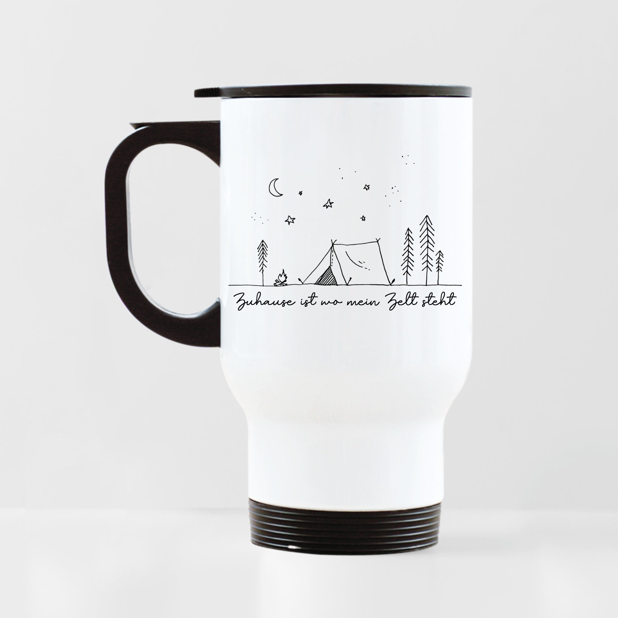 Thermobecher bedruckt mit Zelt und Bäumen unter dem Sternenhimmel und dem Spruch “Zuhause ist wo mein Zelt steht”.