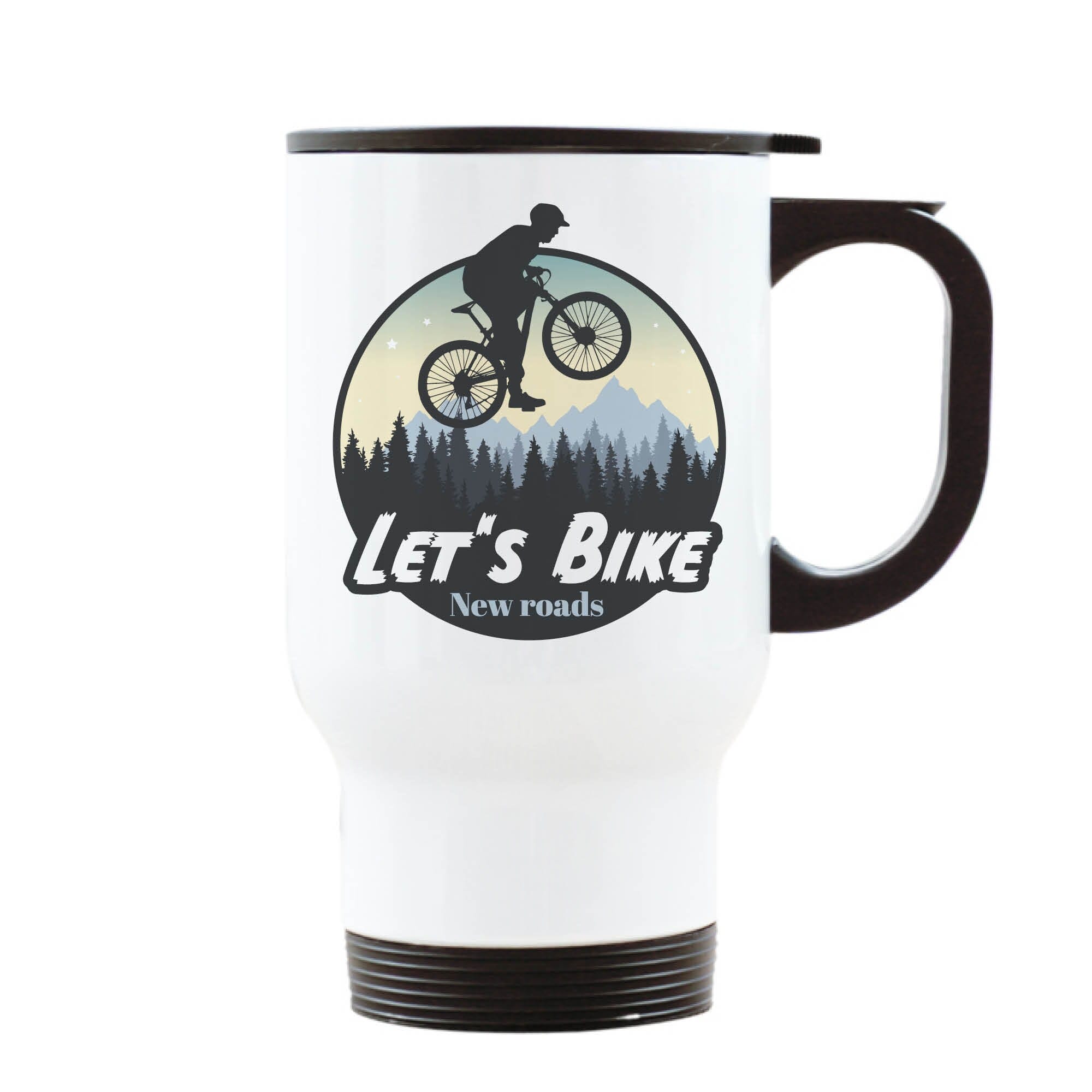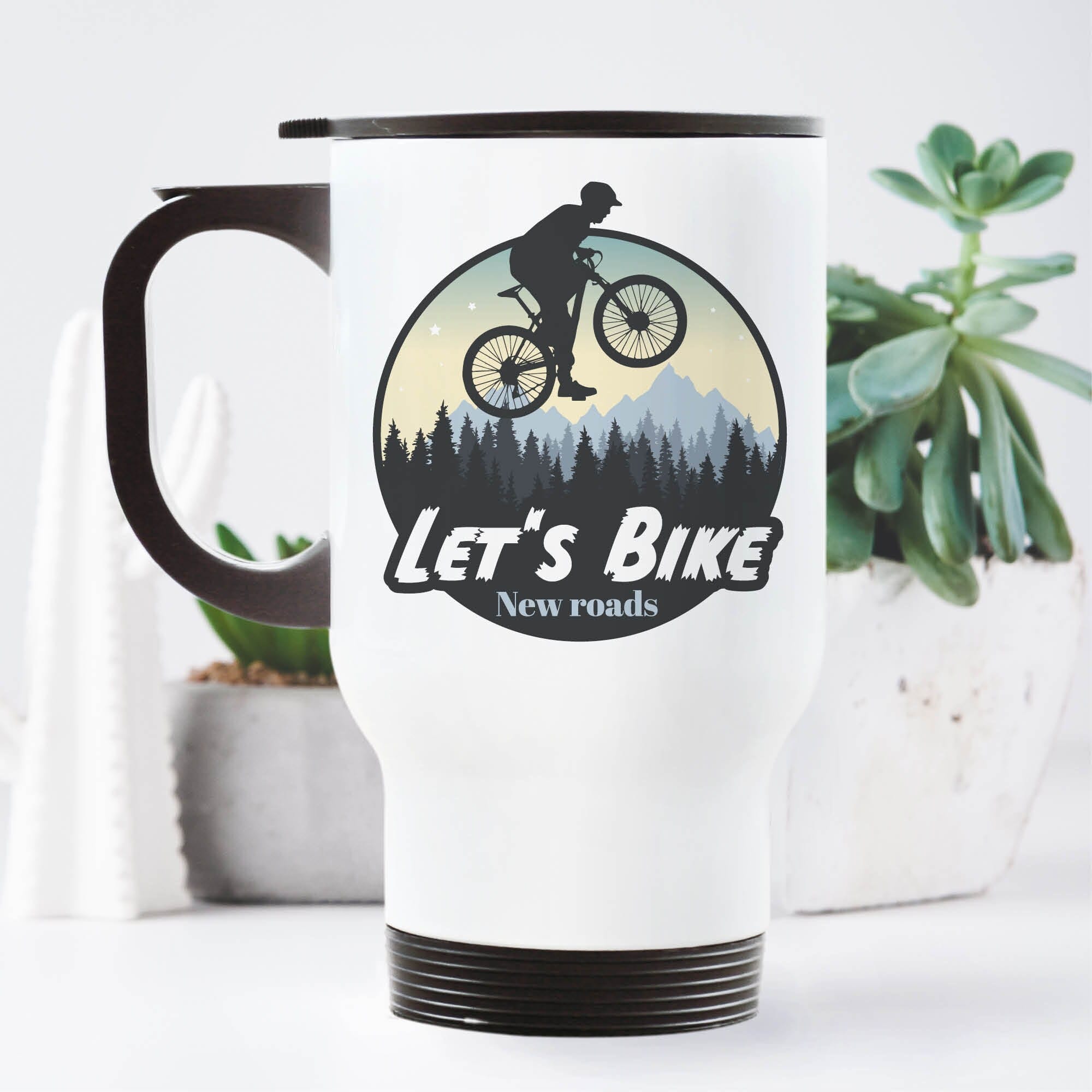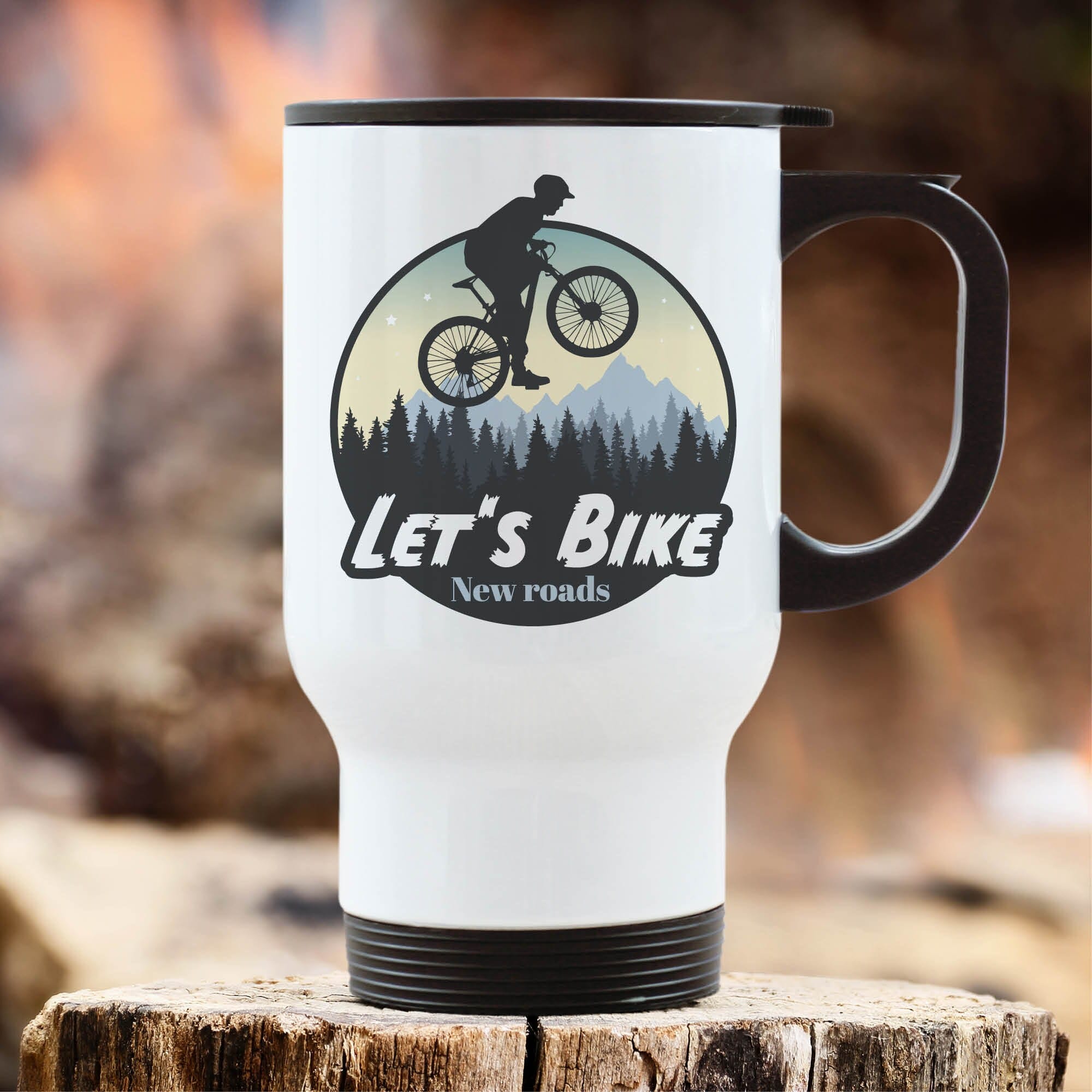 Thermobecher bedruckt Mountainbiker, Wald, Berge, Geschenk Geburtstag für Naturliebhaber