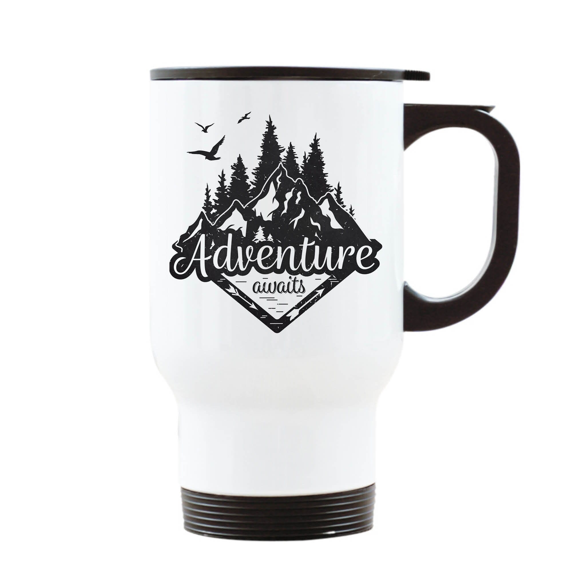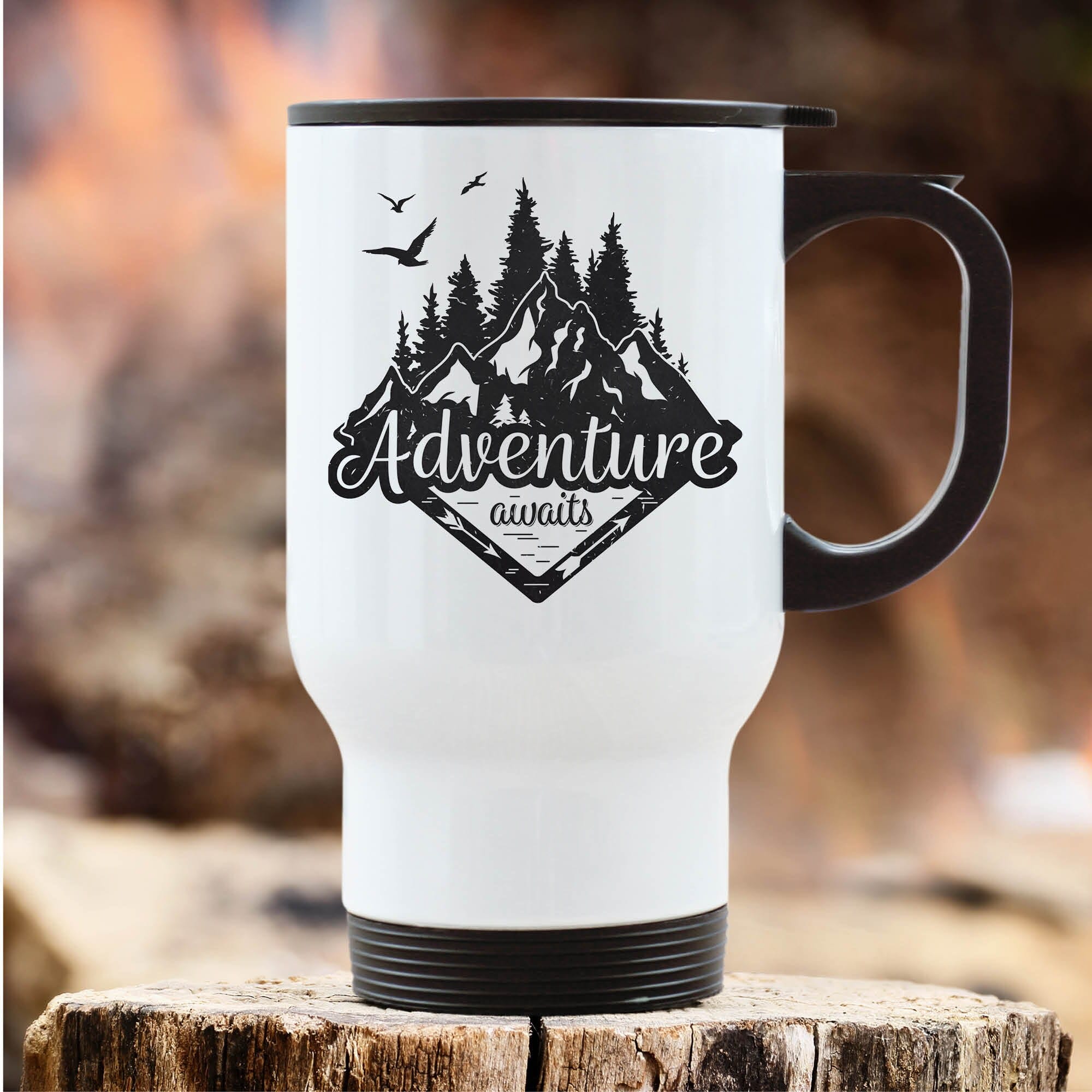 Thermobecher bedruckt Wald und Berge “Adventure awaits”, Geschenk Geburtstag