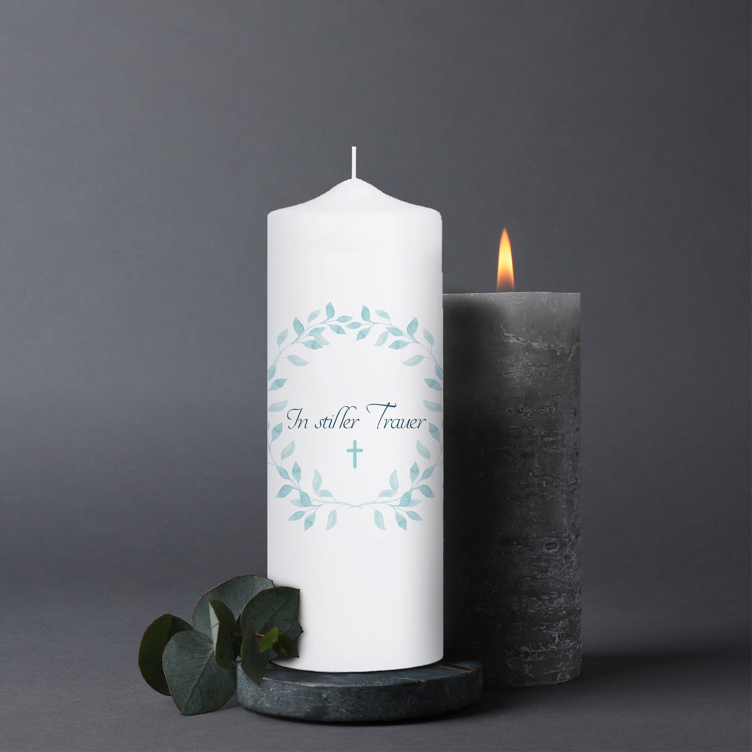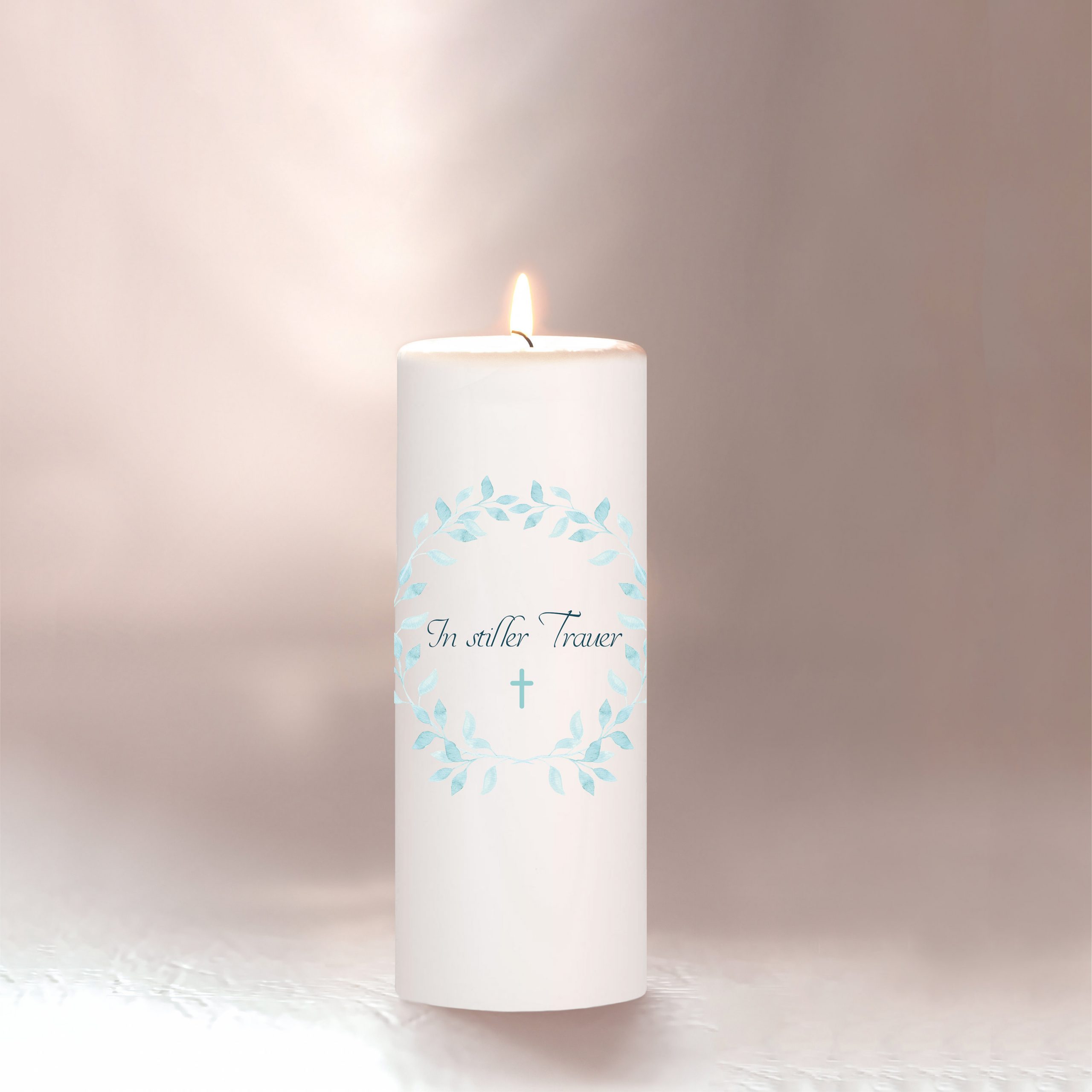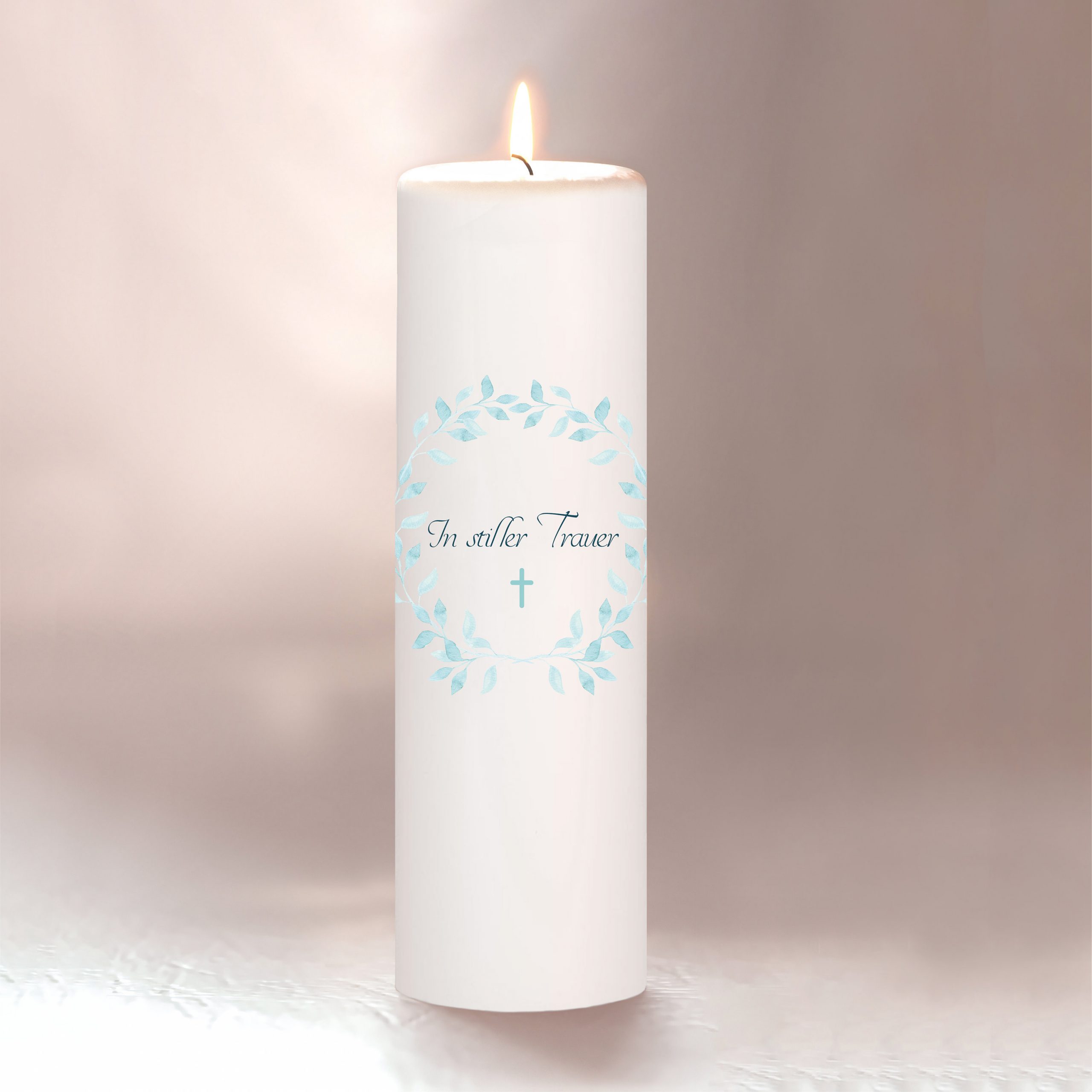 Trauerkerze Blumenkranz Blätterkranz mint hellblau Trauerspruch In stiller Trauer