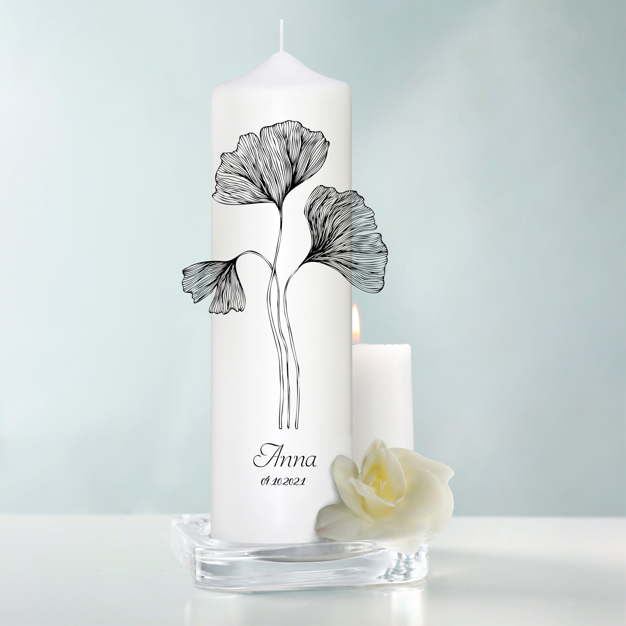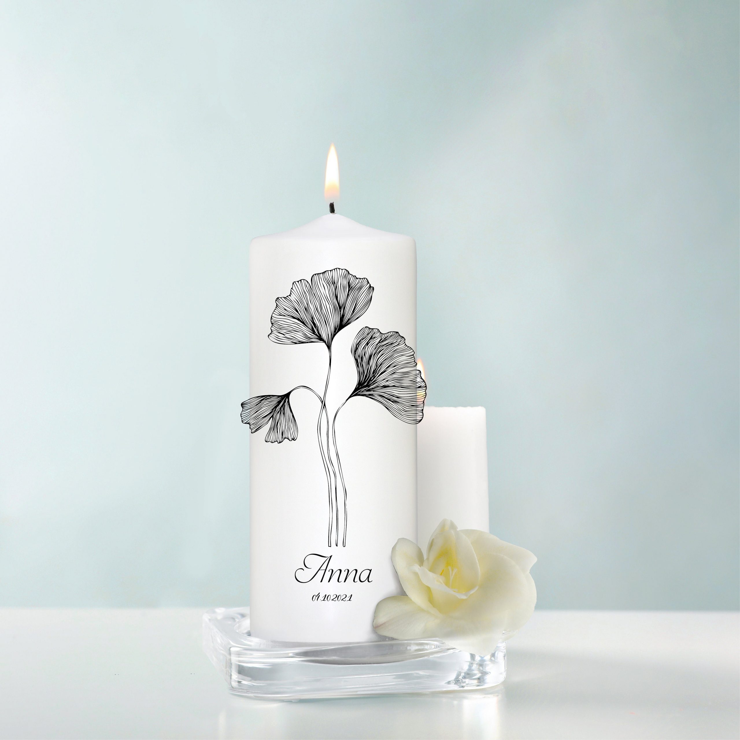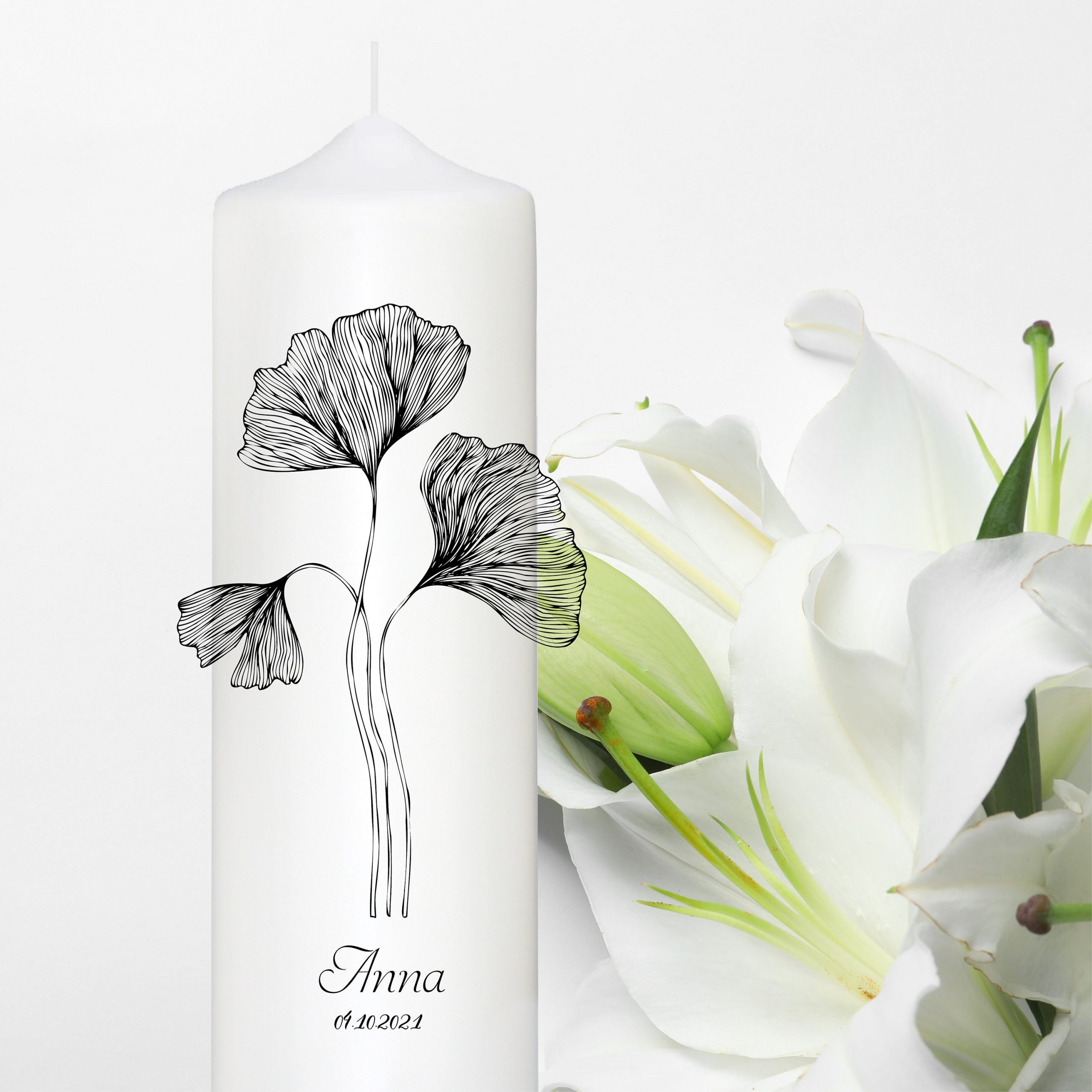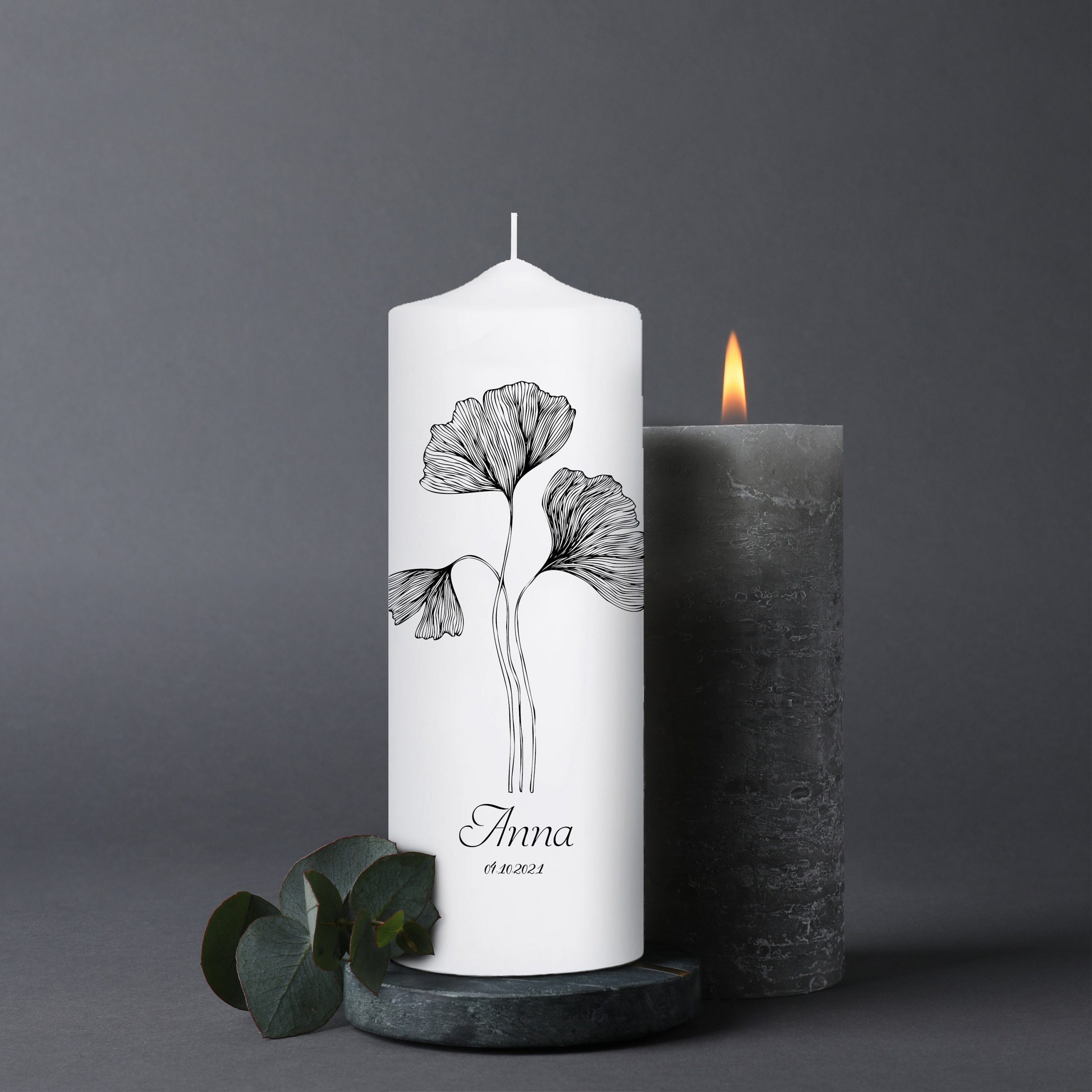 Trauerkerze schwarze filigrane Blume, personalisiert mit Namen und Datum