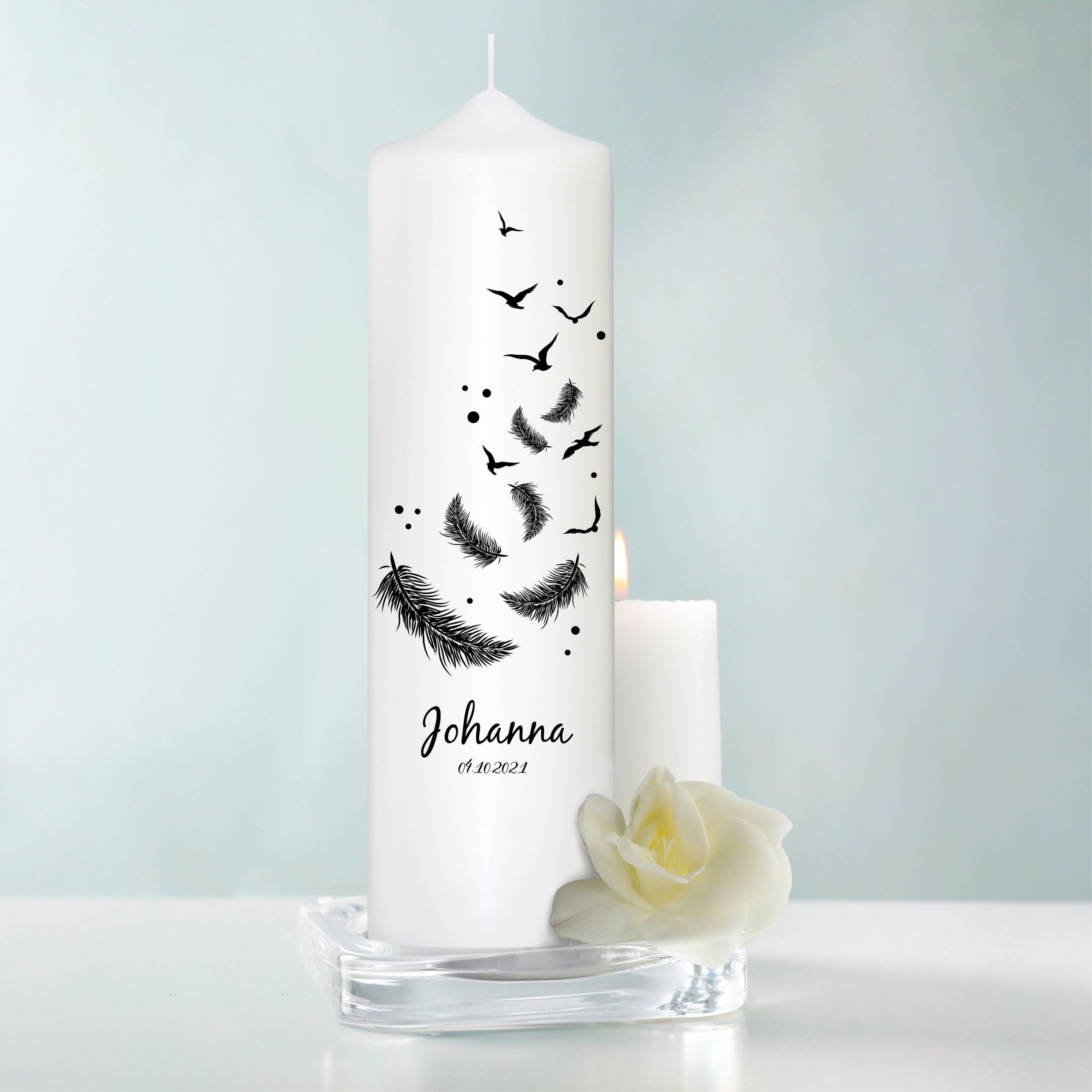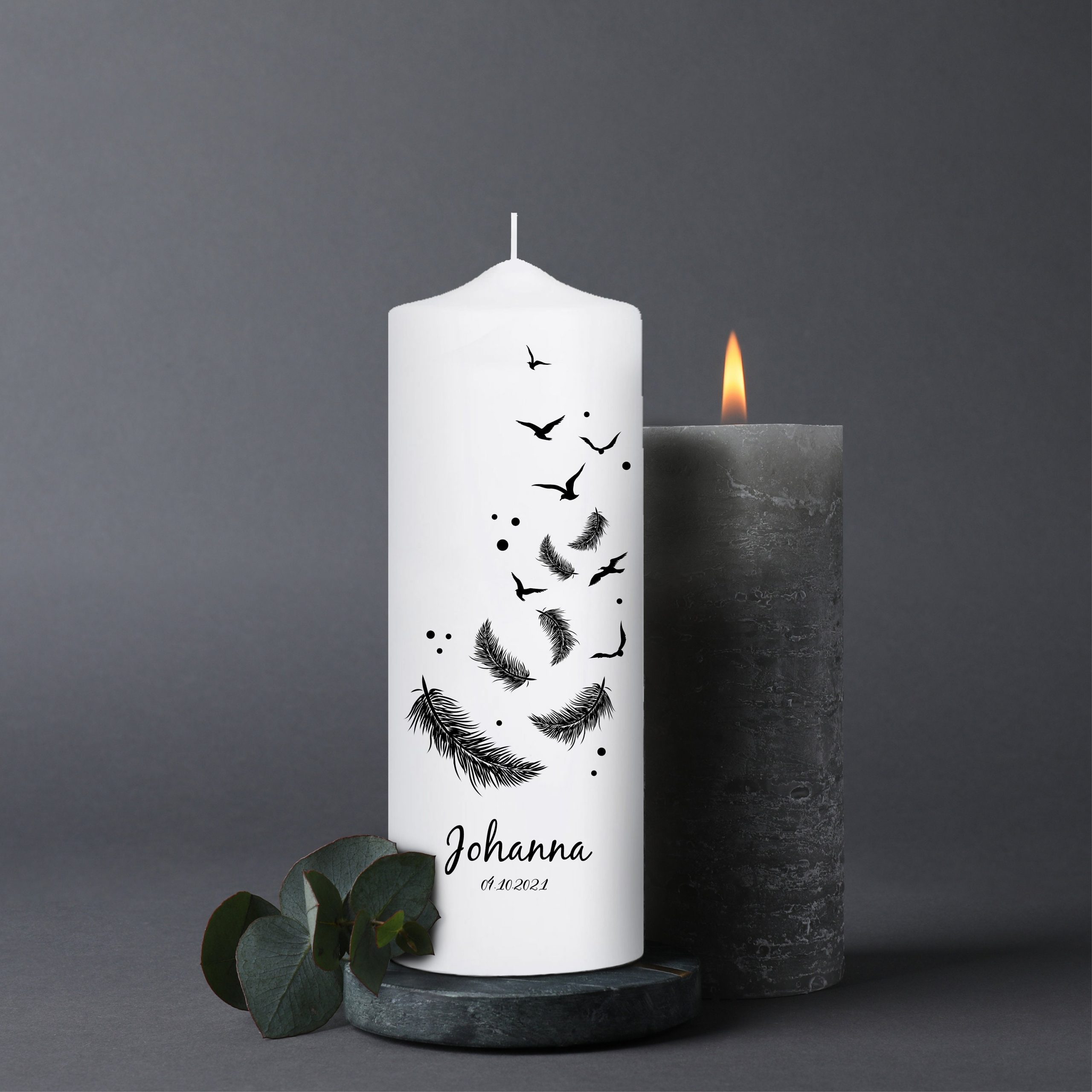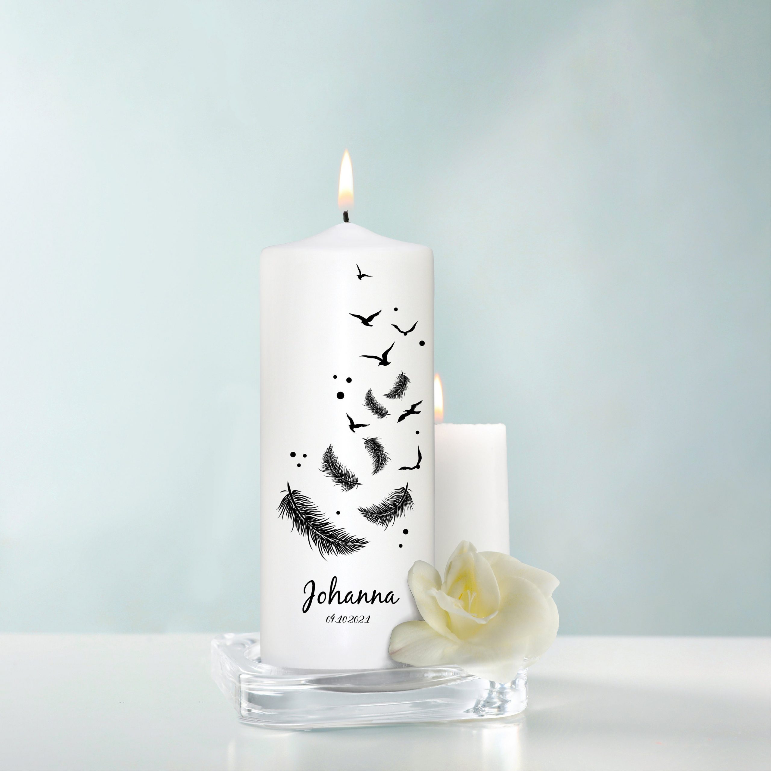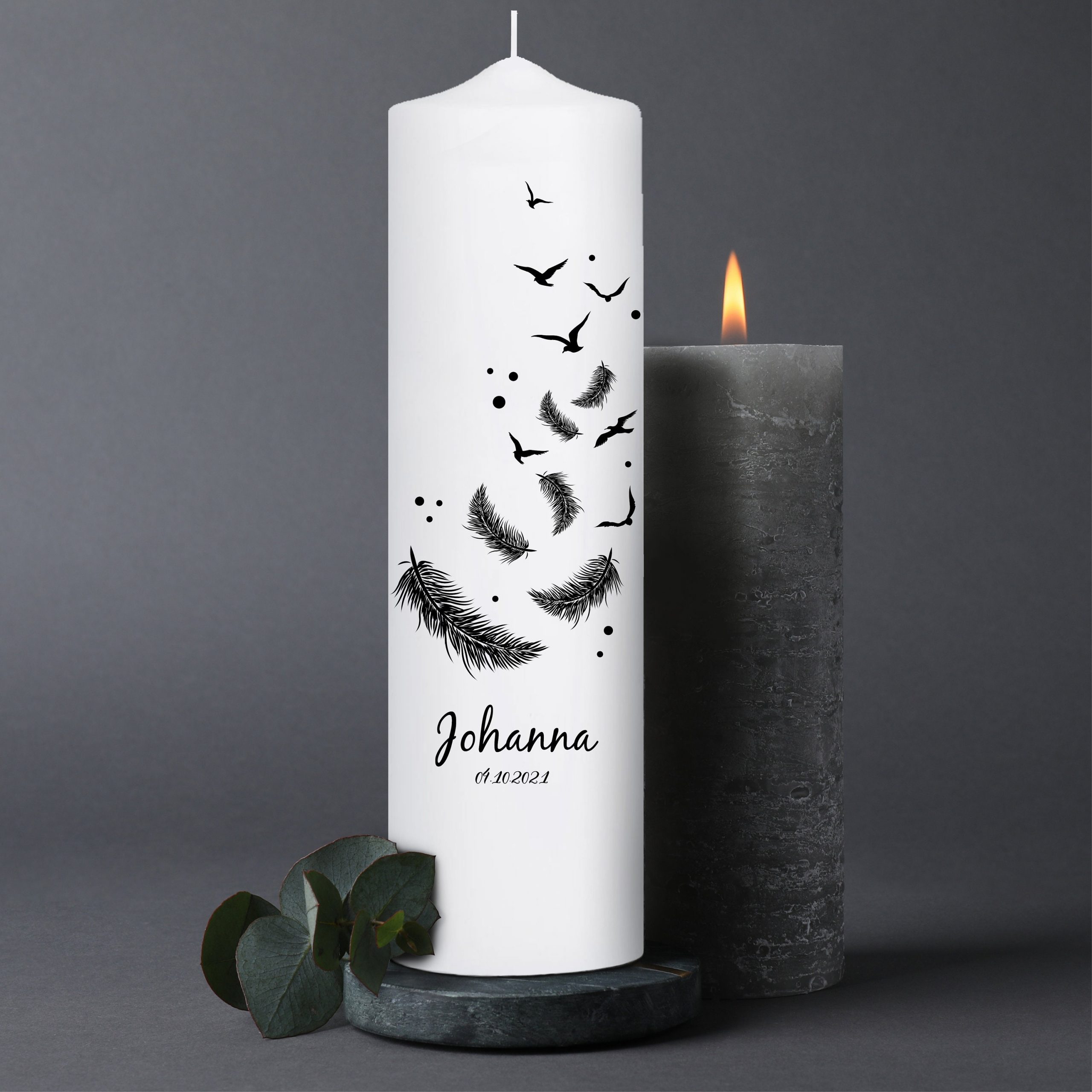 Trauerkerze Vögel und Federn, personalisiert mit Namen und Datum