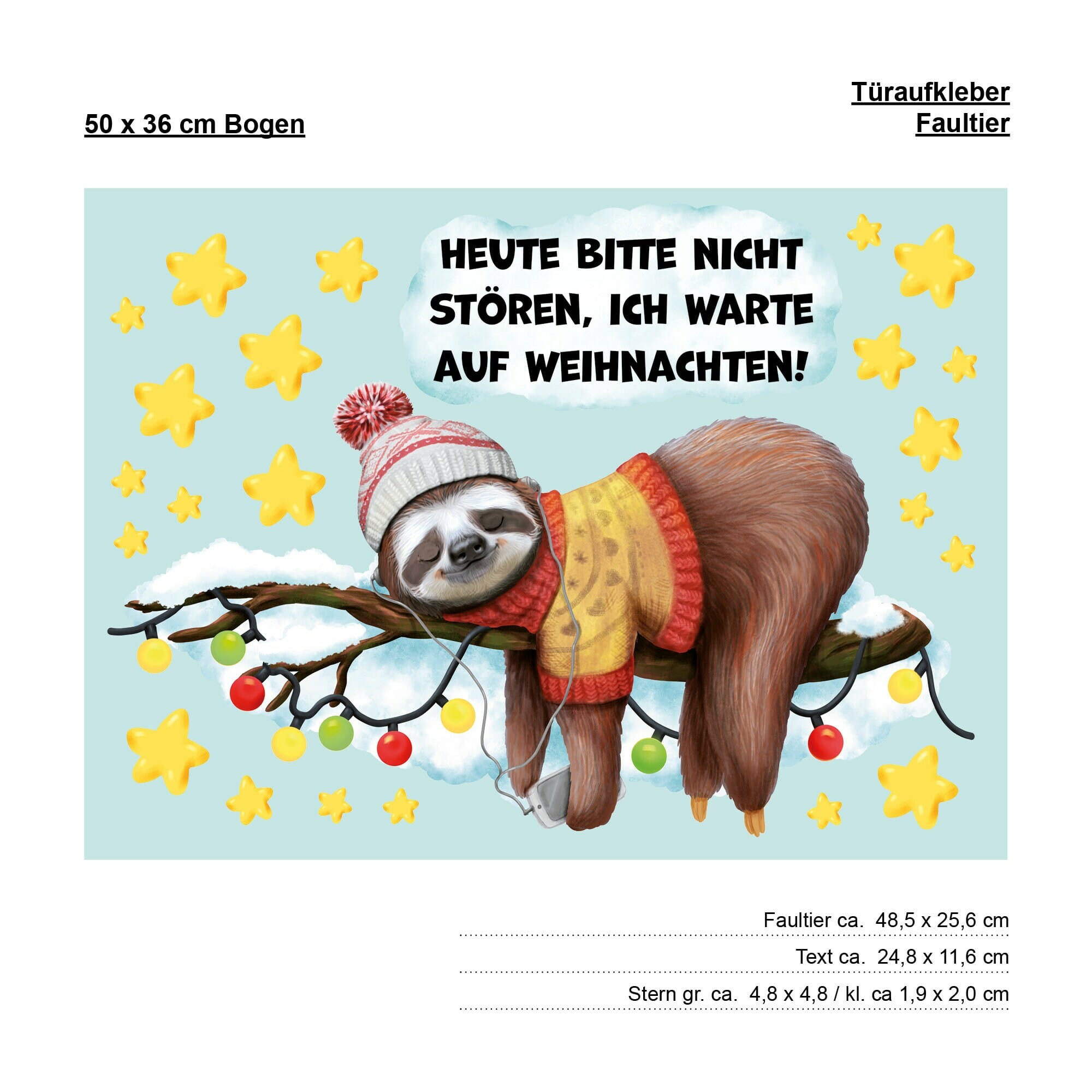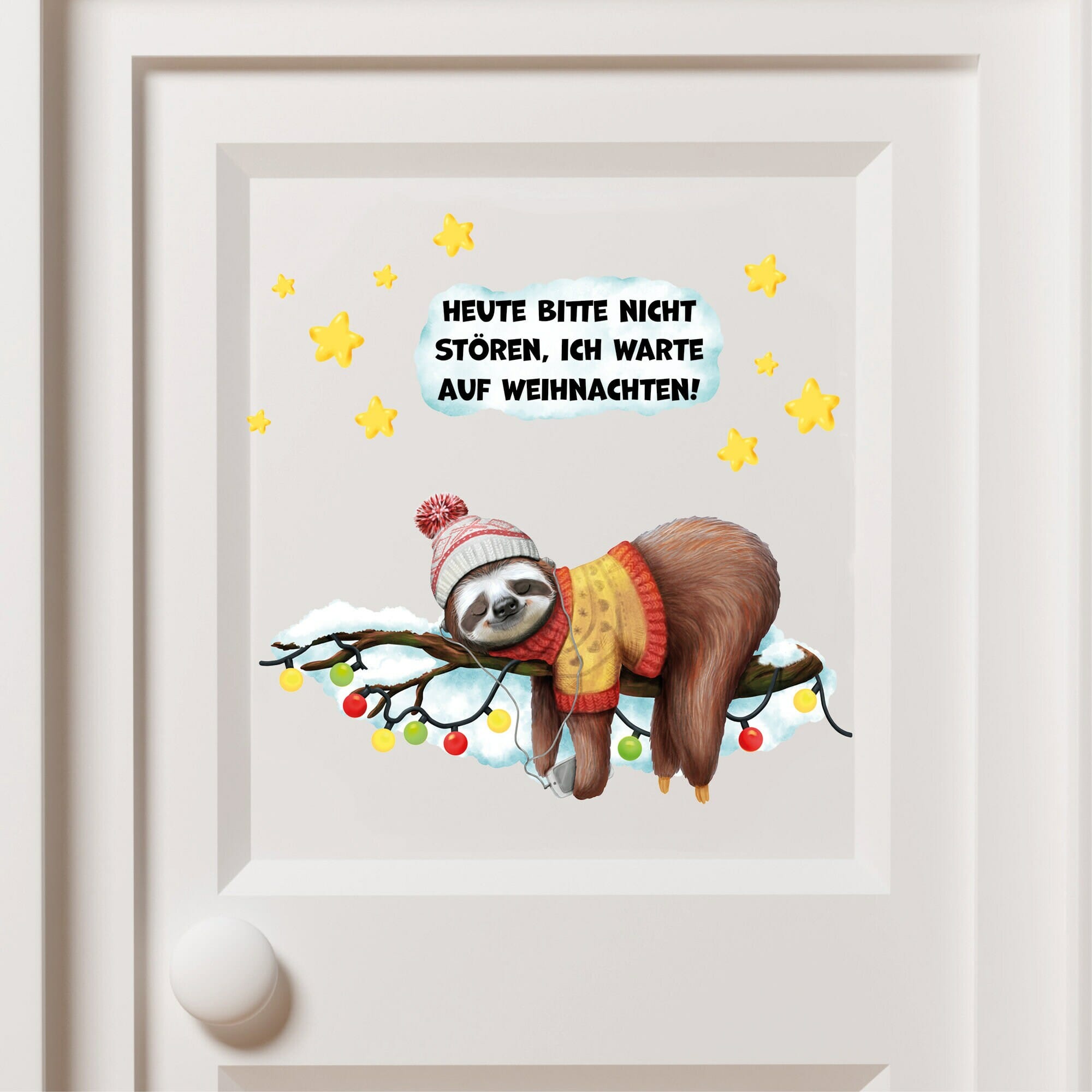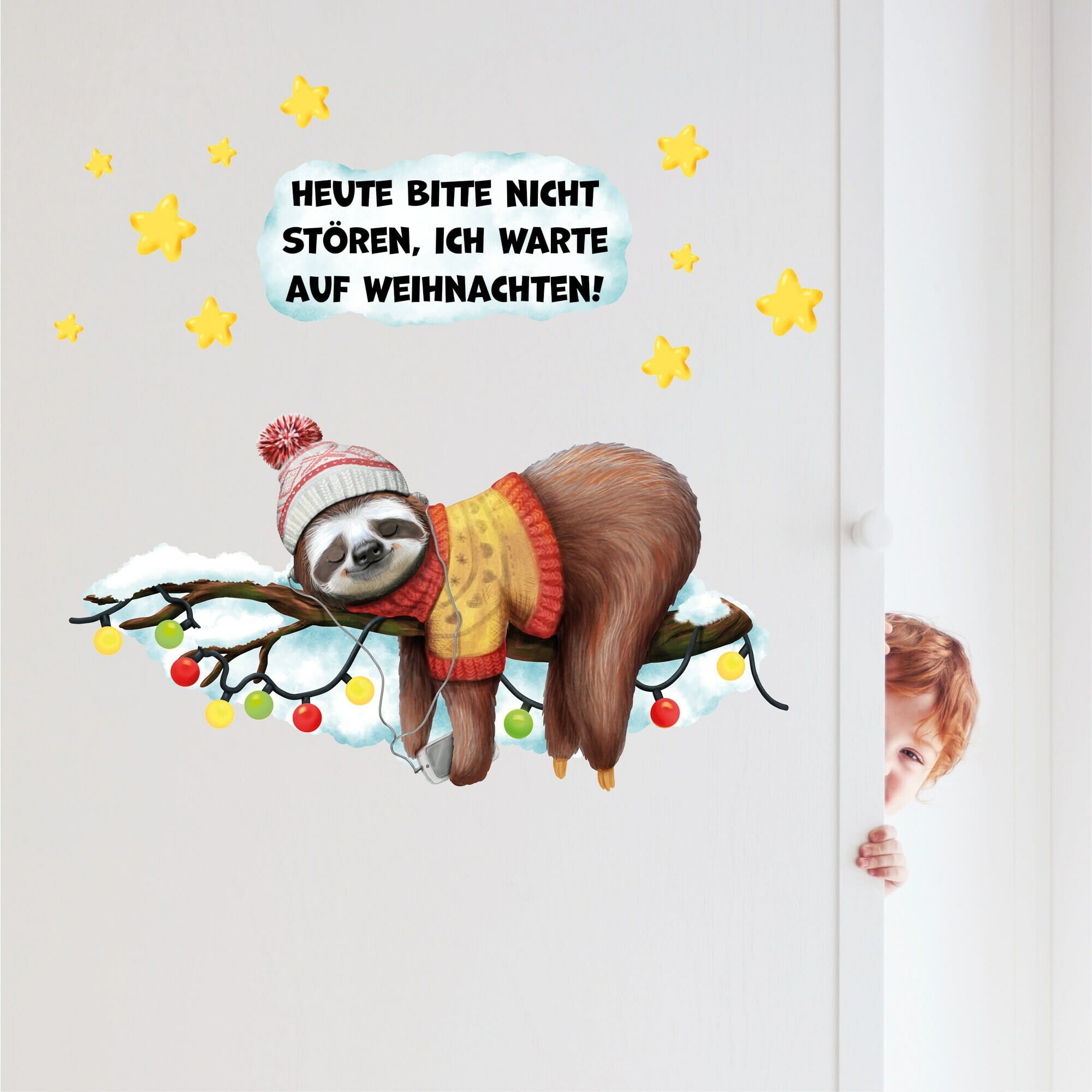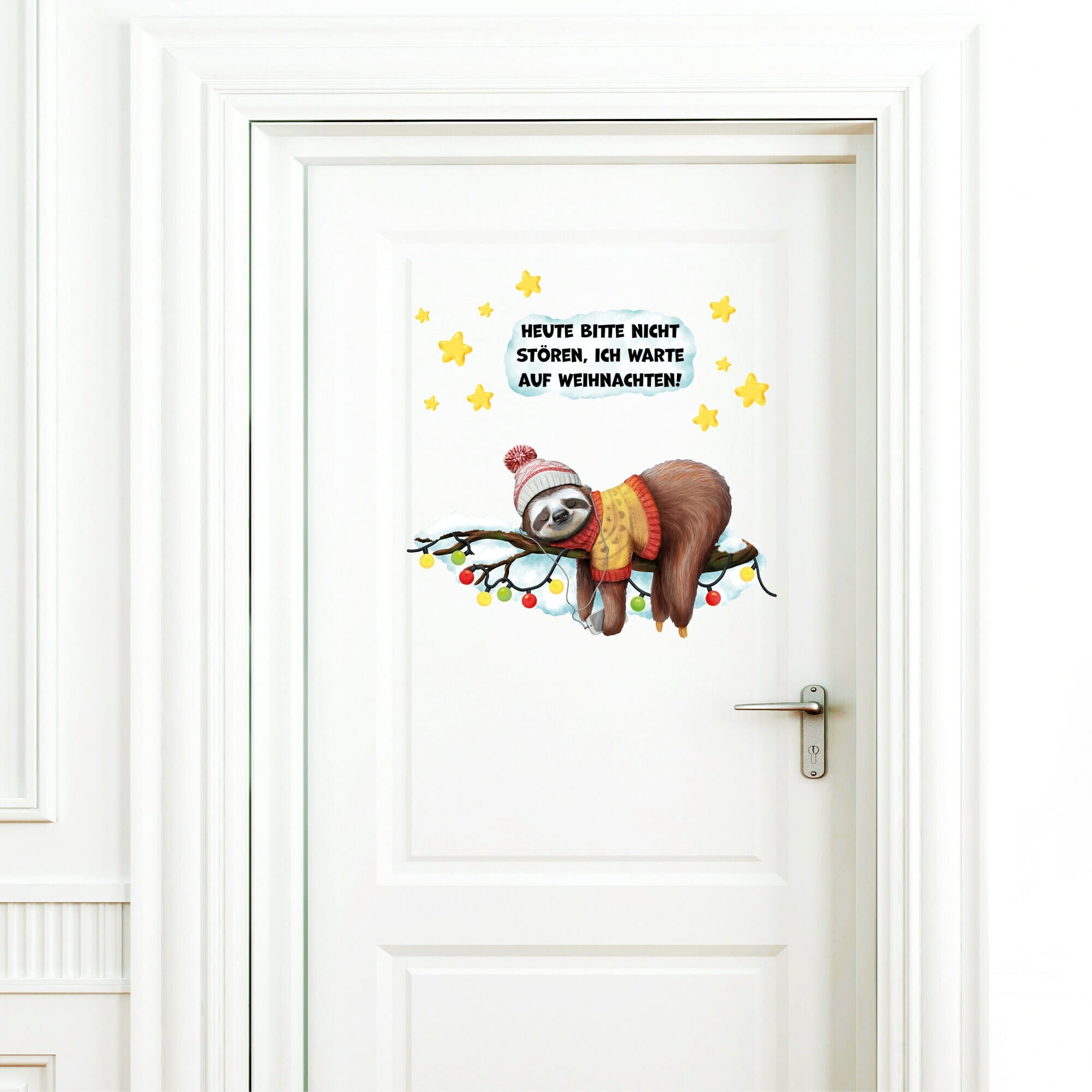 Türaufkleber Wandtattoo Faultier auf Ast mit Lichterkette und Sternen “Bitte nicht stören, ich warte auf Weihnachten!”, Kinderzimmer Sticker Kind