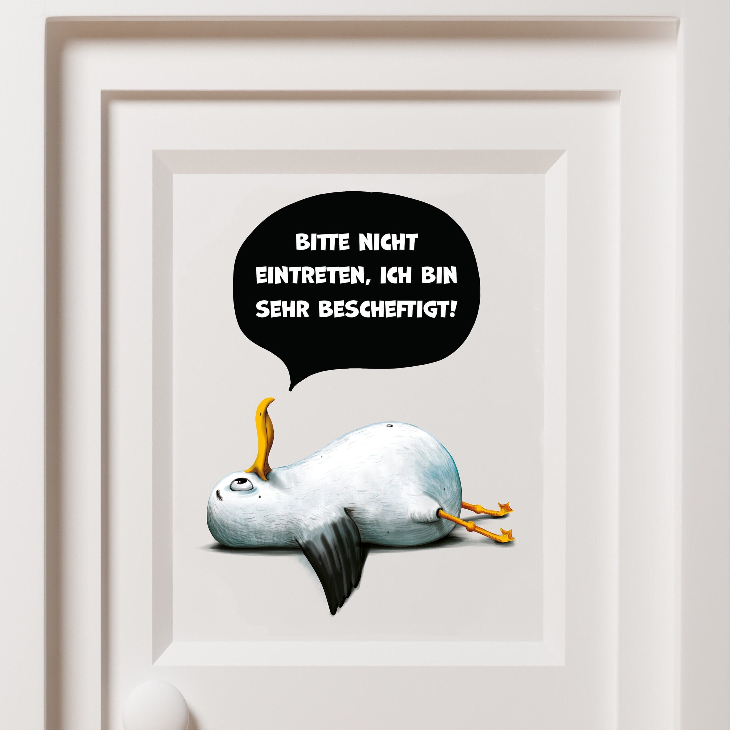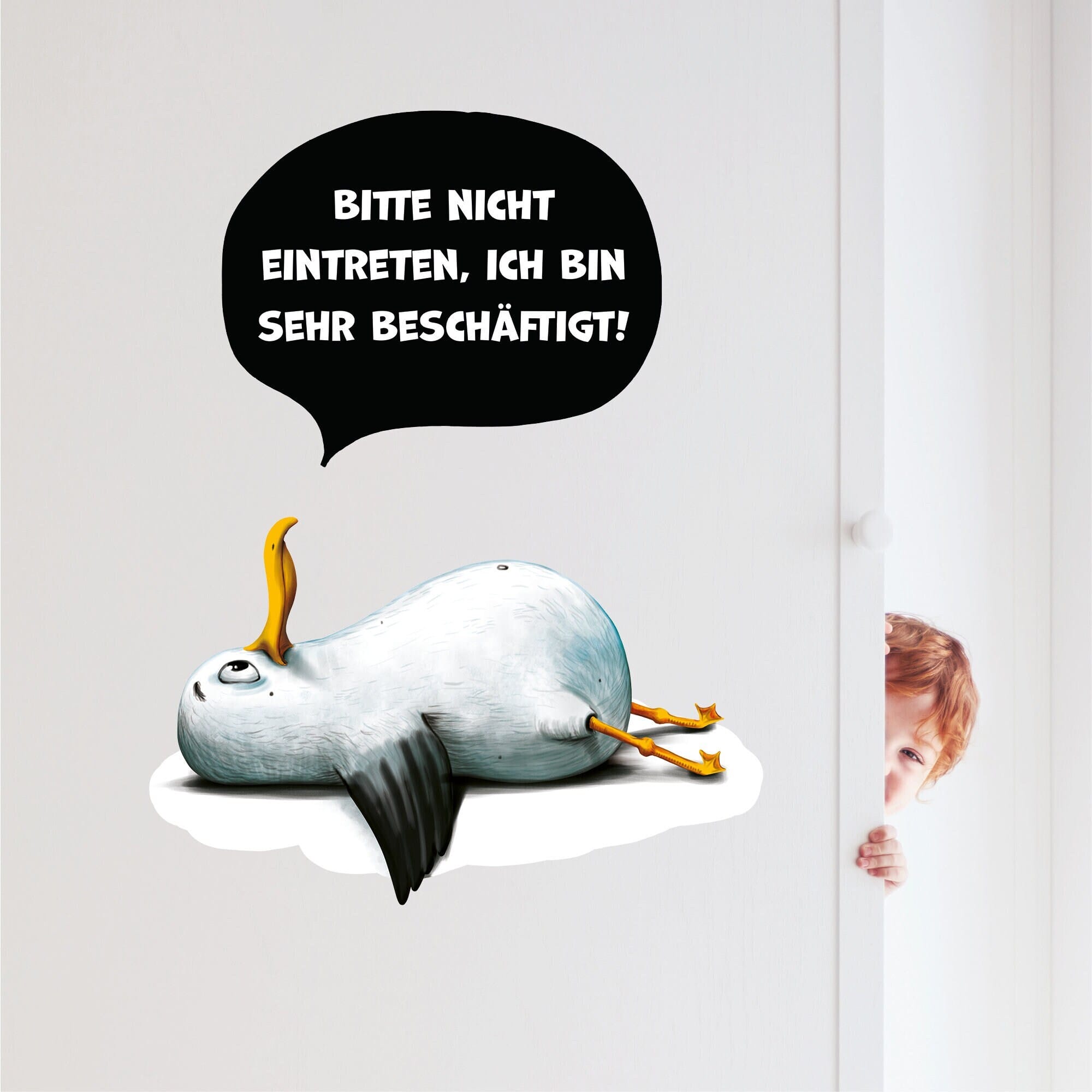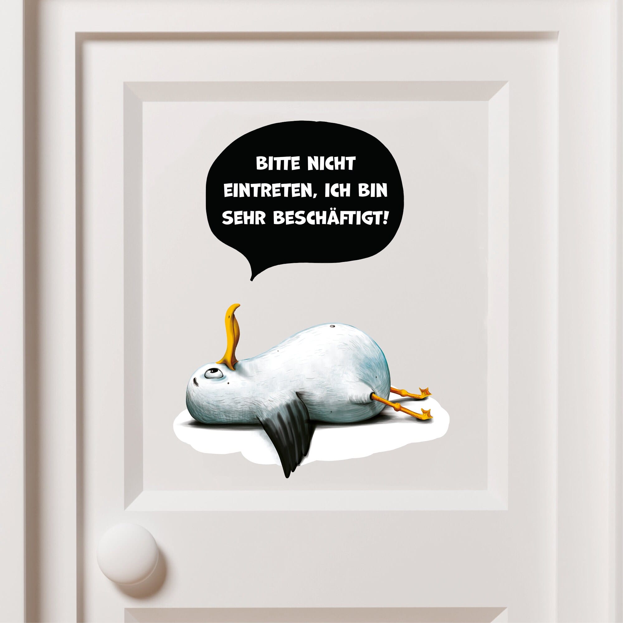 Türaufkleber Wandtattoo liegende Möwe mit Spruch “Bitte nicht eintreten, ich bin sehr beschäftigt!”, Kinderzimmer Sticker Kind