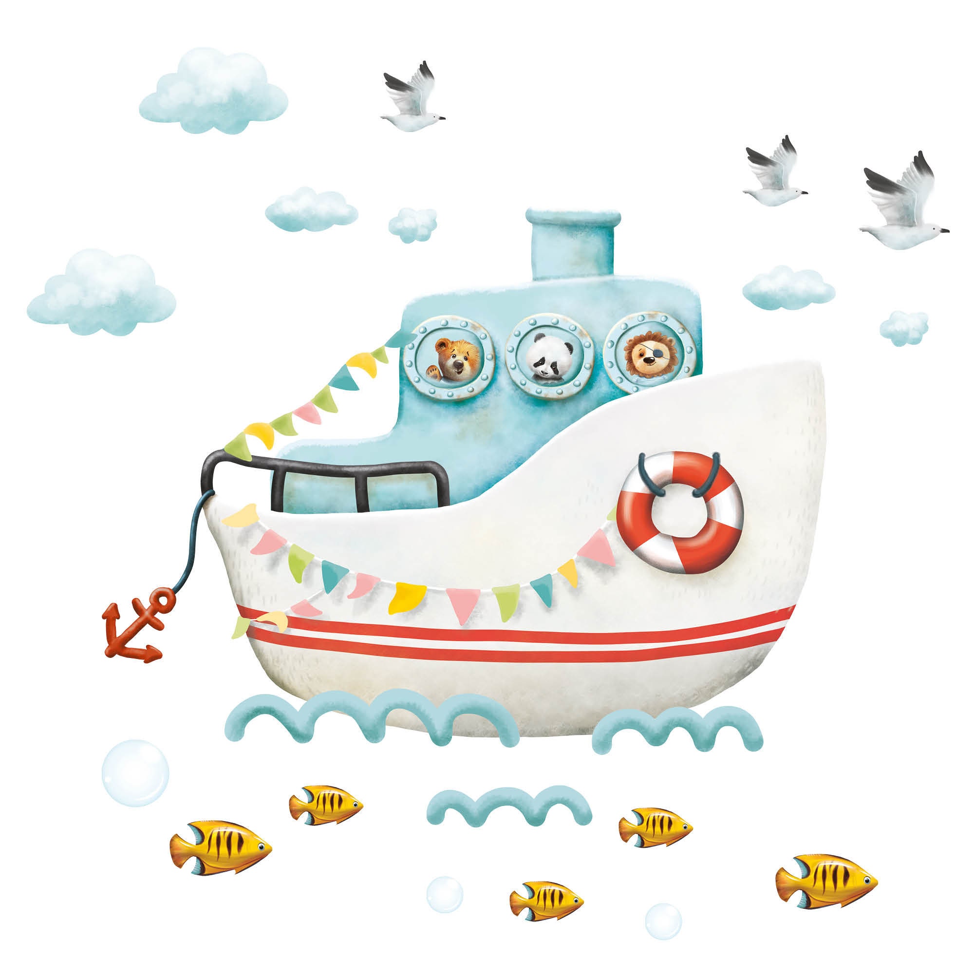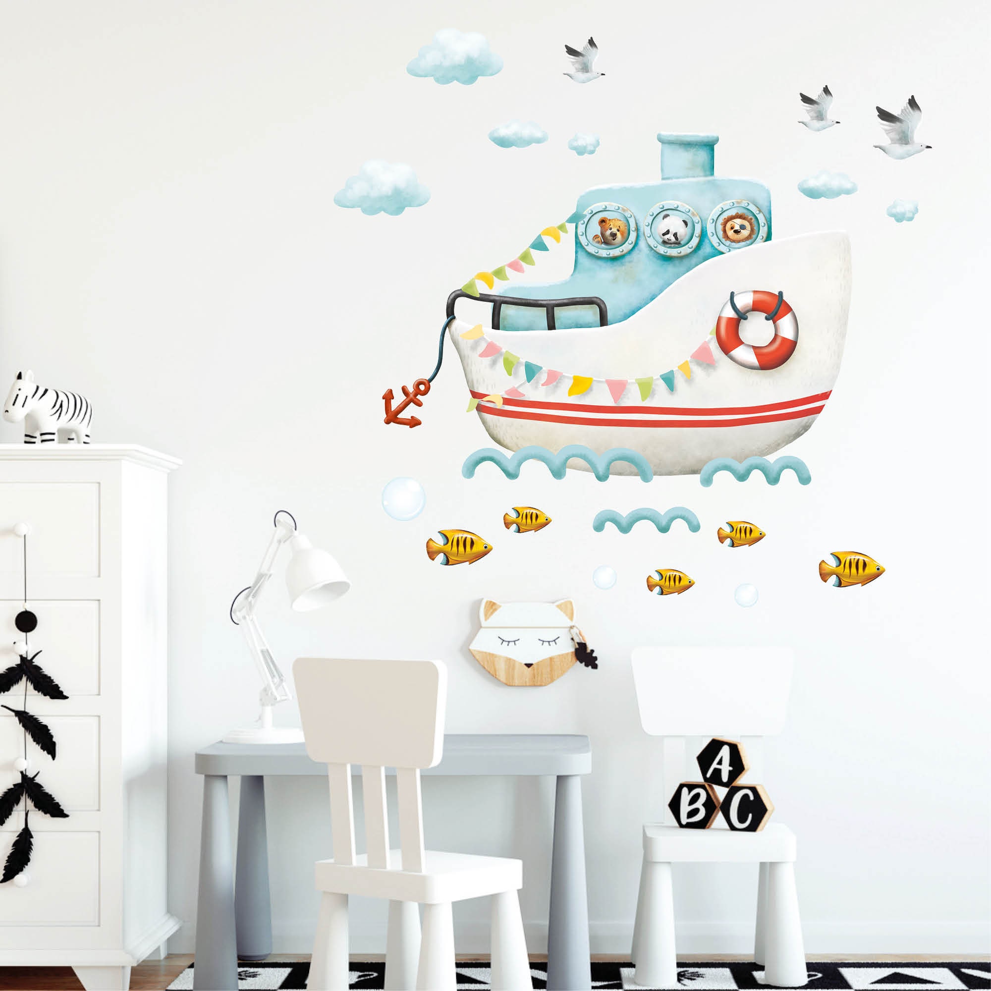 Wandtattoo Kinderzimmer Boot Schiff mit Tieren, Dekoration Babyzimmer