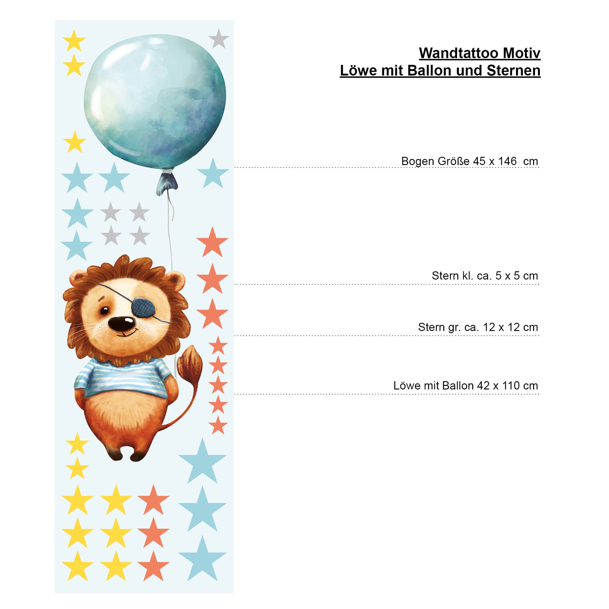 Dieses Wandtattoo zeigt einen zauberhaft illustrierten Löwen mit einem Luftballon- handgezeichnet. Das Motiv sorgt für einen tollen Hingucker in jedem Kinderzimmer oder Babyzimmer. Schaffe mit nur wenig Aufwand für Dein Kind eine Welt zum Träumen und Wohlfühlen! Die verschieden farbenen Sterne können einzeln vom Trägerpapier abgezogen und beliebig aufgeklebt werden.