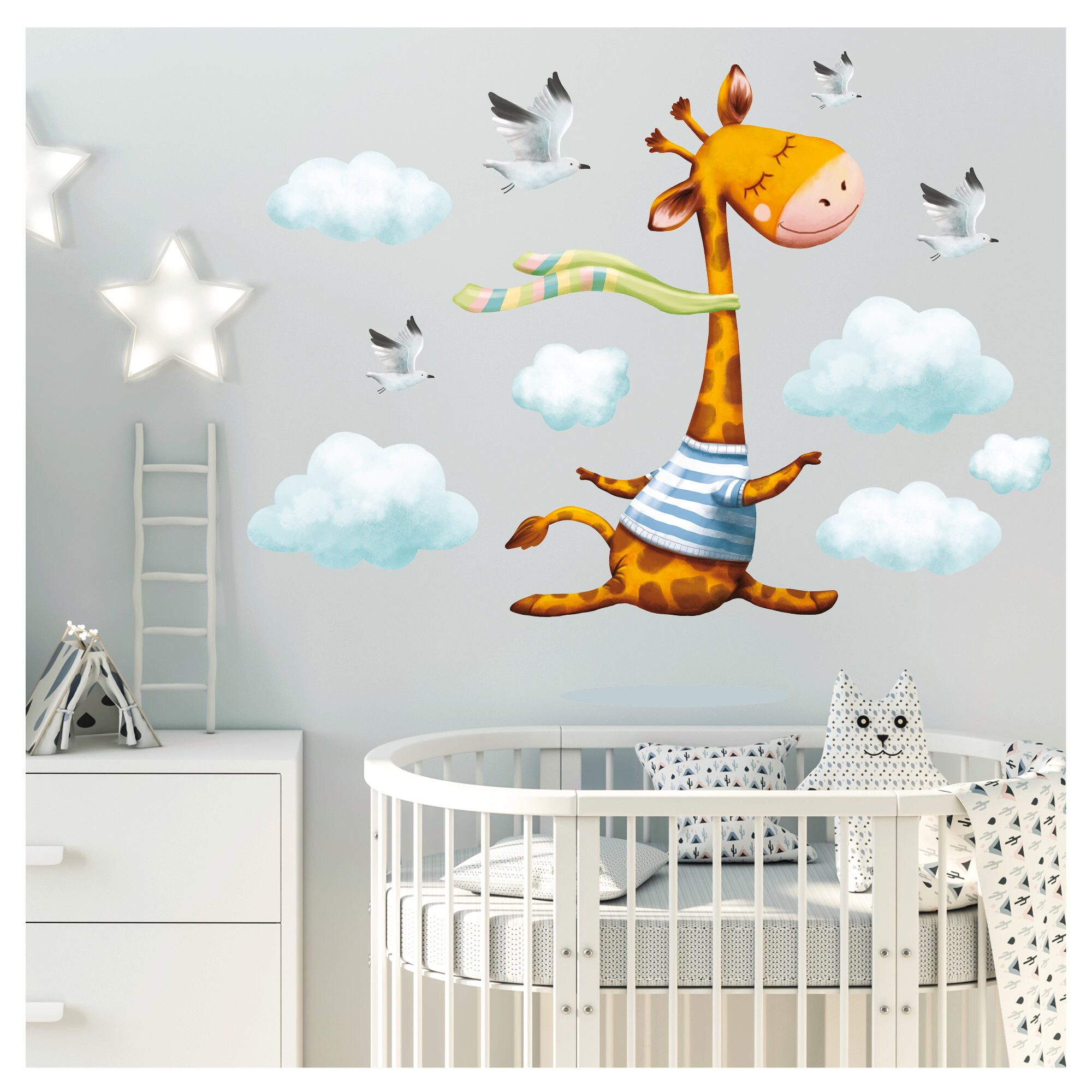 Wandtattoo Kinderzimmer bunt Mädchen Junge Giraffe Wolken Möwen Vögel Dekoration Babyzimmer blau