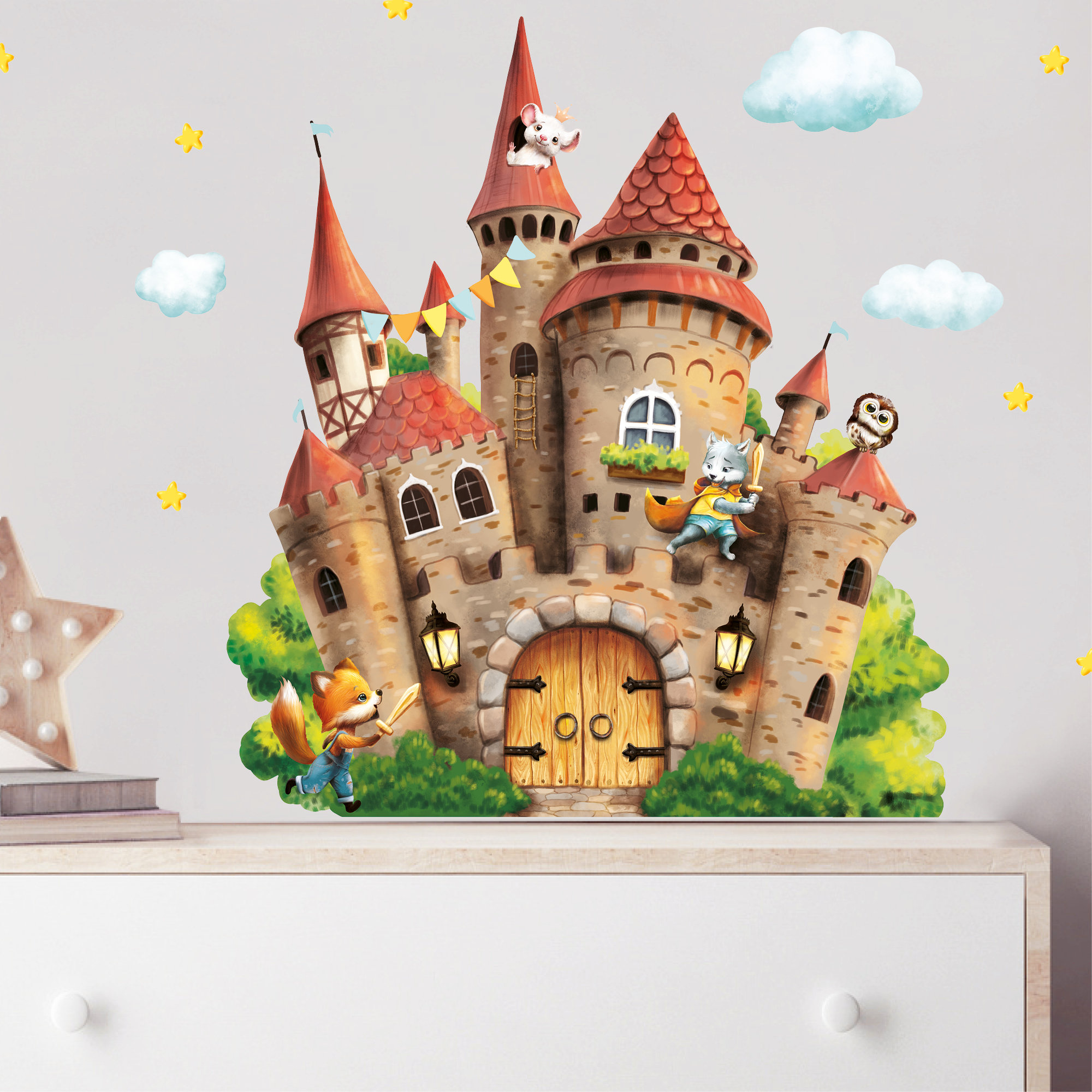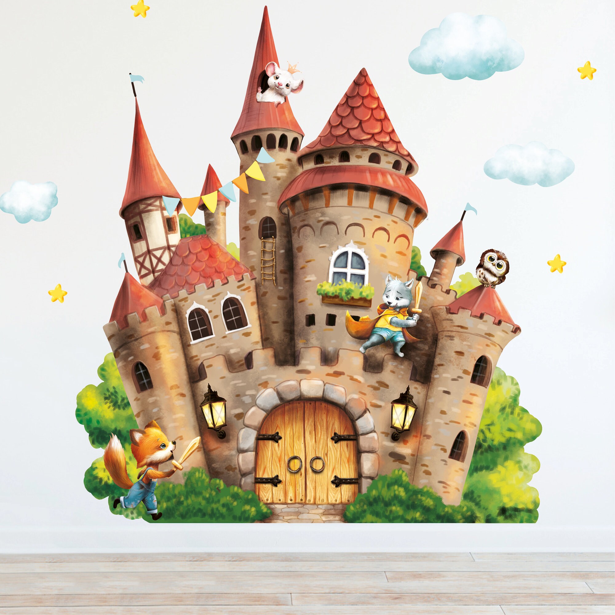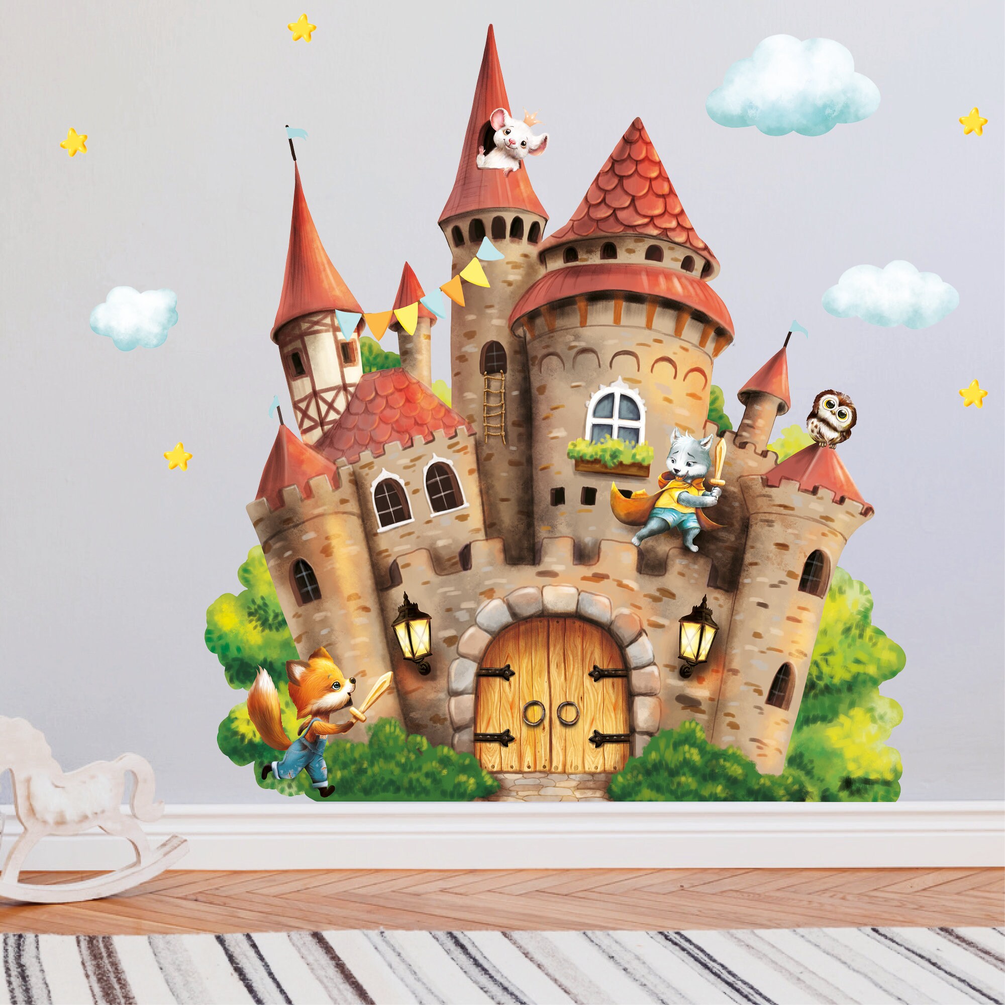 Wandtattoo Kinderzimmer Burg mit Wolf Fuchs Maus Wolken Mäusetür Kinderzimmerdeko Babyzimmer