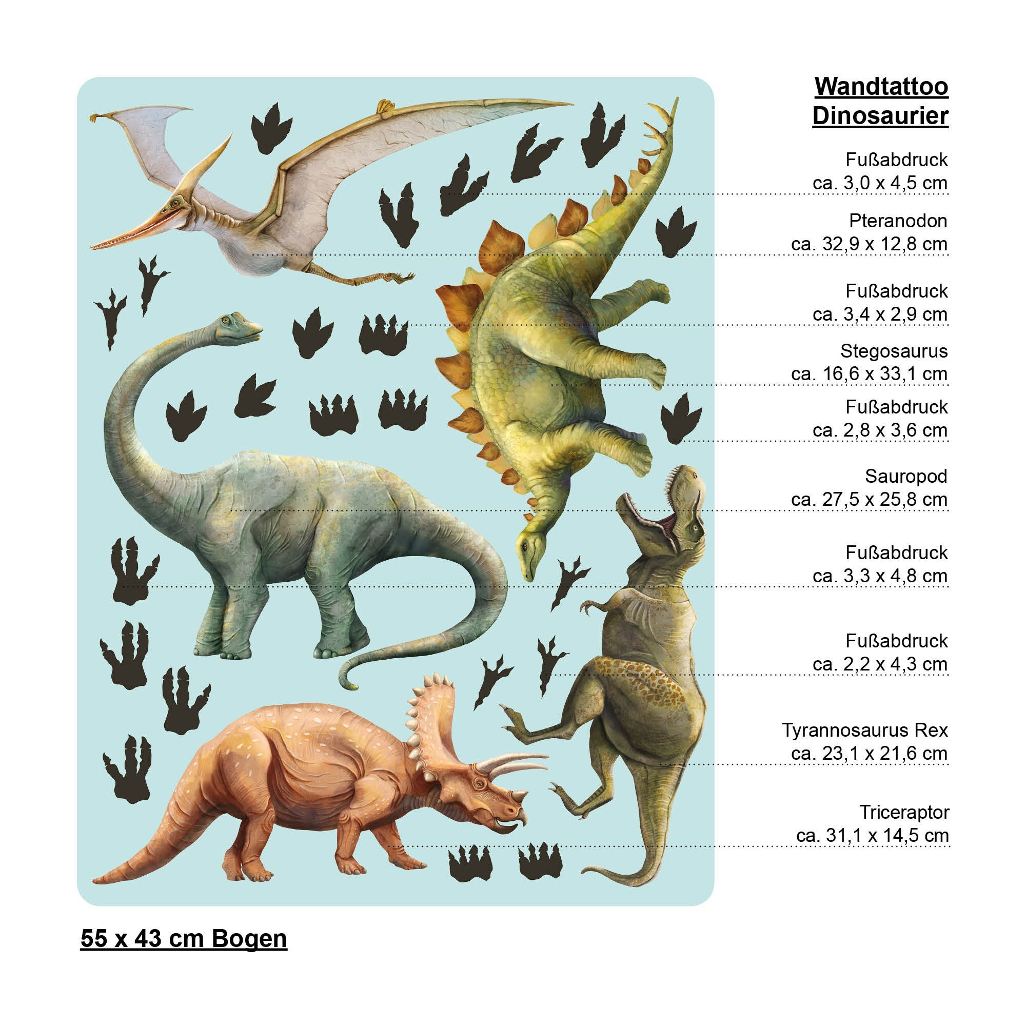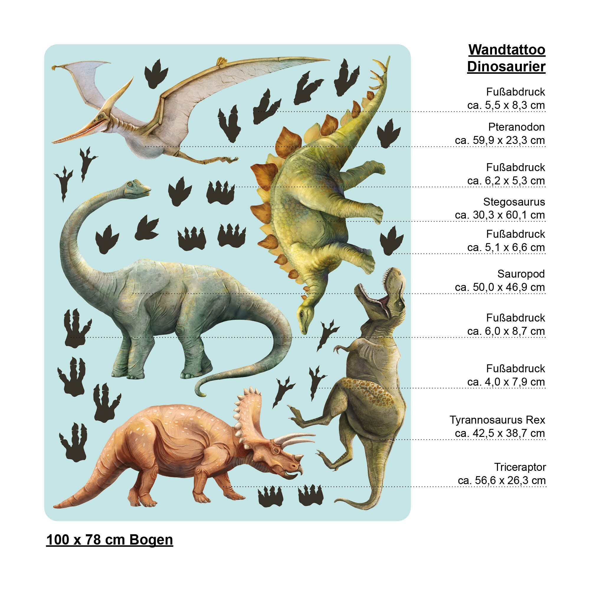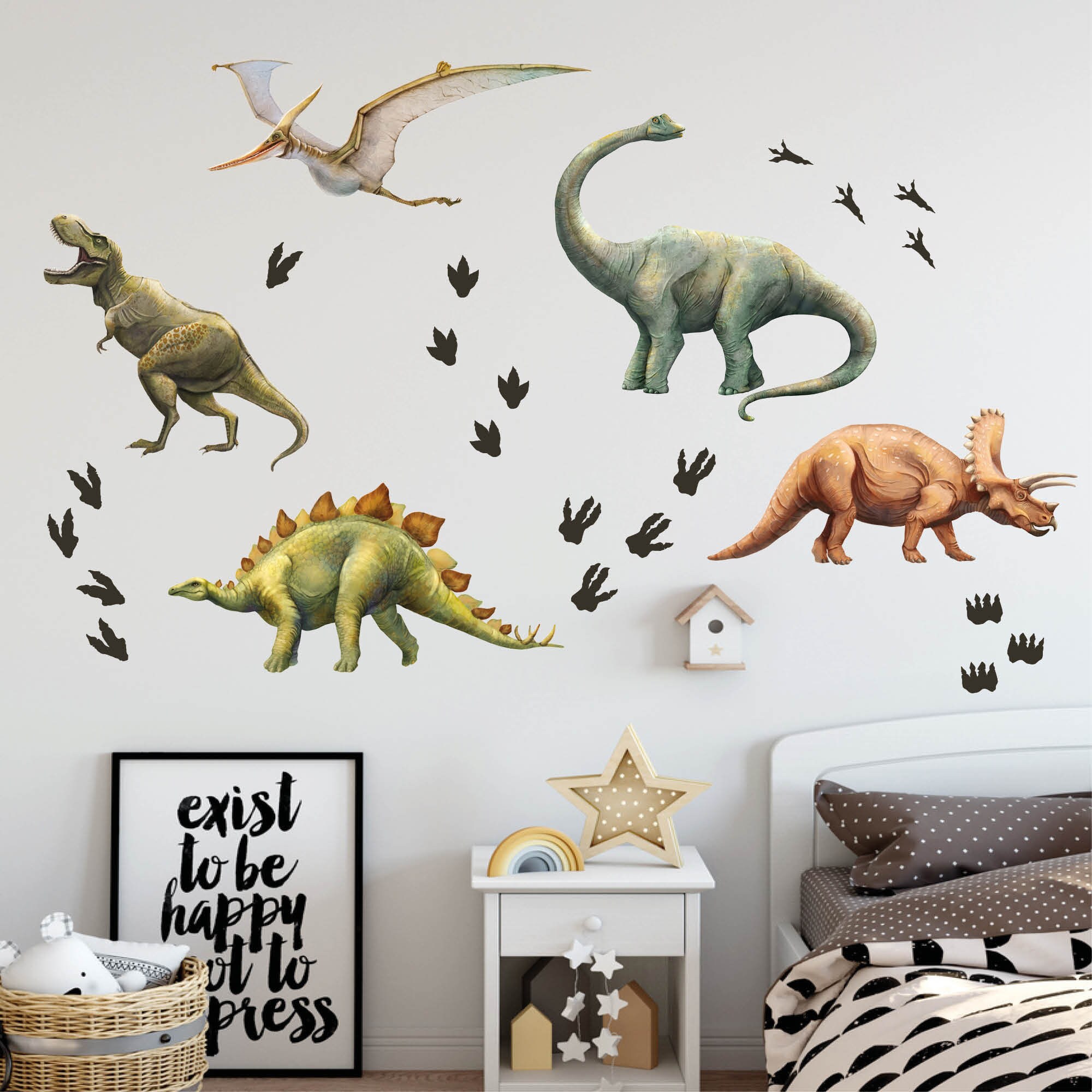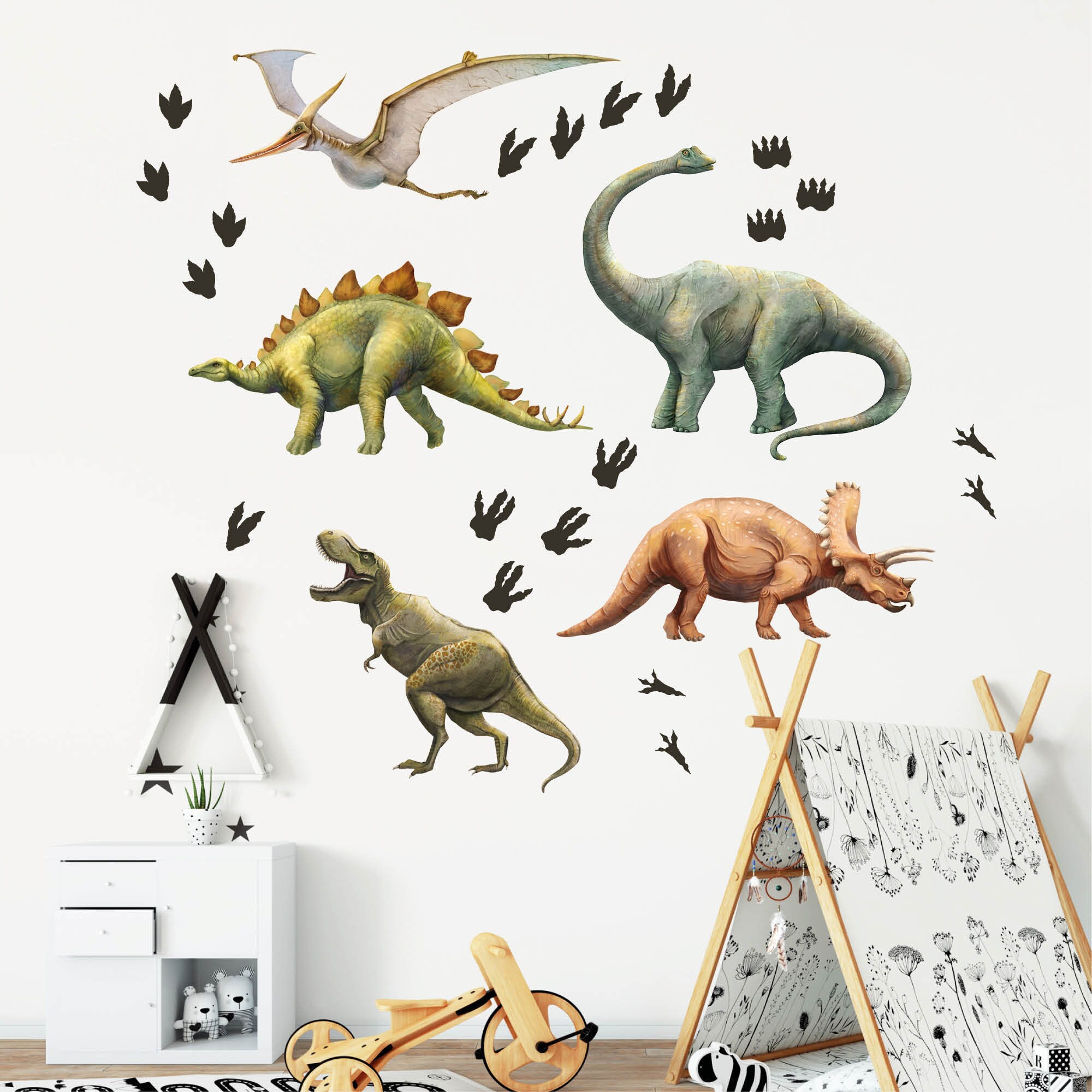 Dieses Wandtattoo zeigt 4 zauberhaft illustrierte Dinosaurier – handgezeichnet. Das Motiv wird ergänzt von Fußabdrücken, die beliebig aufgeklebt werden können. So sorgt dieser Wandsticker für einen tollen Hingucker in jedem Kinderzimmer oder Babyzimmer. Schaffe mit nur wenig Aufwand für Dein Kind eine Welt zum Träumen und Wohlfühlen!