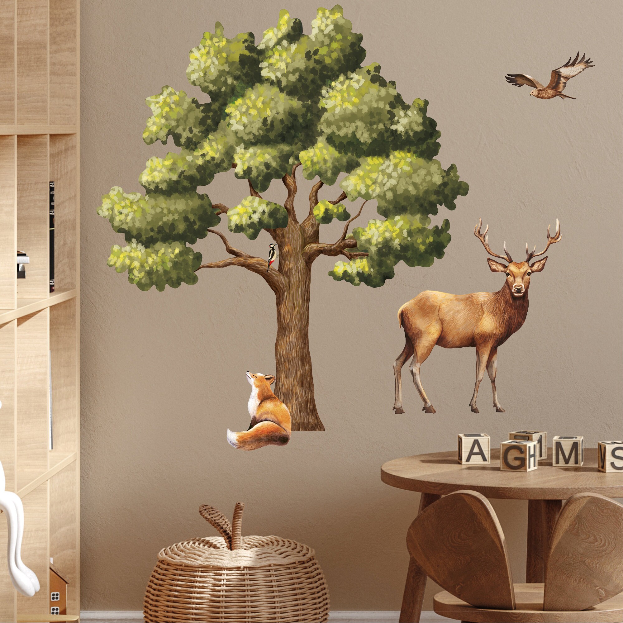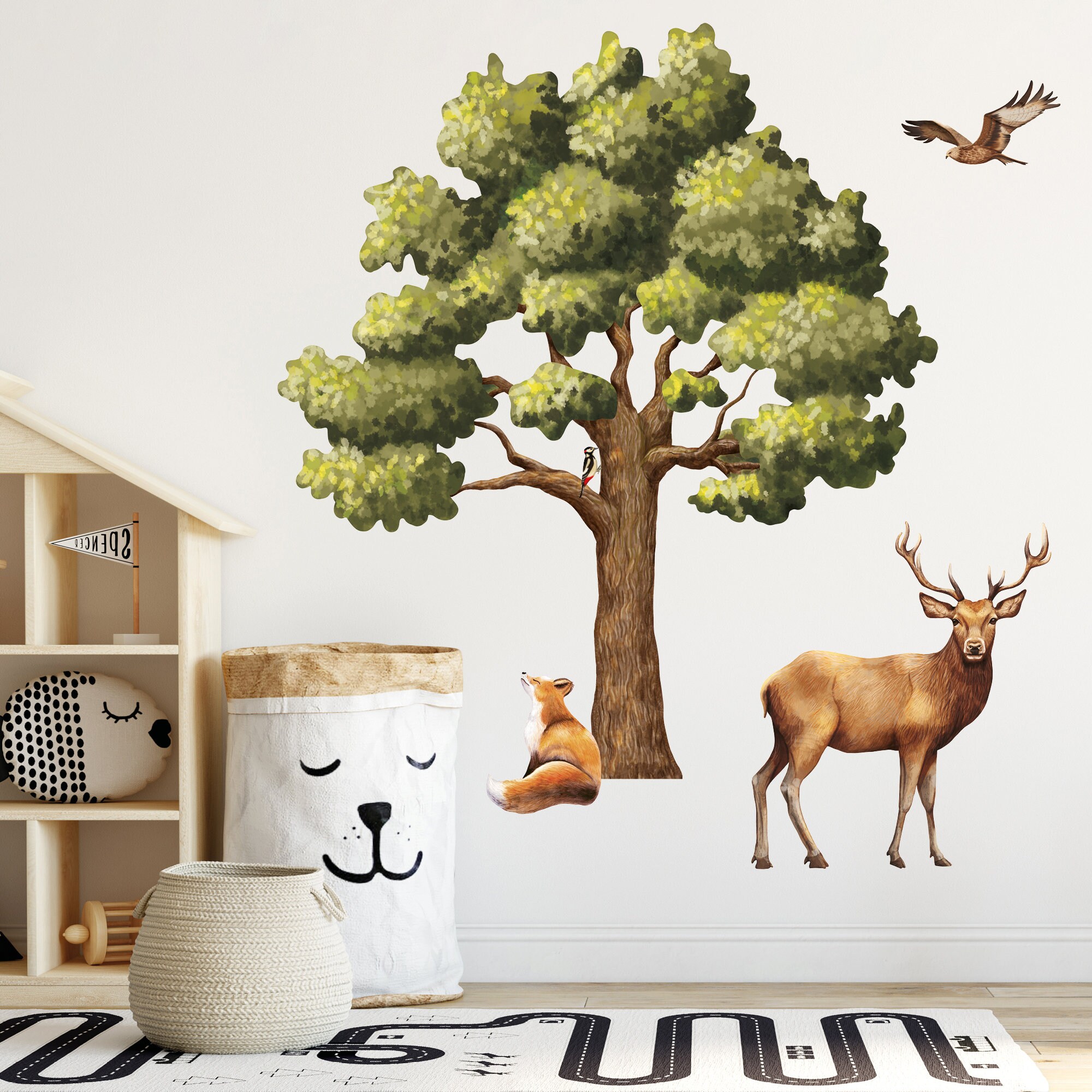 Wandtattoo Kinderzimmer eine Eiche mit einem Hirsch, einem Fuchs und Vögeln Dekoration Babyzimmer Tiere Natur
