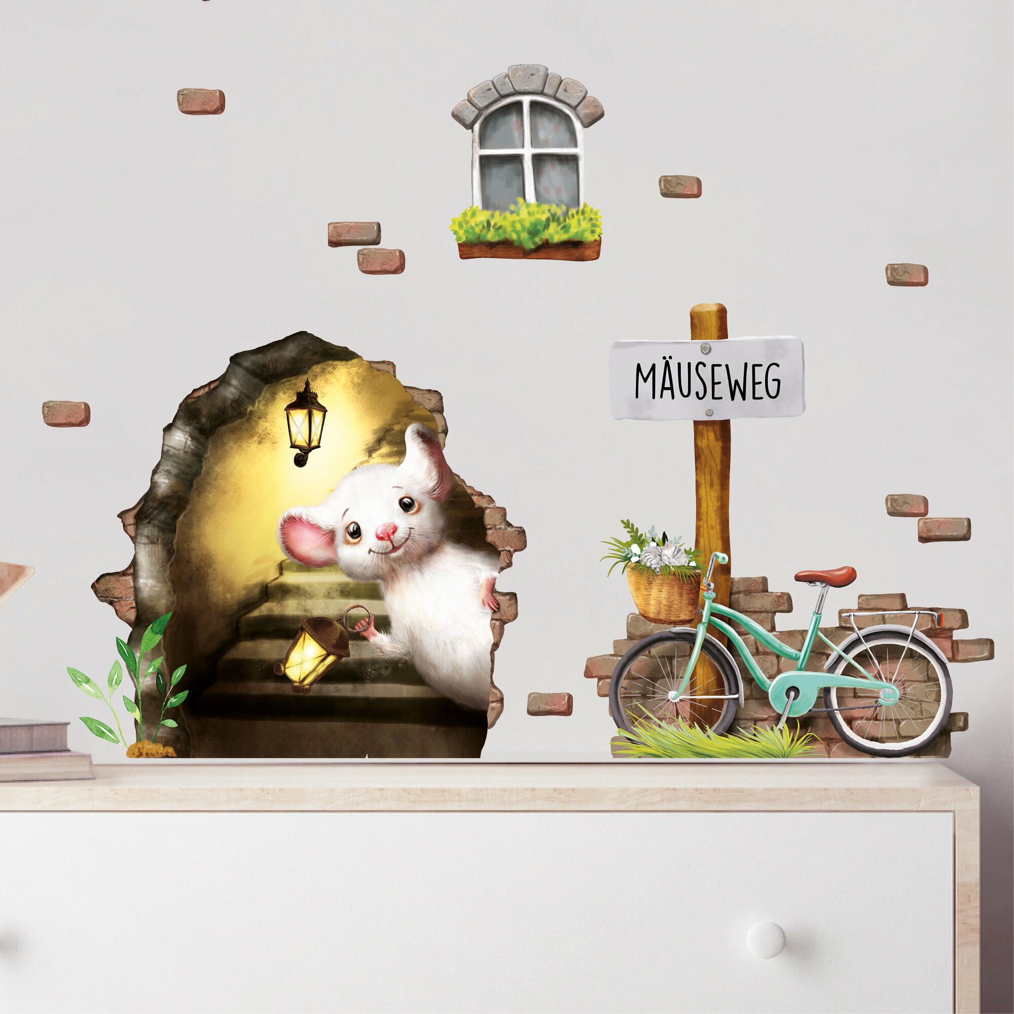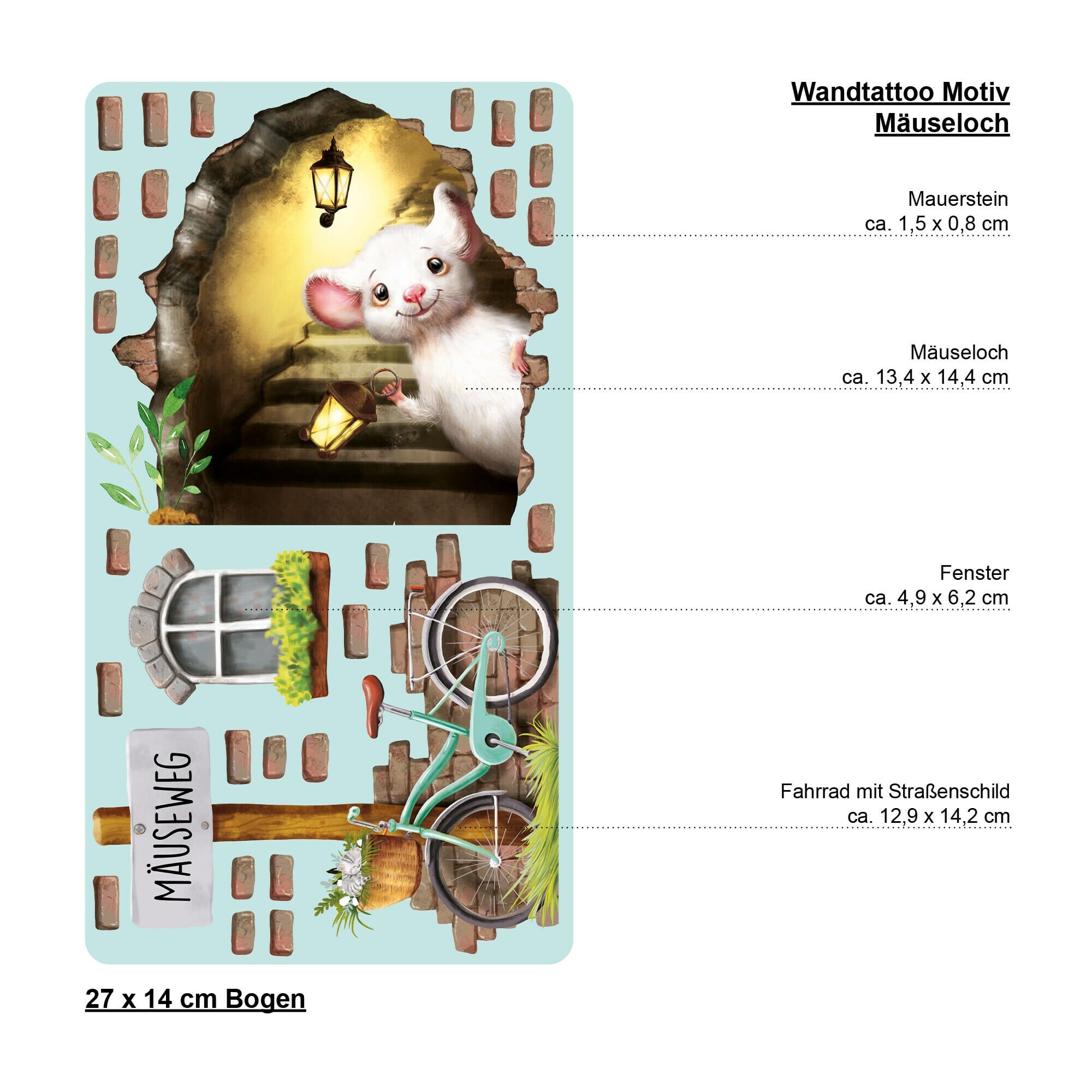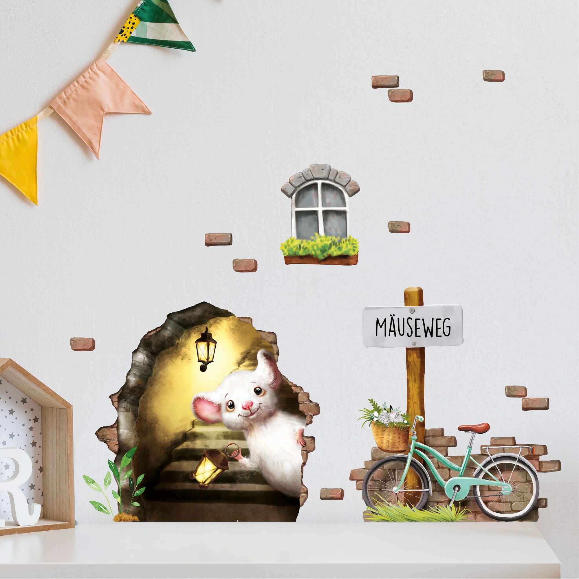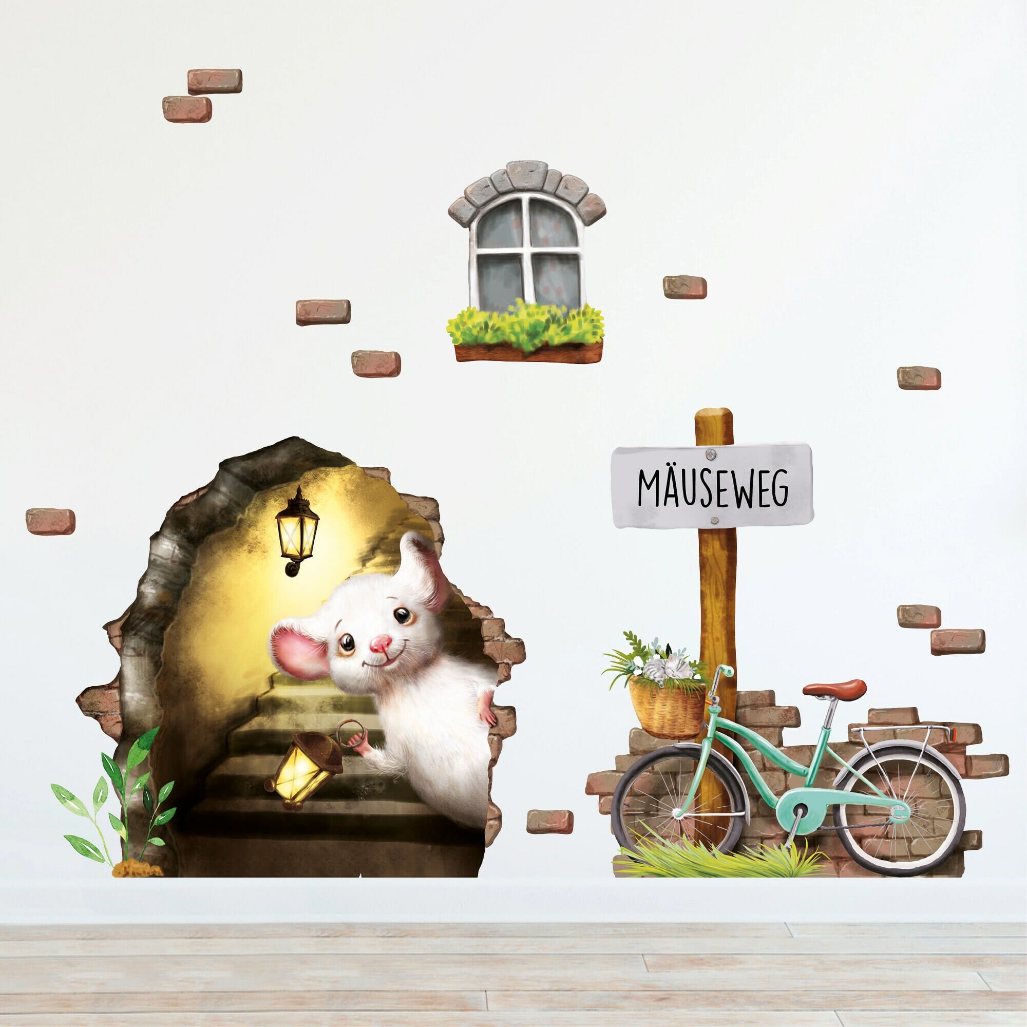 Wandtattoo Kinderzimmer Elfentür Mausetür Mausezimmer, Mauseloch mit Fahrrad, Kinderzimmerdeko, Babyzimmer