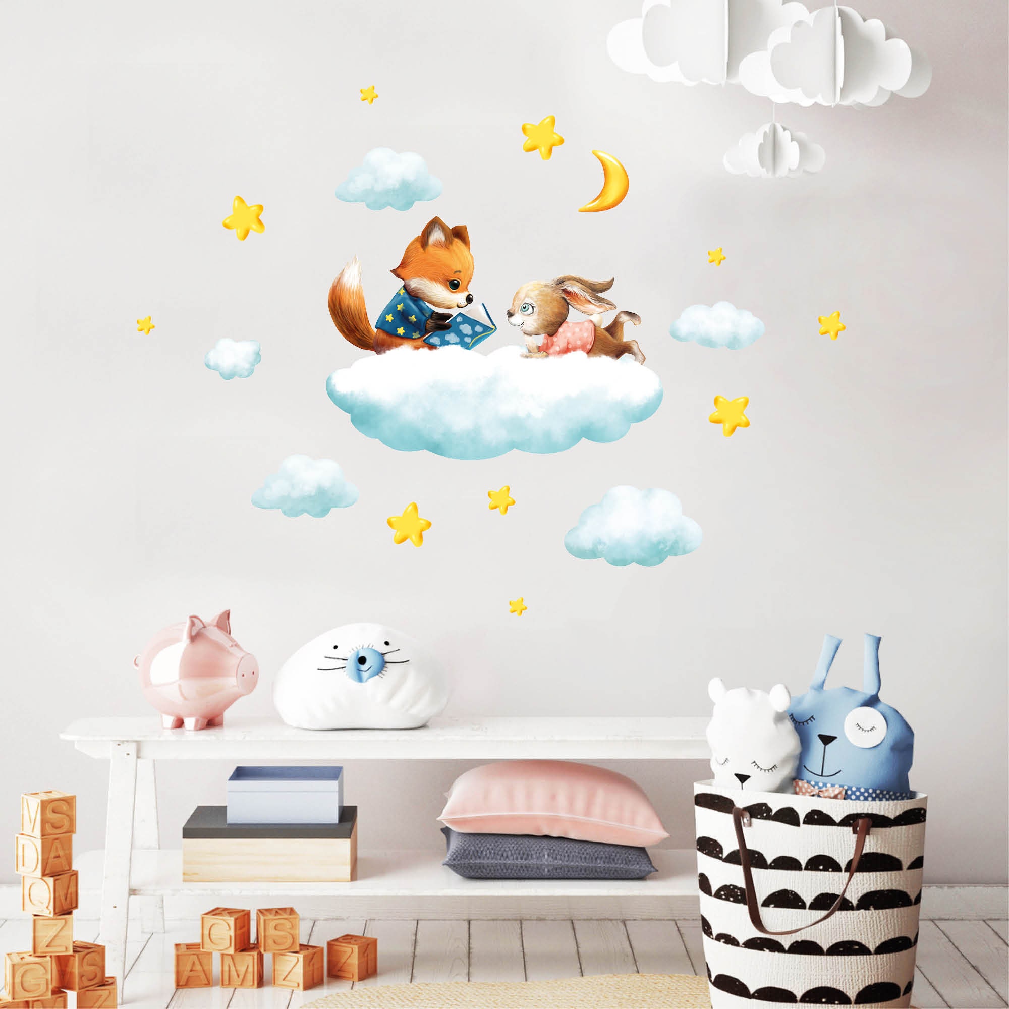 Wandtattoo Kinderzimmer Fuchs und Hase auf Wolke mit Mond und Sternen Dekoration Babyzimmer