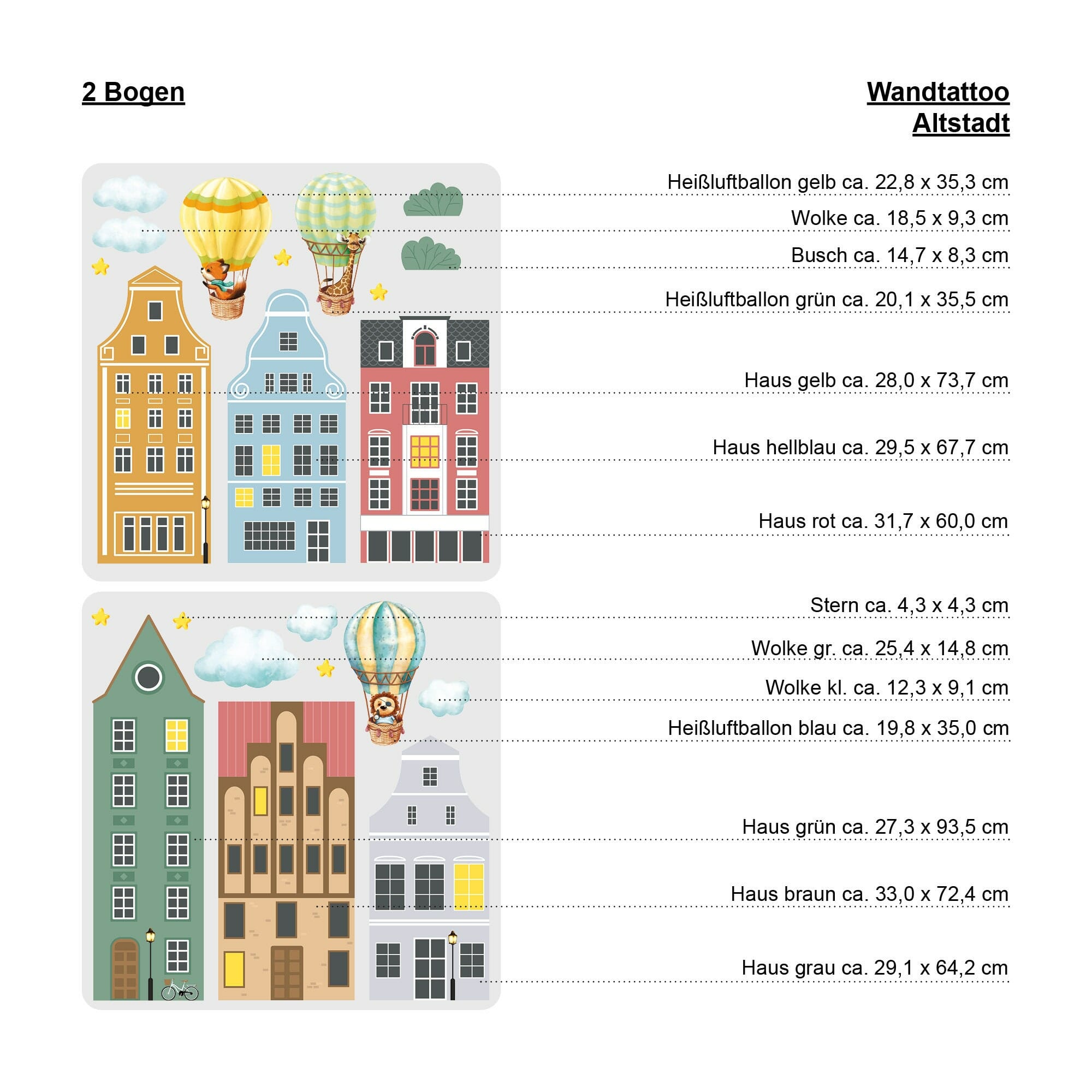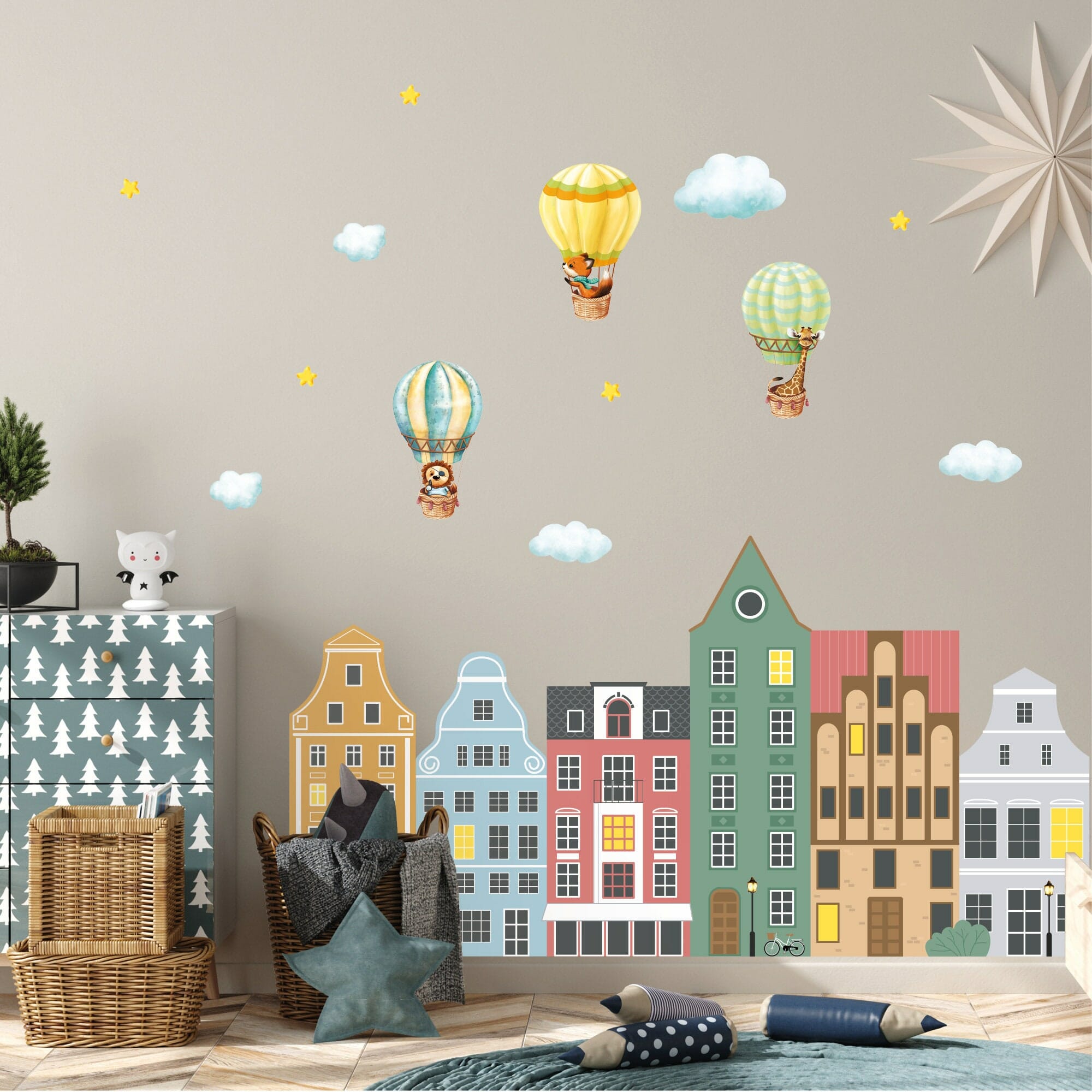 Wandtattoo Kinderzimmer Häuser Hansehäuser und Heißluftballons mit Tieren Dekoration Babyzimmer