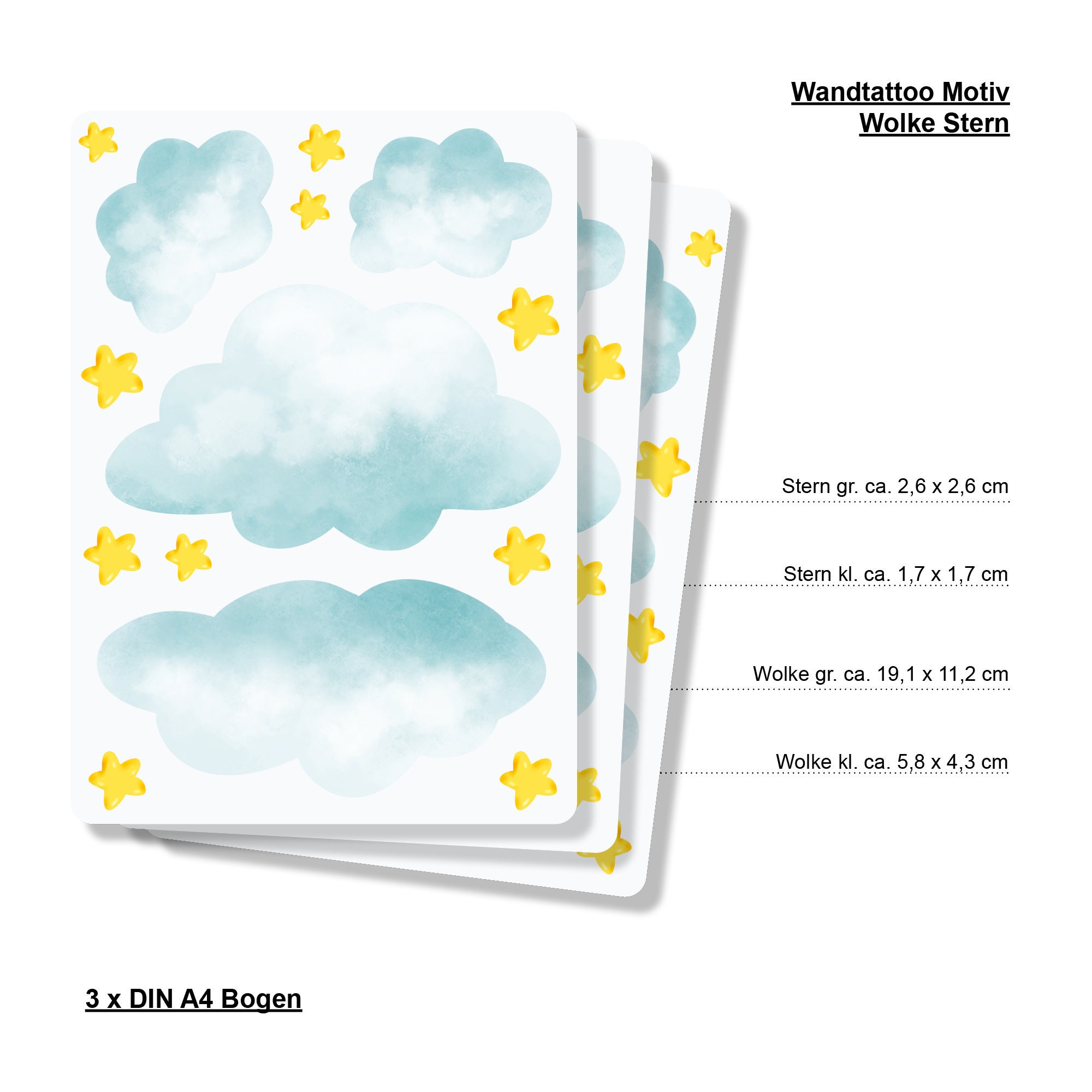 Dieses Wandtattoo zeigt zauberhaft illustrierte Wolken und Sterne in unterschiedlichen Größen – handgezeichnet. Das Motiv sorgt für einen tollen Hingucker in jedem Kinderzimmer/Babyzimmer. Schaffe mit nur wenig Aufwand für Dein Kind eine Welt zum Träumen und Wohlfühlen! Die einzelnen Motive können einzeln ausgeschnitten und beliebig aufgeklebt werden.
