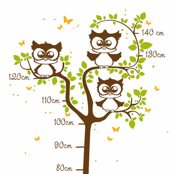 Du erhältst mit diesem Wandbild ein Maßband bzw. eine Messlatte mit einem Baum, drei Eulen und Schmetterlinge.