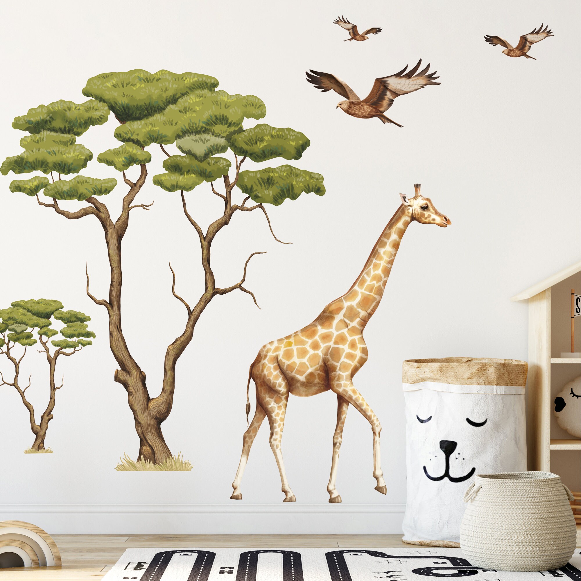 Wandtattoo Kinderzimmer Savanne mit Giraffe, Elefant, Bäume und Vögeln