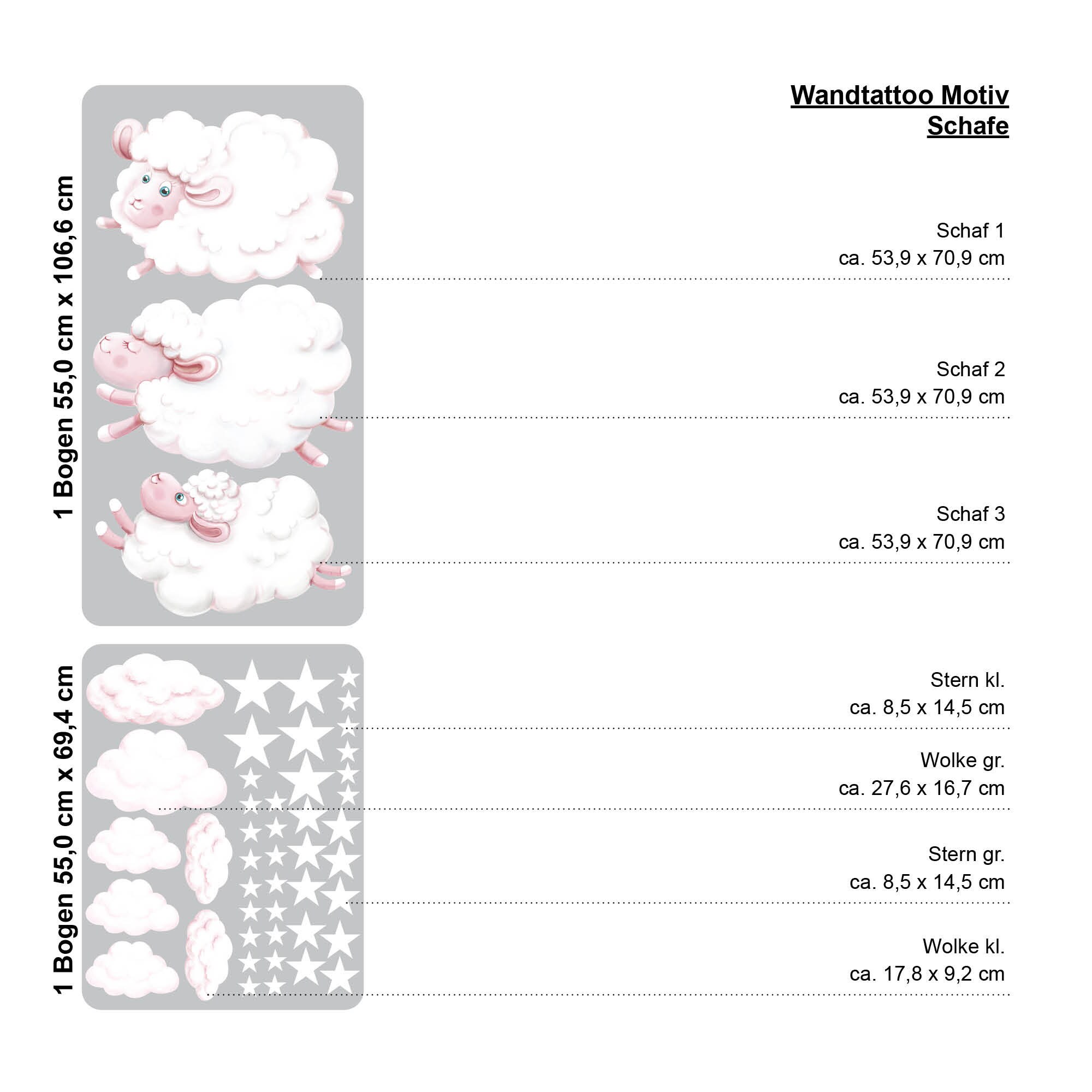 Das Wandtattoo wird auf 2 Bögen geliefert. Einer ist 55 cm x 106 cm, der andere ist 55 cm x 70 cm groß. Die Größe der einzelnen Elemente kannst Du den Artikelbildern entnehmen.