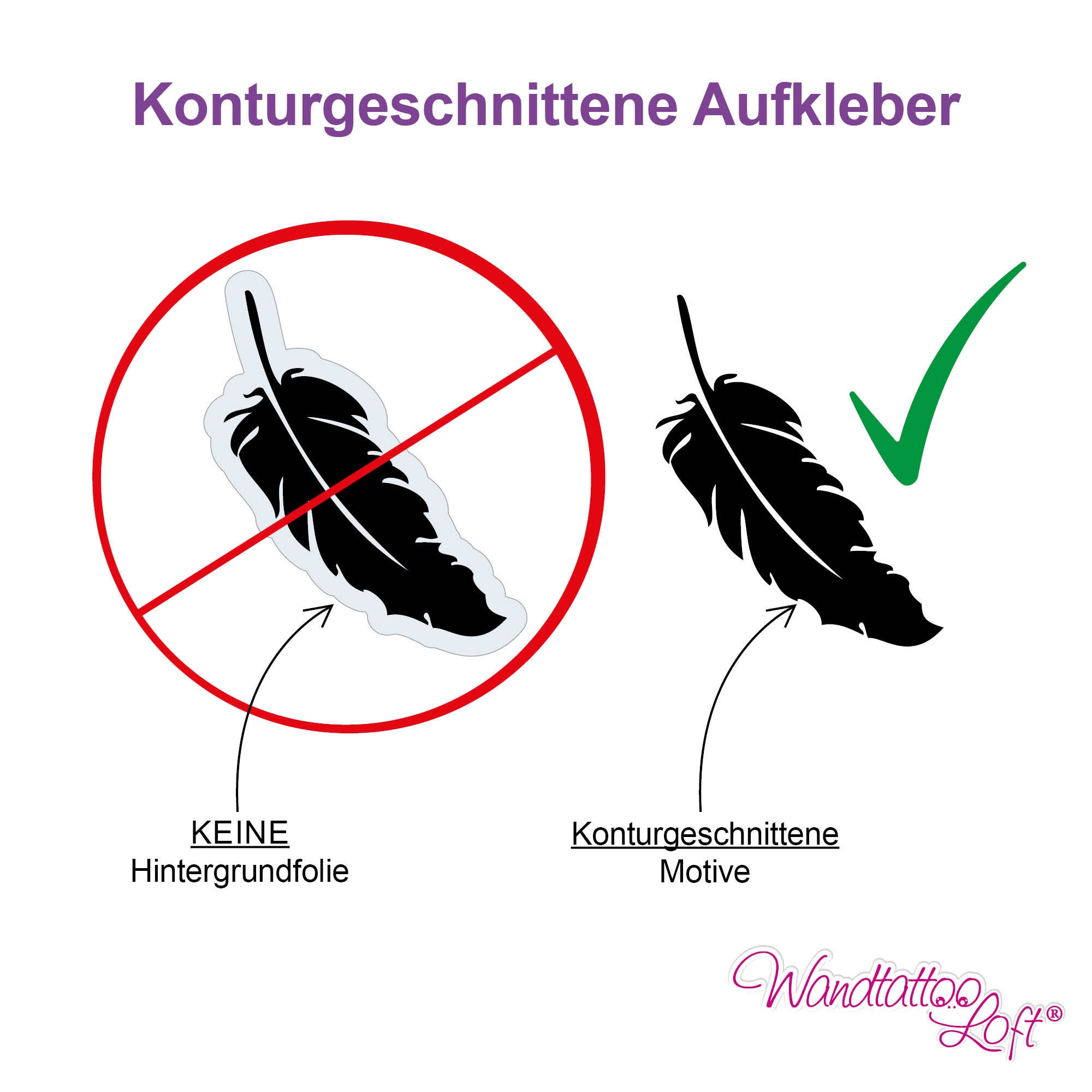 All unsere Motive sind konturgeschnitten, d.h. OHNE Hintergrundfolie. Bitte beachte, dass der zu beklebende Untergrund sauber, trocken, staub-, fett- und silikonfrei sein muss. Du kannst die Haftung der Folie auf Ihrem Untergrund anhand des beigelegten Probeaufklebers vorab testen!