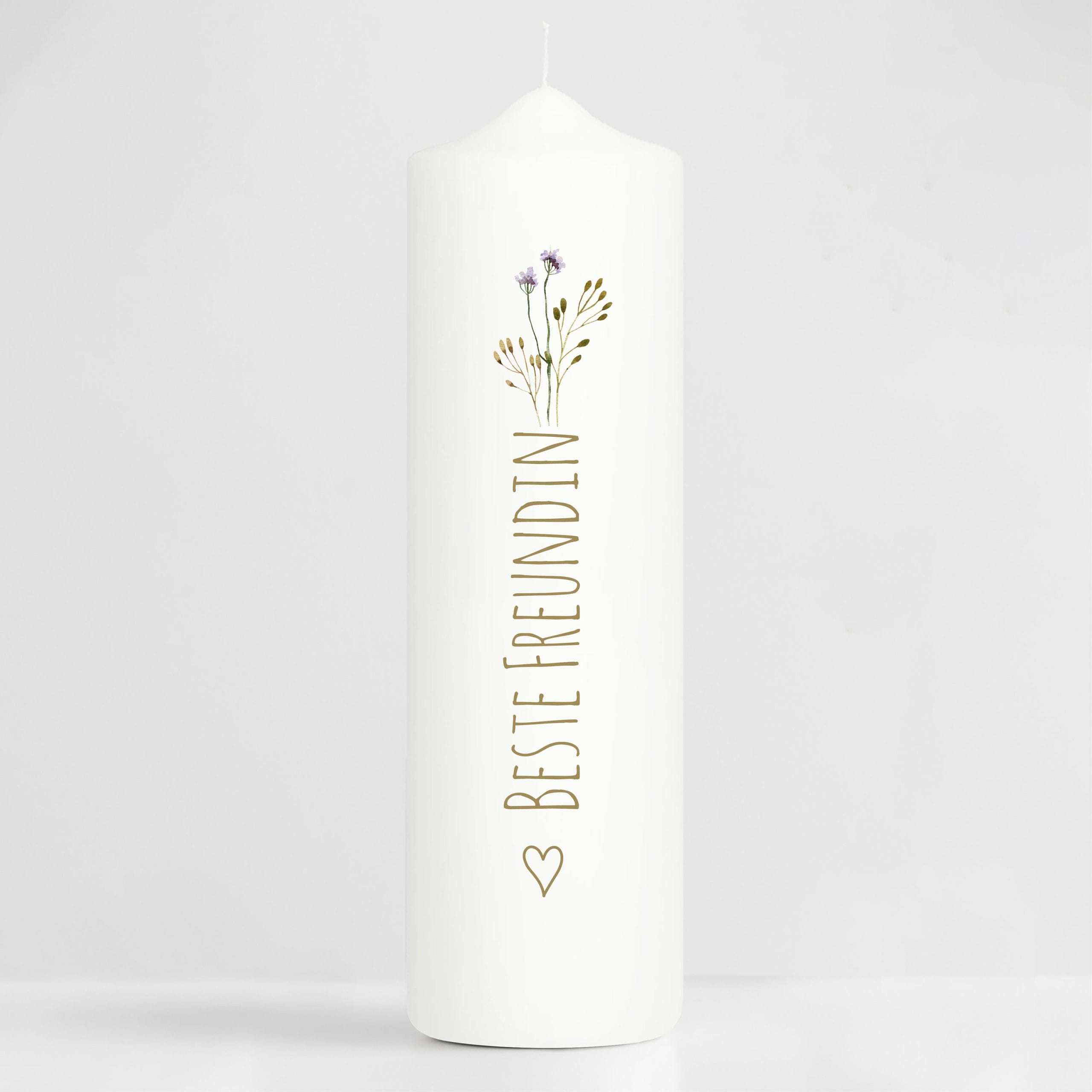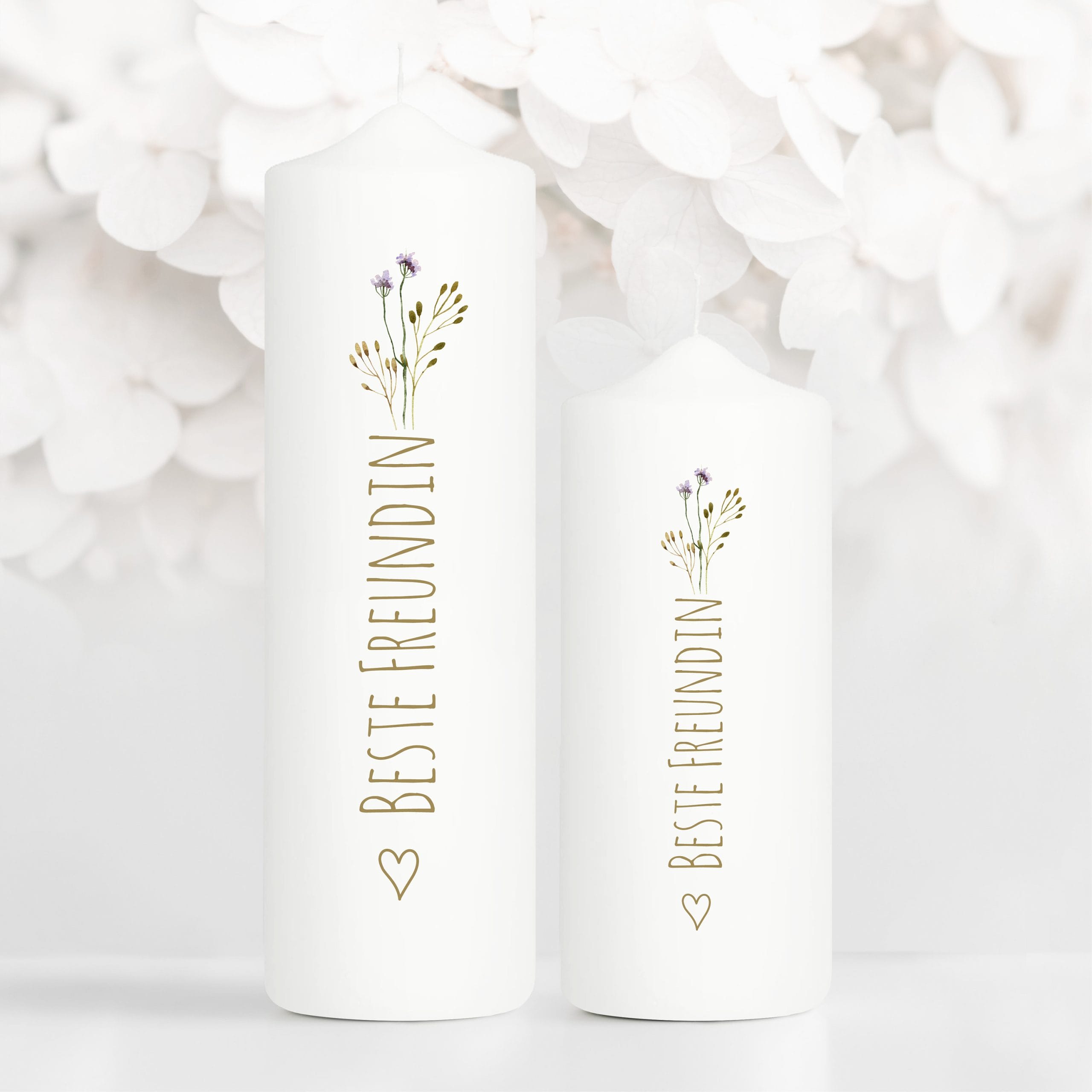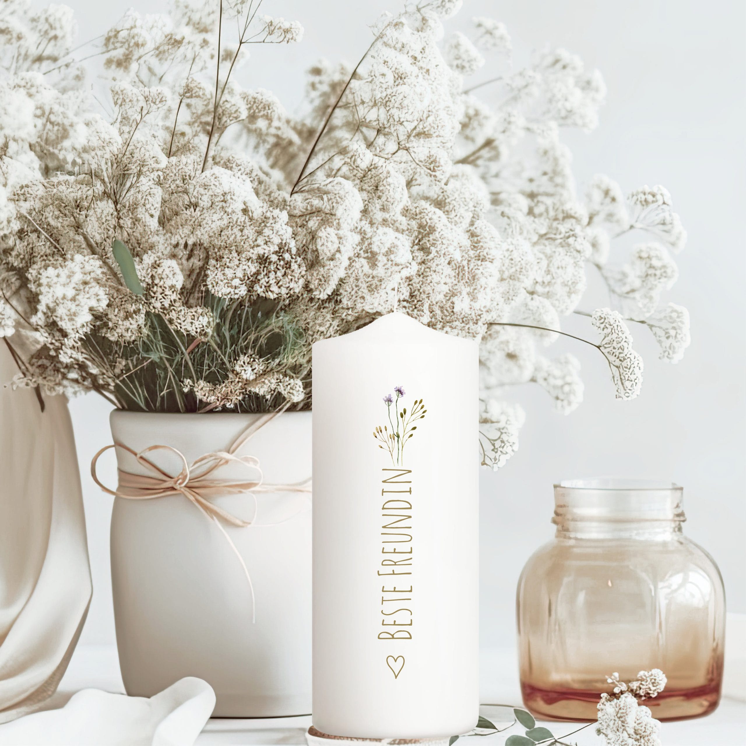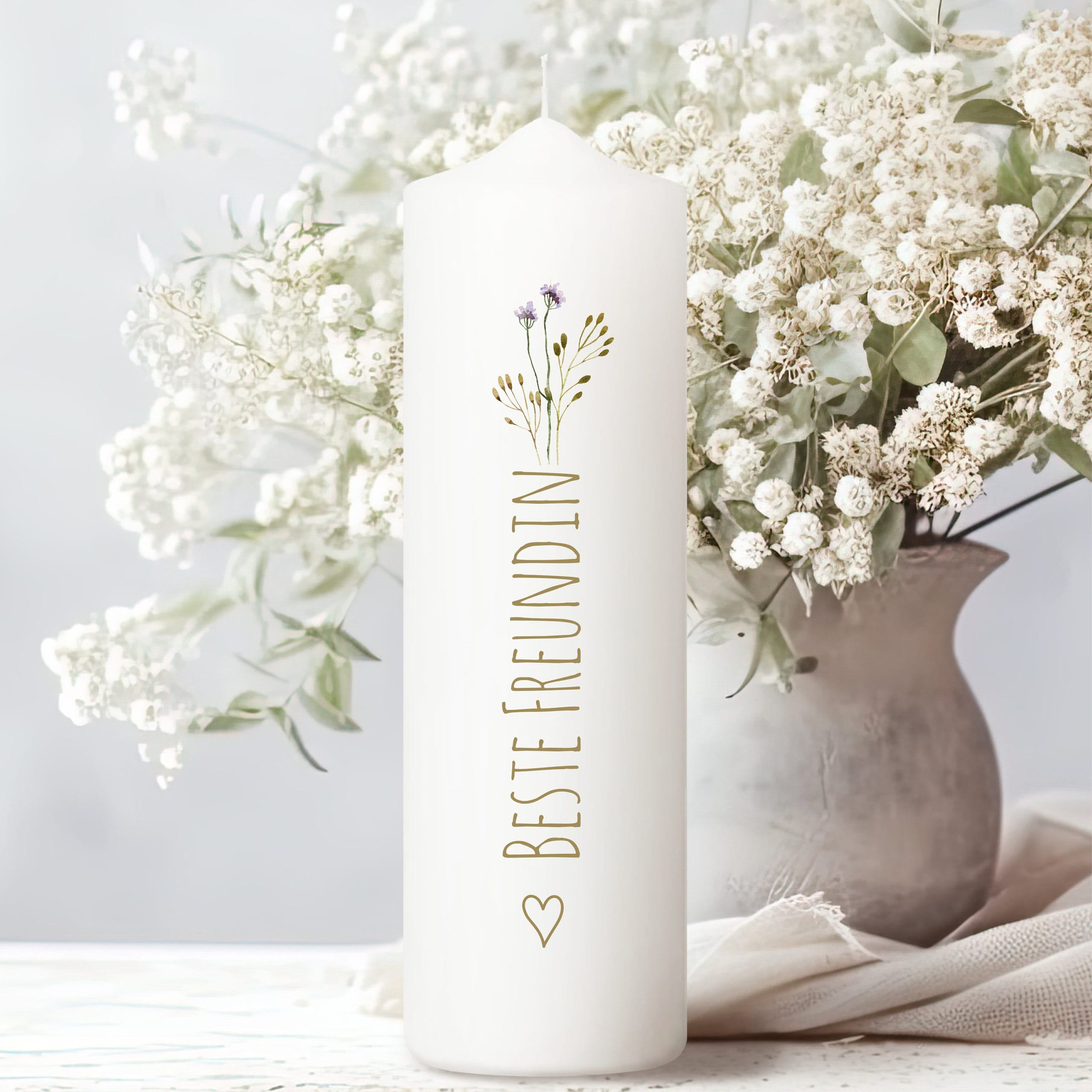 Wunderschön gestaltete weiße Kerze mit Beste Freundin und einem schlichten Blumenstrauß – Stumpenkerze mit Spitzkopf