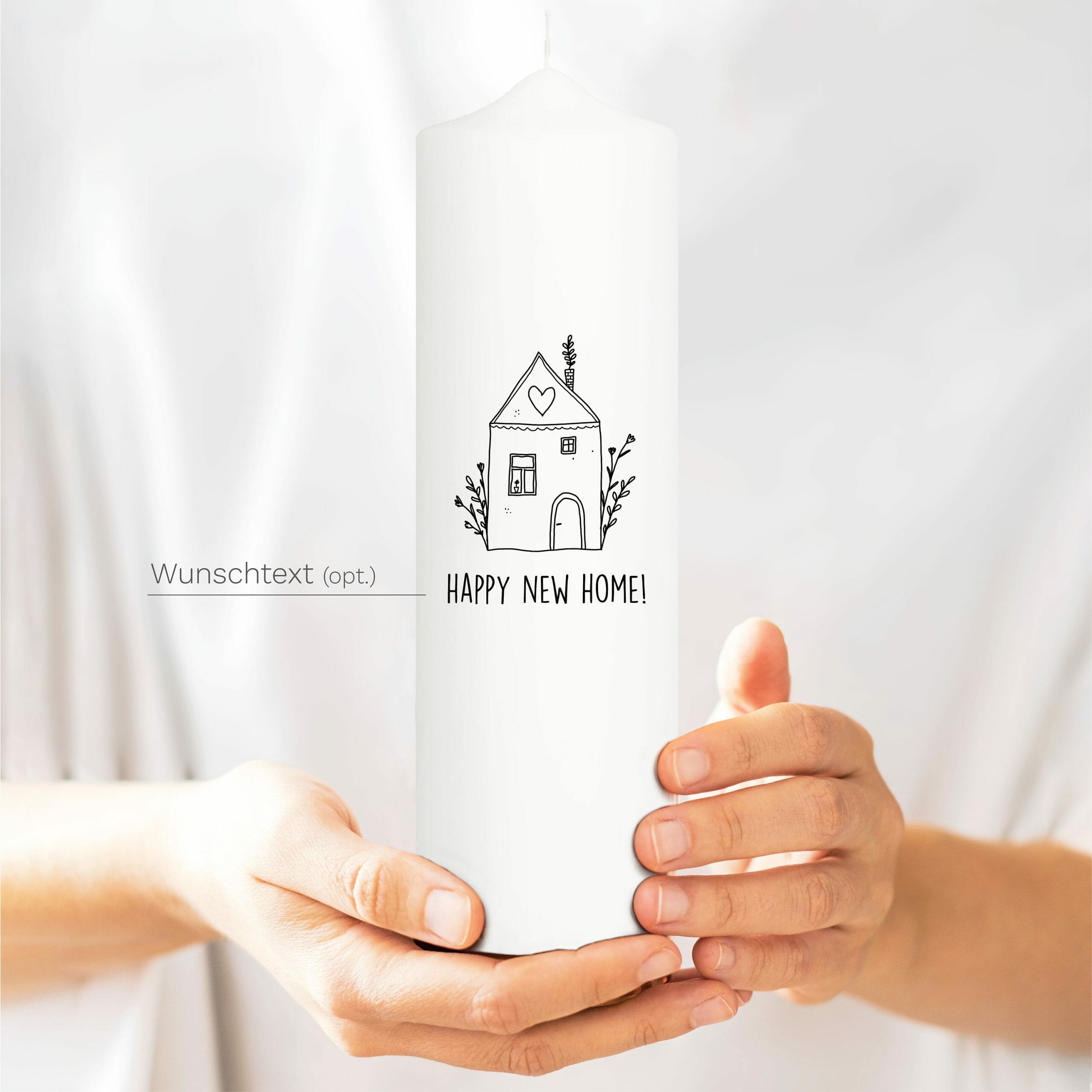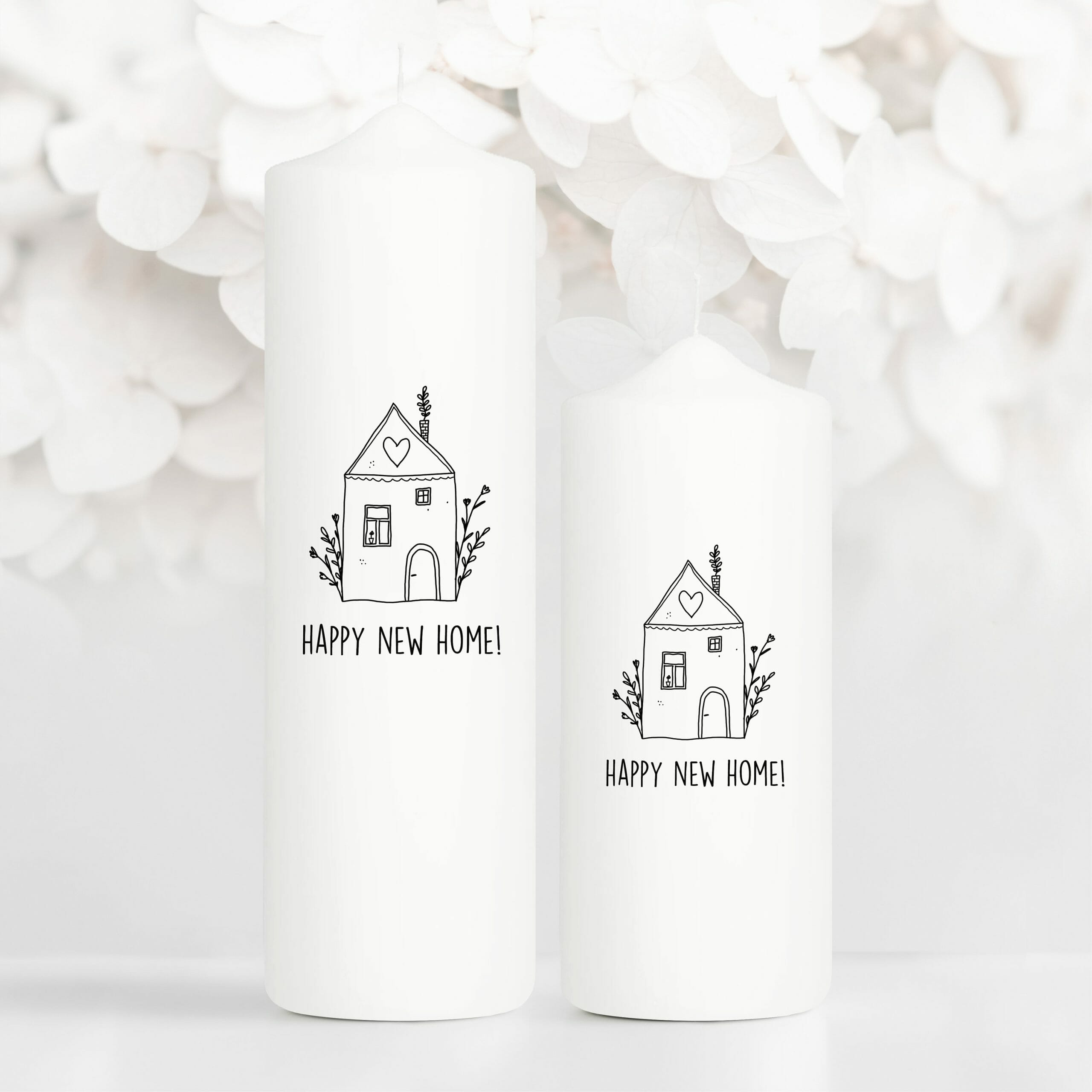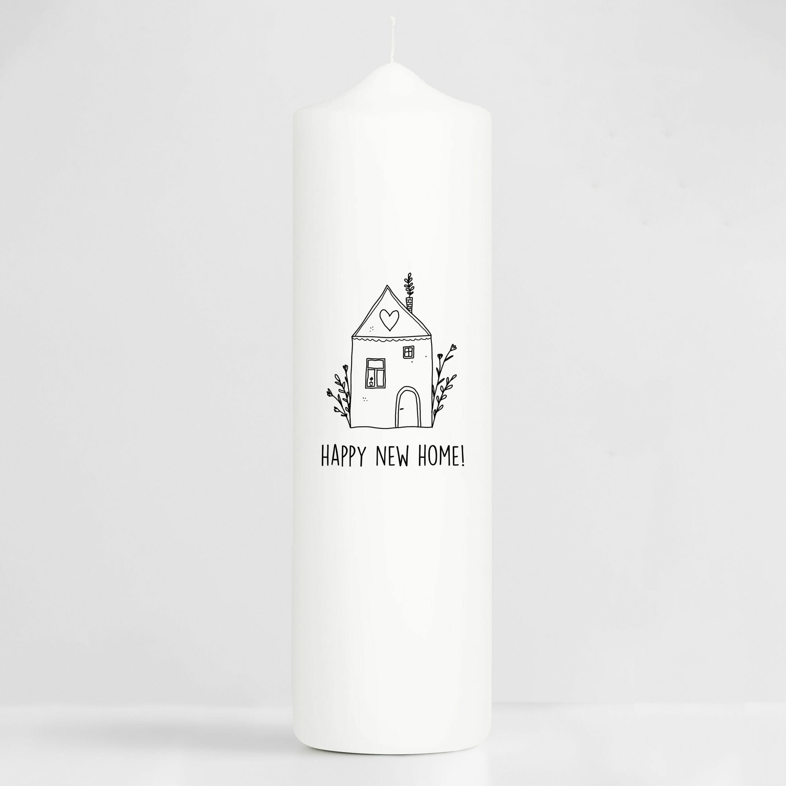 Weiße Kerze zum Einzug “Happy New Home” mit Spruch und Haus