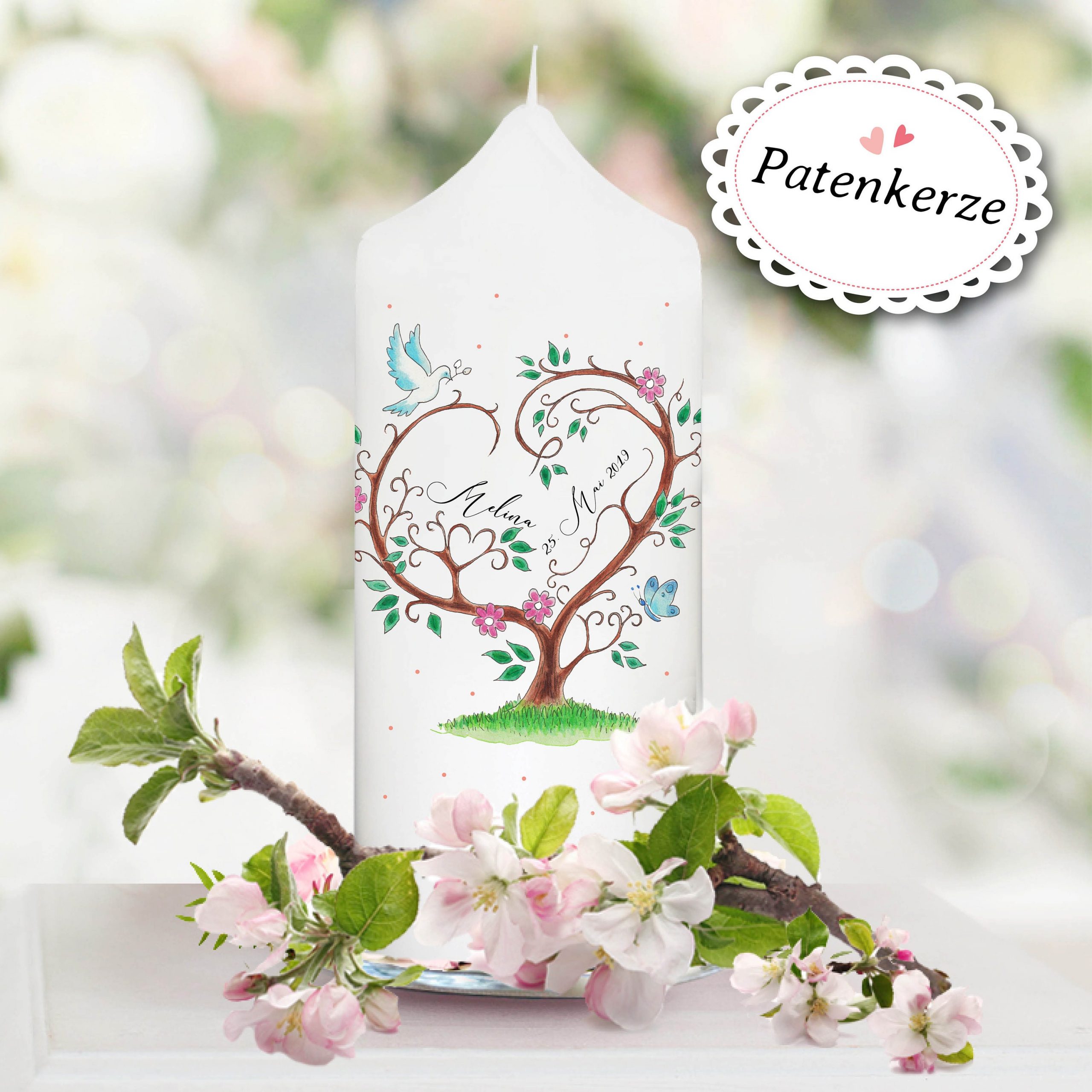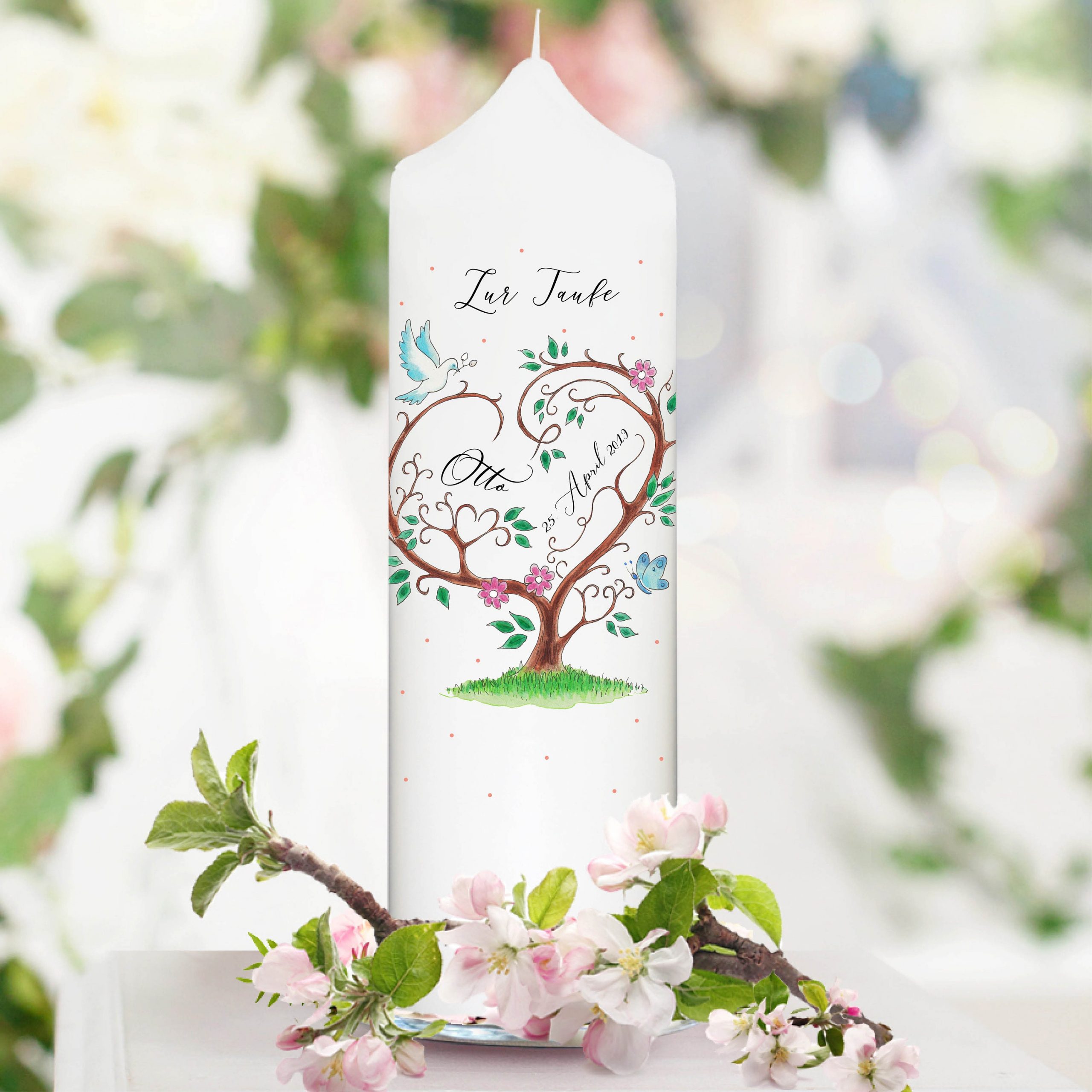weiße Taufkerze Kerze zur Taufe oder Geburt Baum Taube mit Name Datum Taufspruch