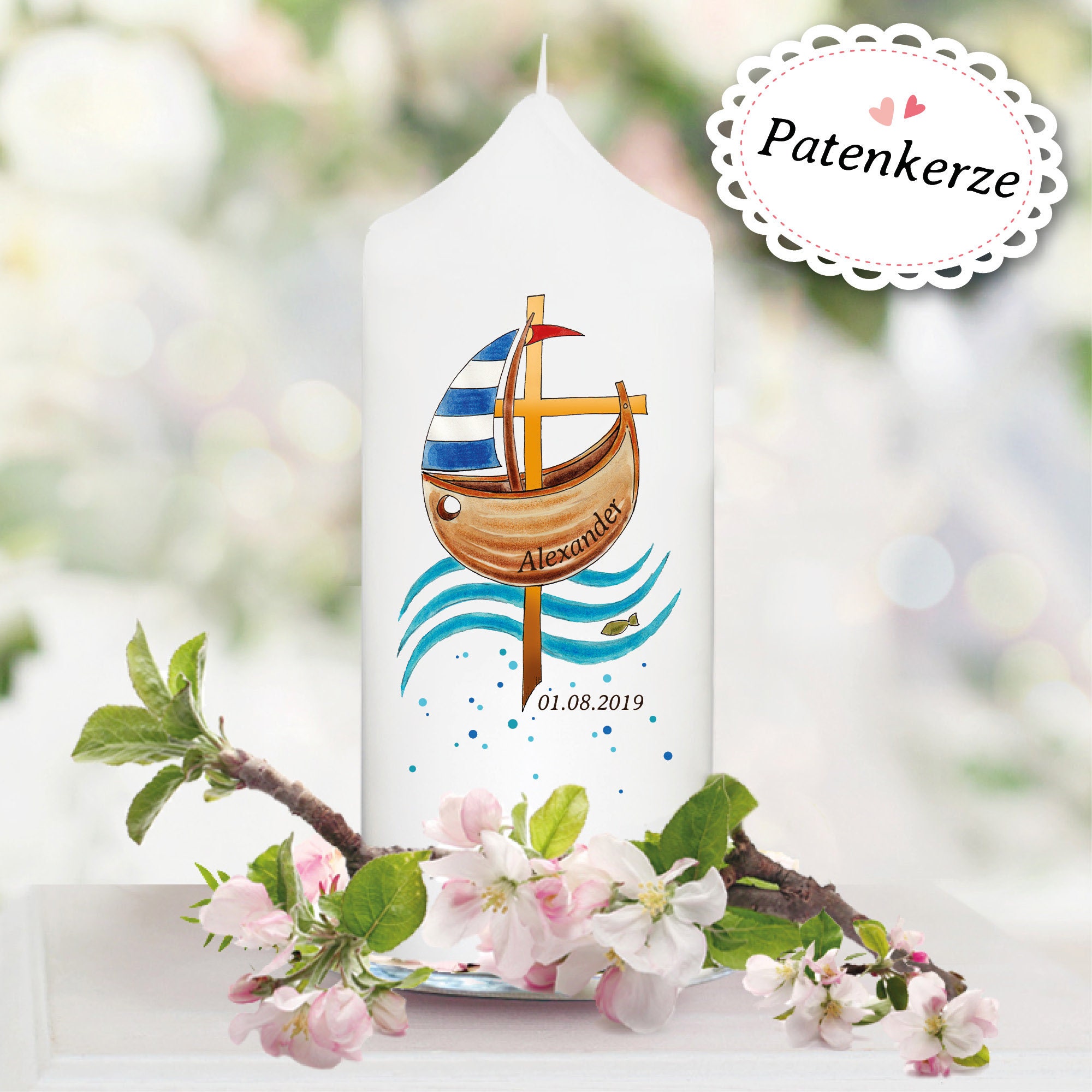 weiße Taufkerze Kerze zur Taufe oder Geburt Boot Jesuskreuz mit Name Datum Taufspruch