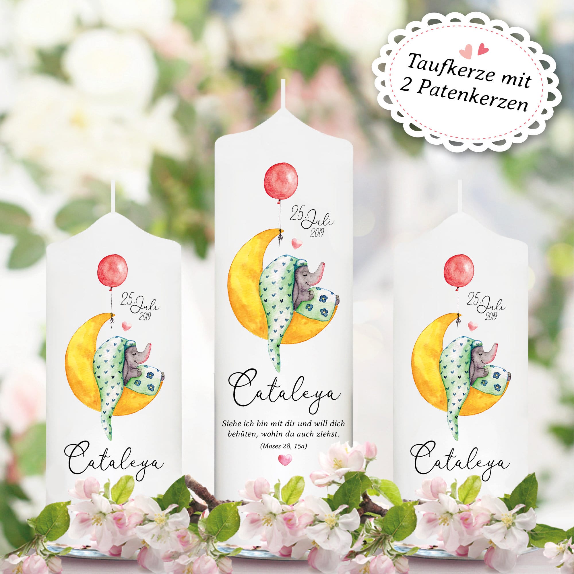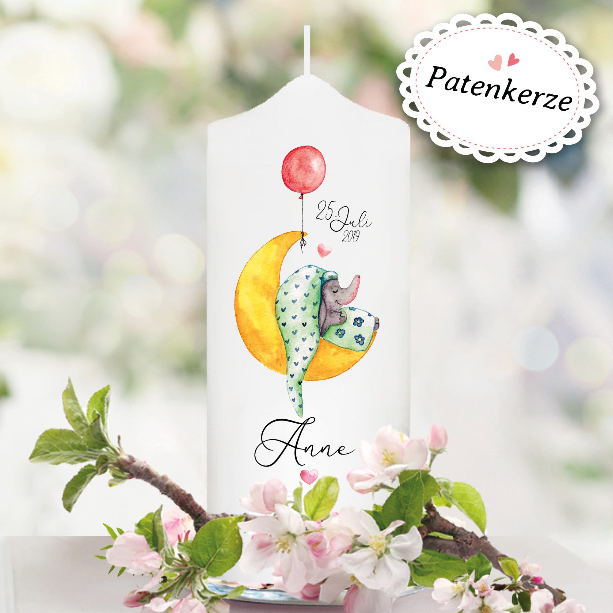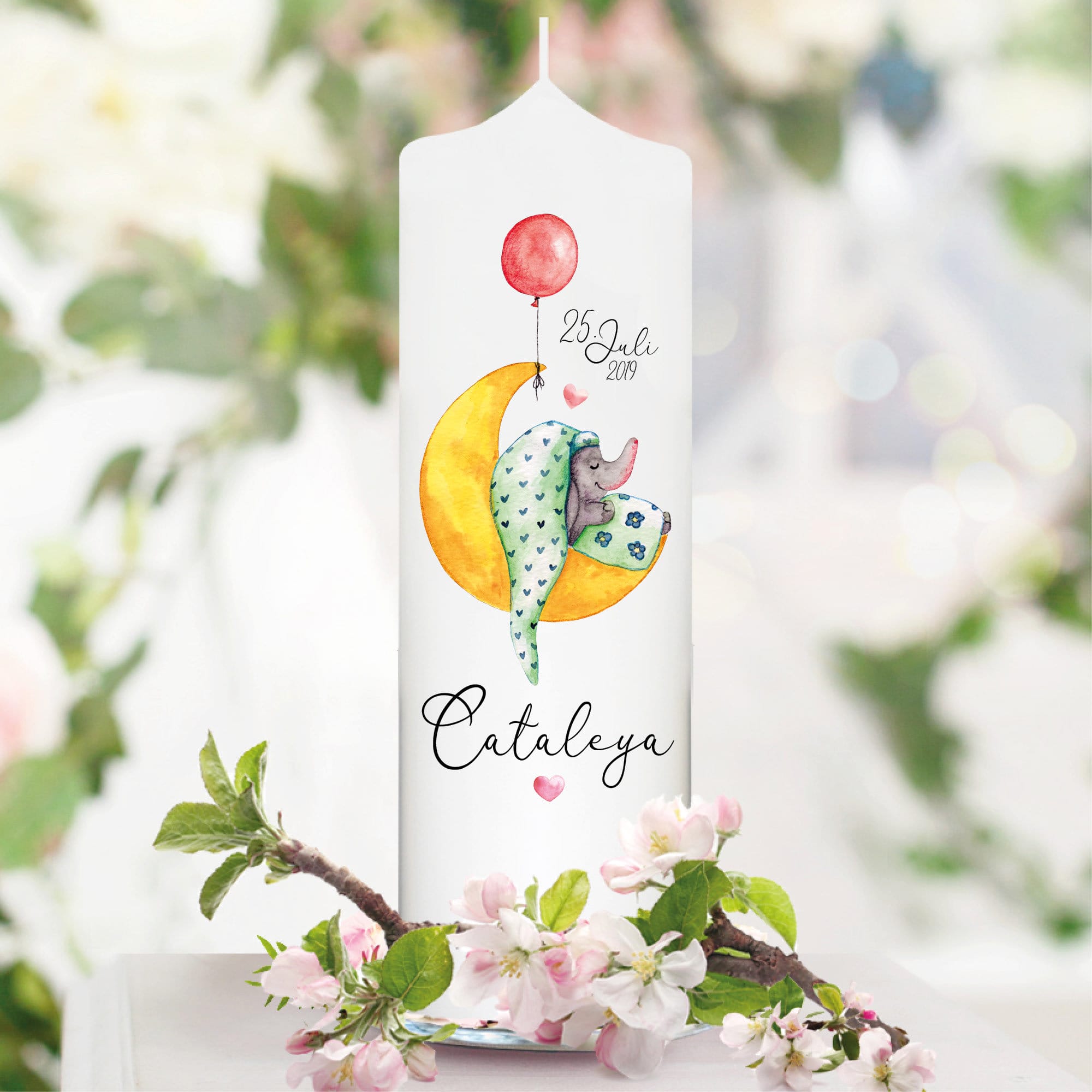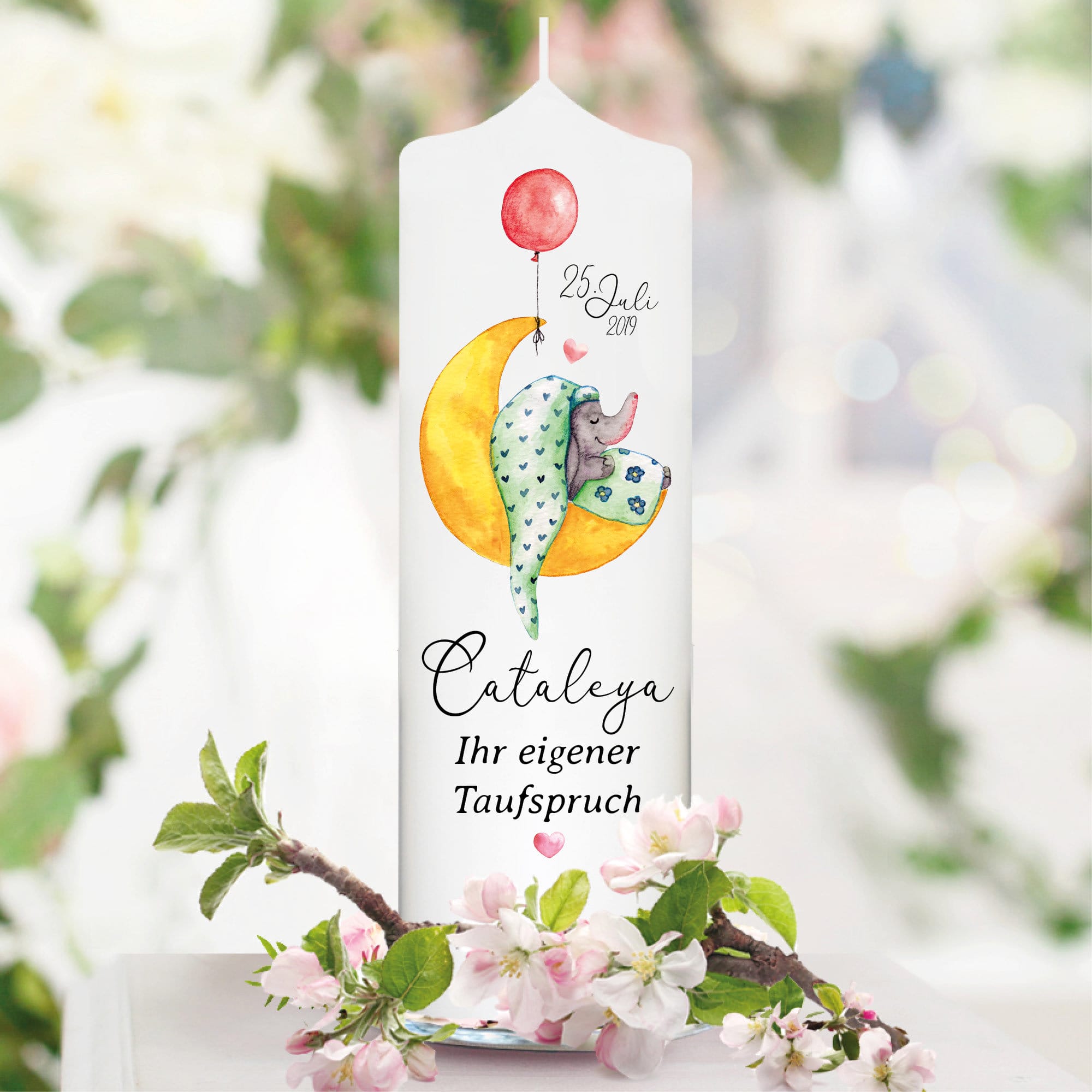Weiße Taufkerze Kerze zur Taufe oder Geburt Elefant auf Mond mit Name Datum Taufspruch