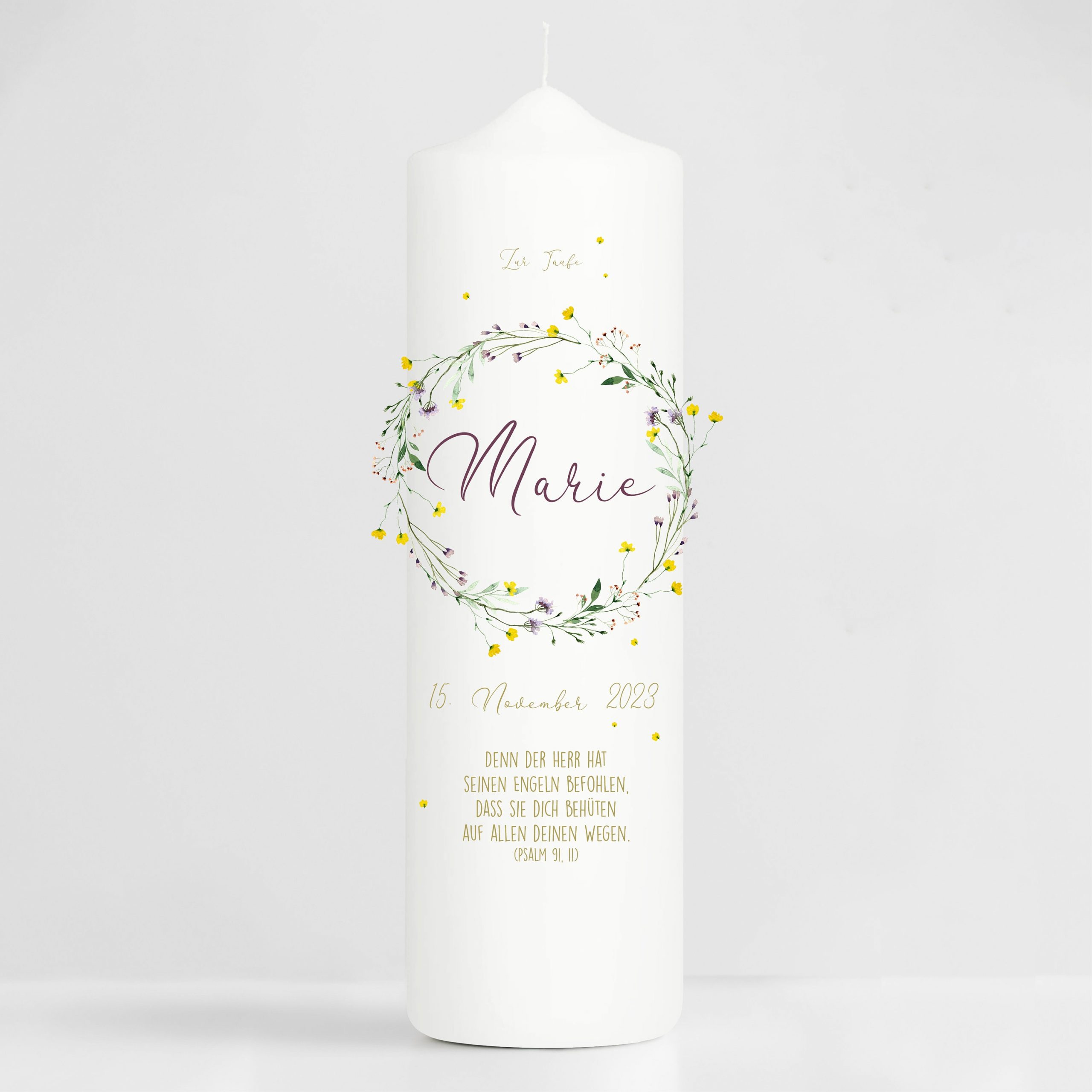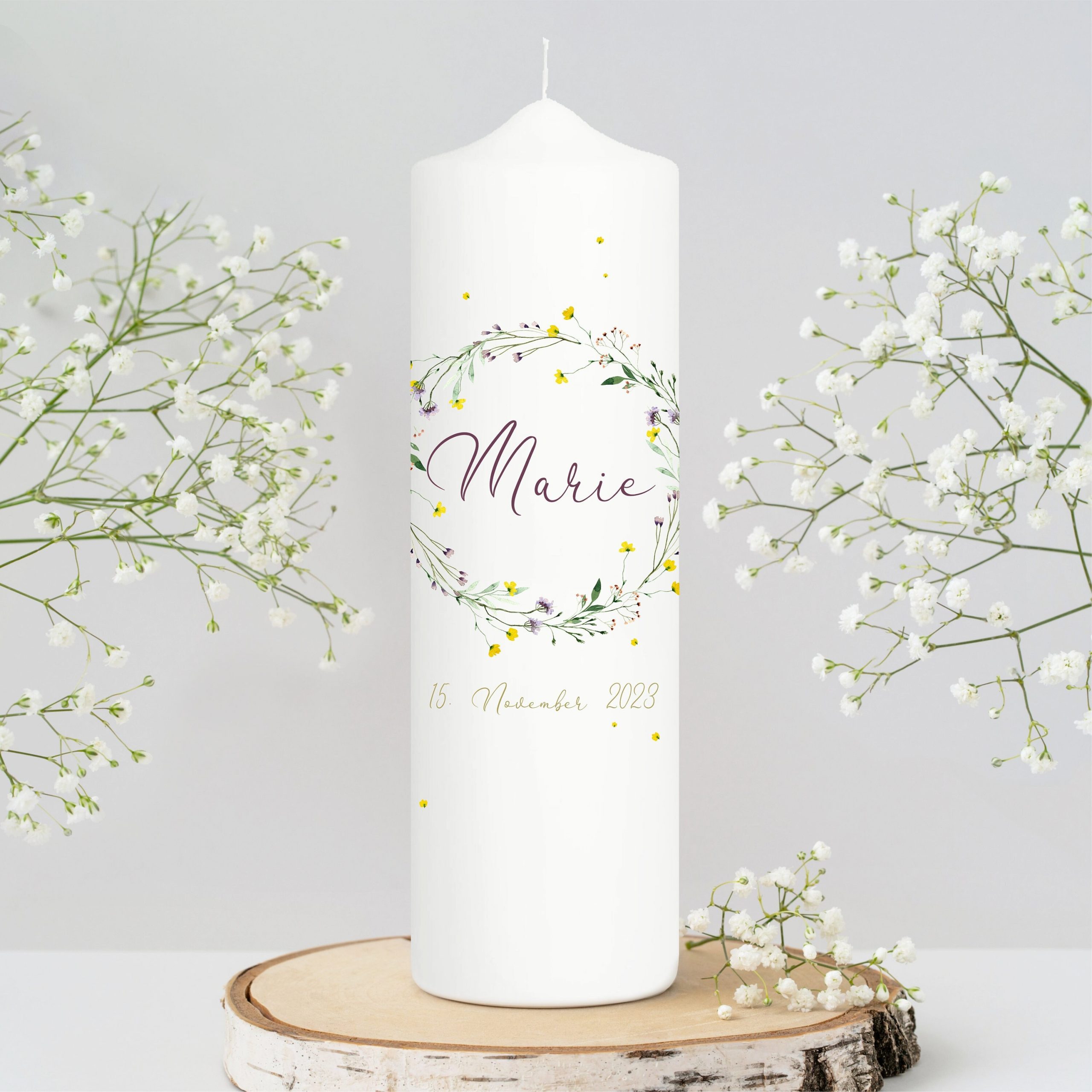 Weiße Taufkerze Kerze zur Taufe oder Geburt mit Kranz aus Wildgräsern mit Name Datum Taufspruch