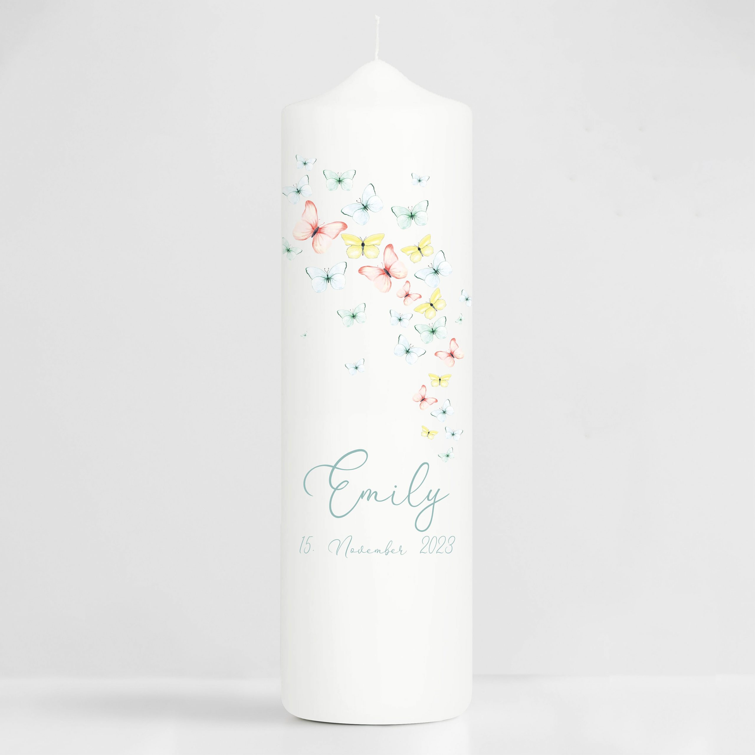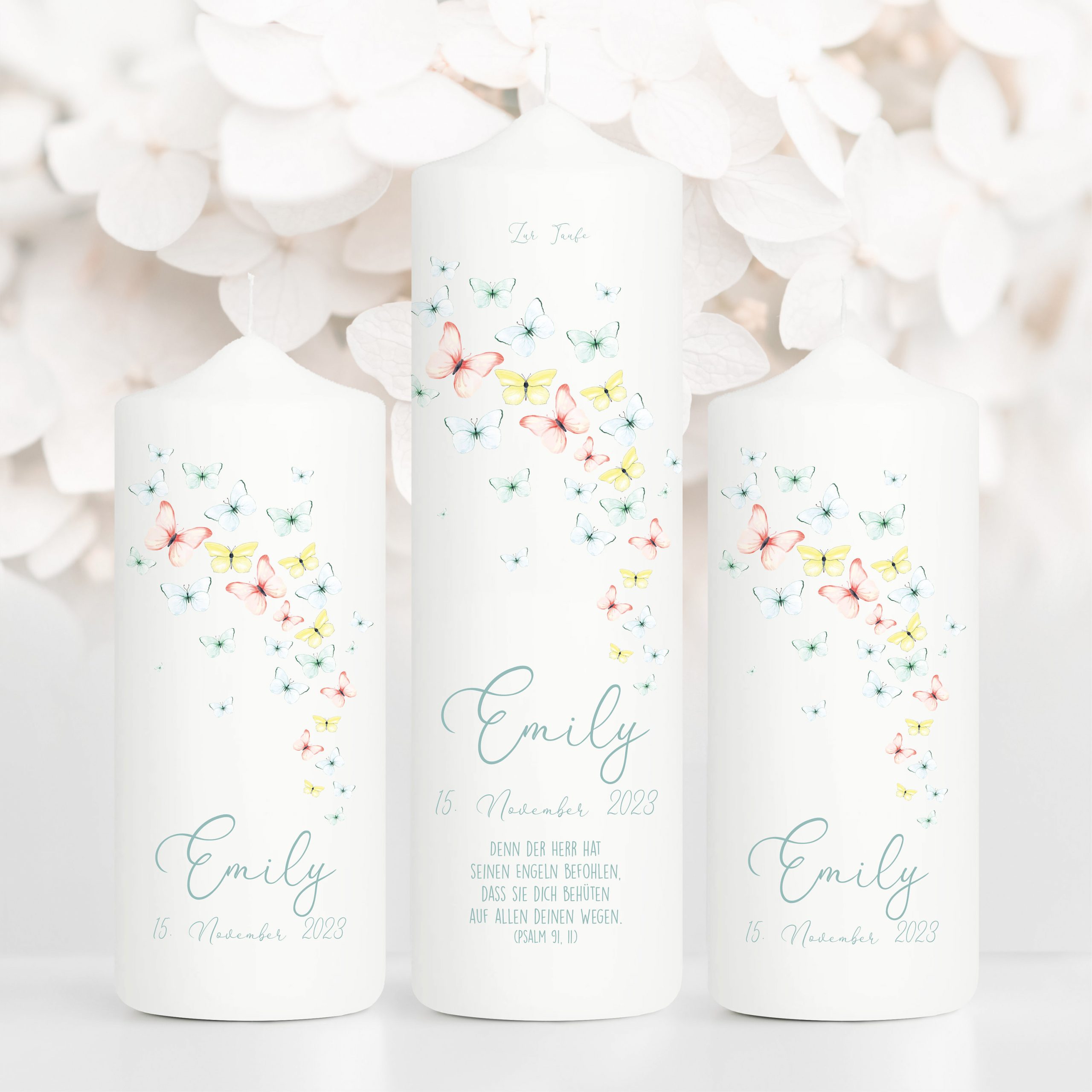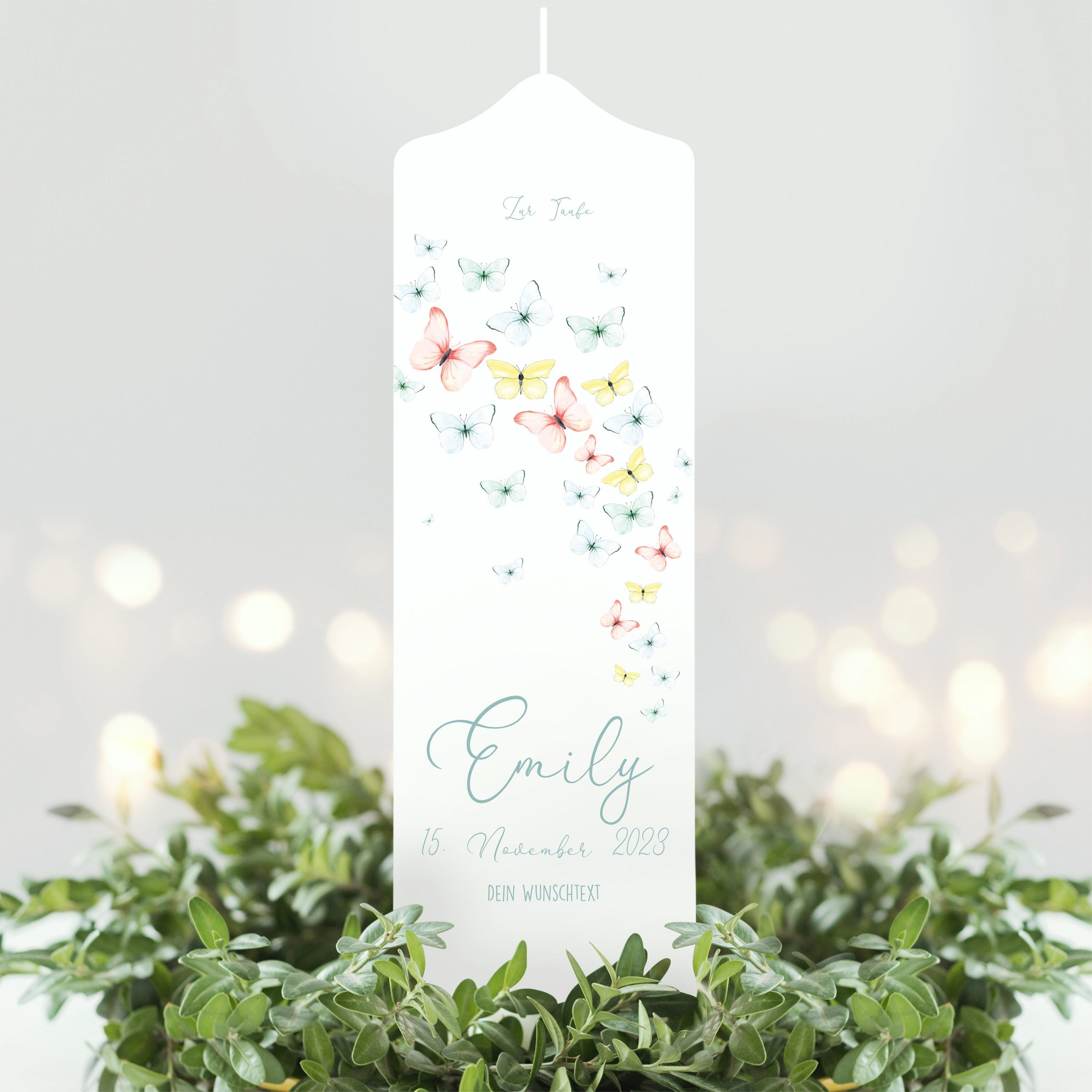 weiße Taufkerze Kerze zur Taufe oder Geburt mit Schmetterlingen mit Name Datum Taufspruch