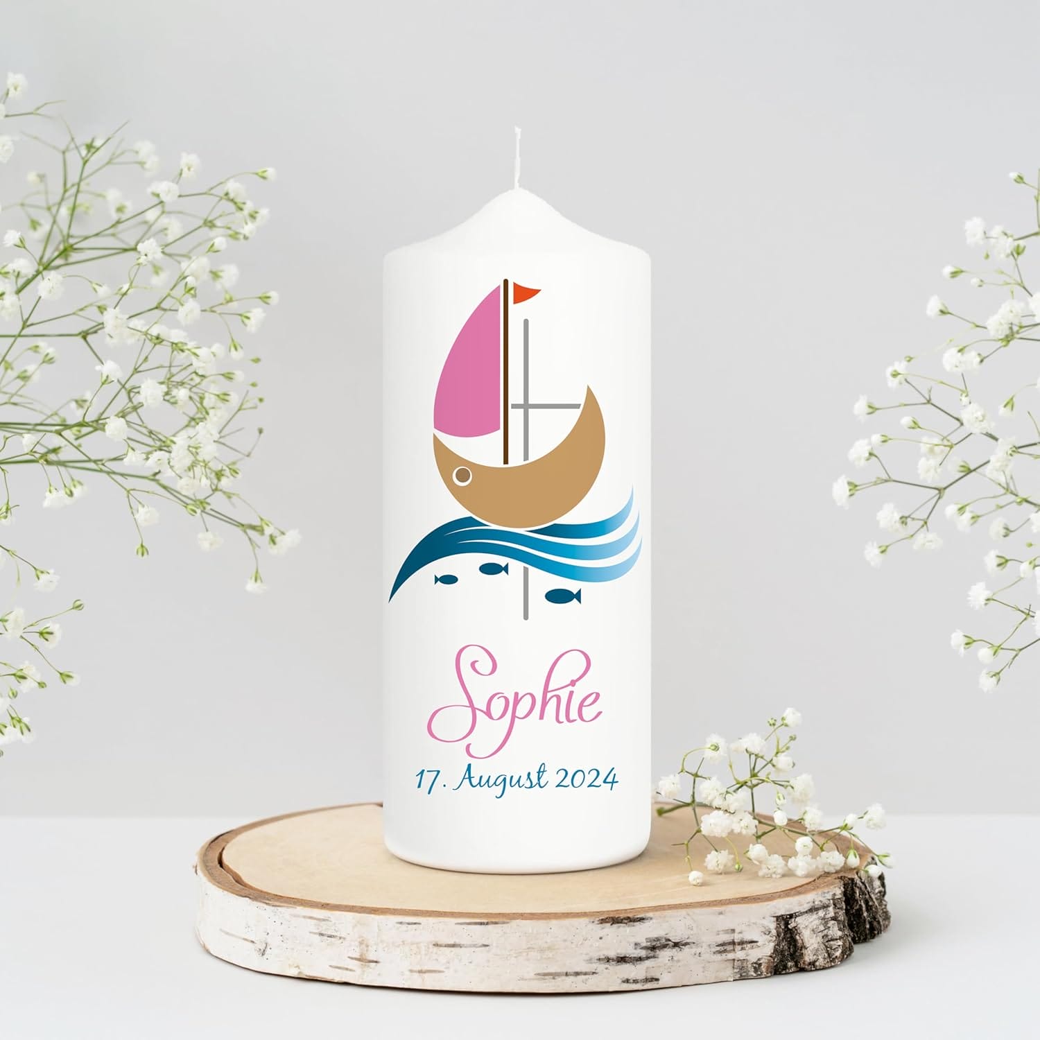 Taufkerze bedruckt Boot Jesuskreuz Junge Mädchen personalisiert mit Namen Datum Taufspruch Geschenk Kerze zur Taufe