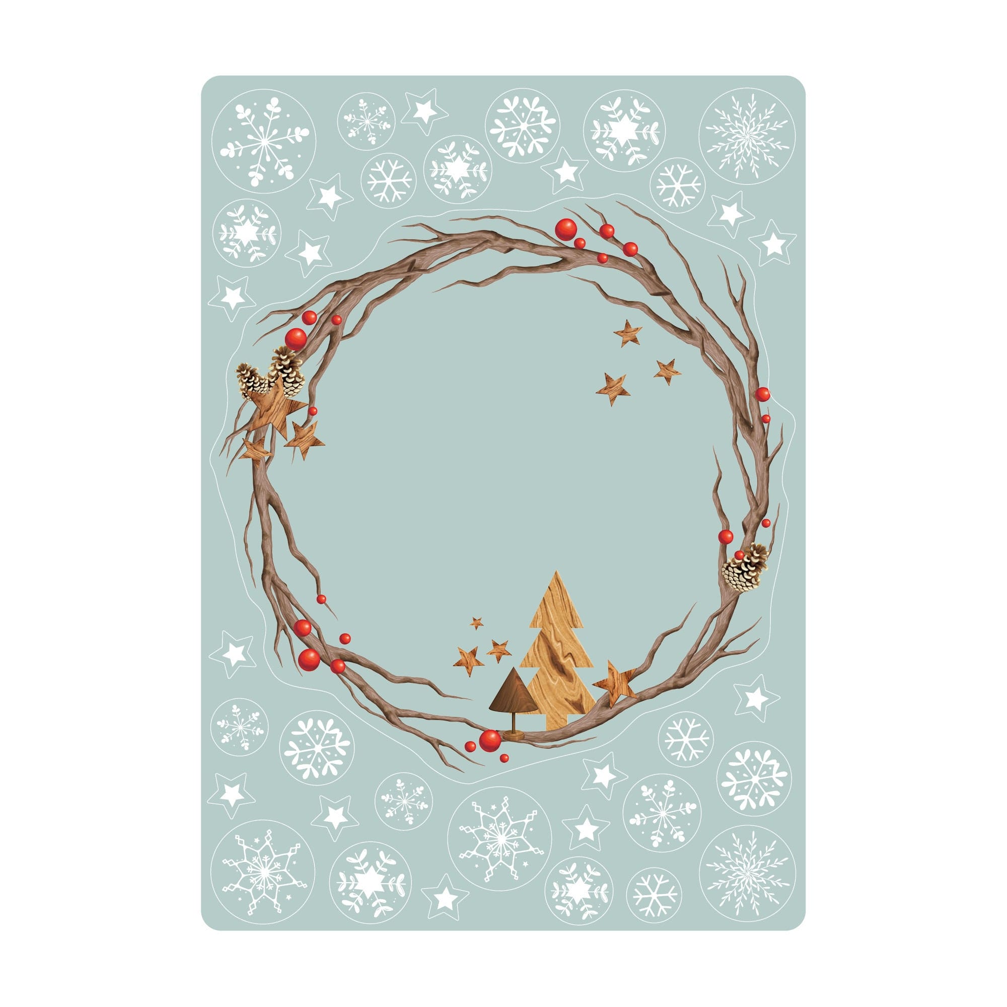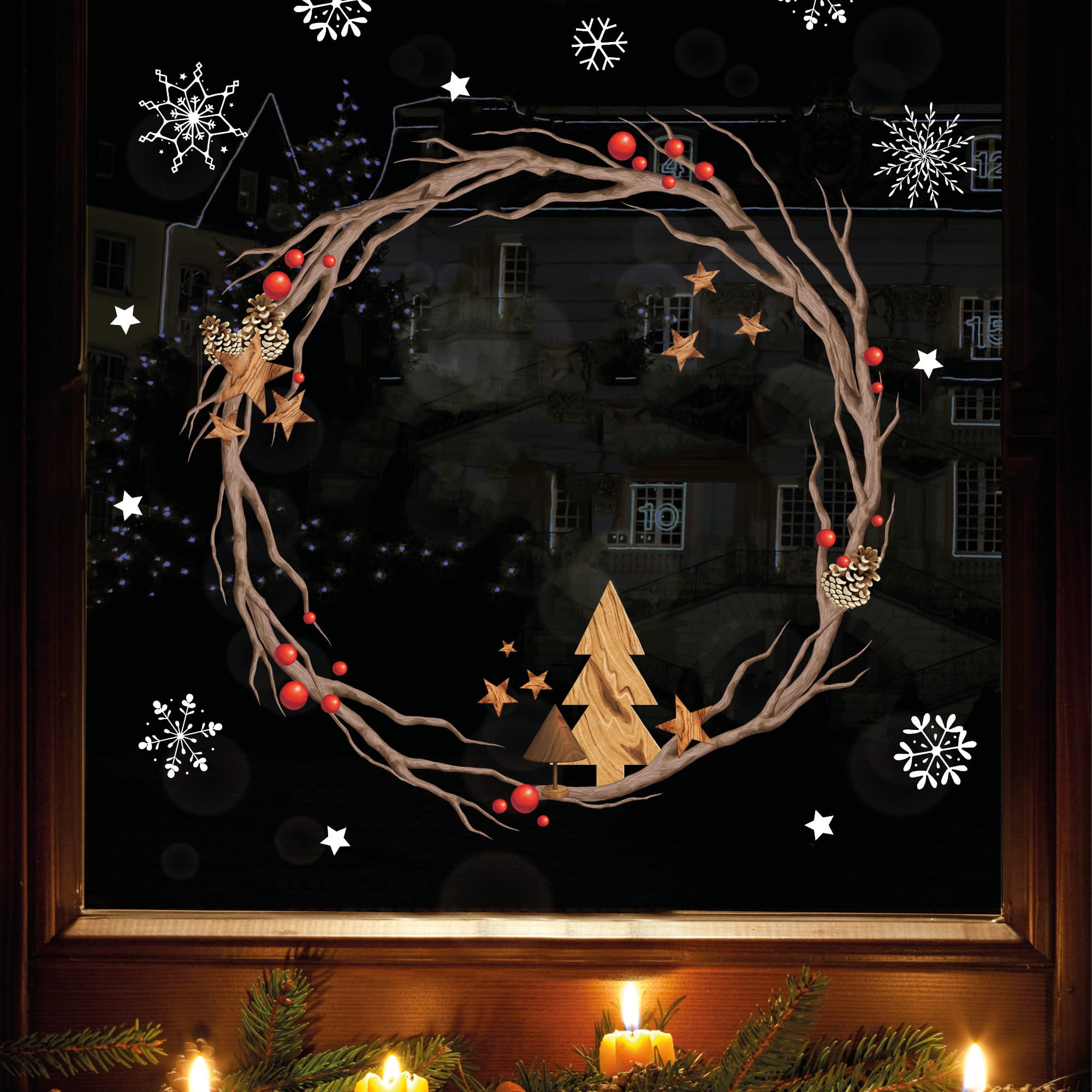 Wiederverwenbares Fensterbild Weihnachten Kranz aus Zweigen Haus Sterne Holzoptik